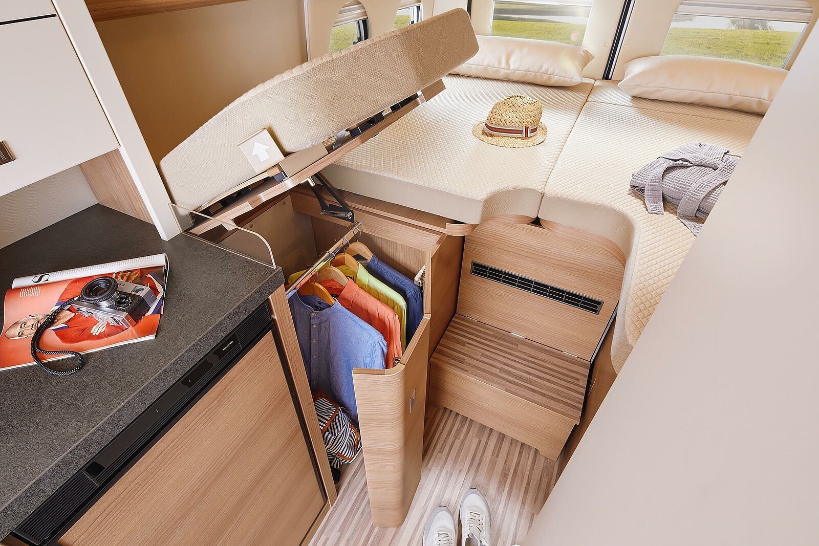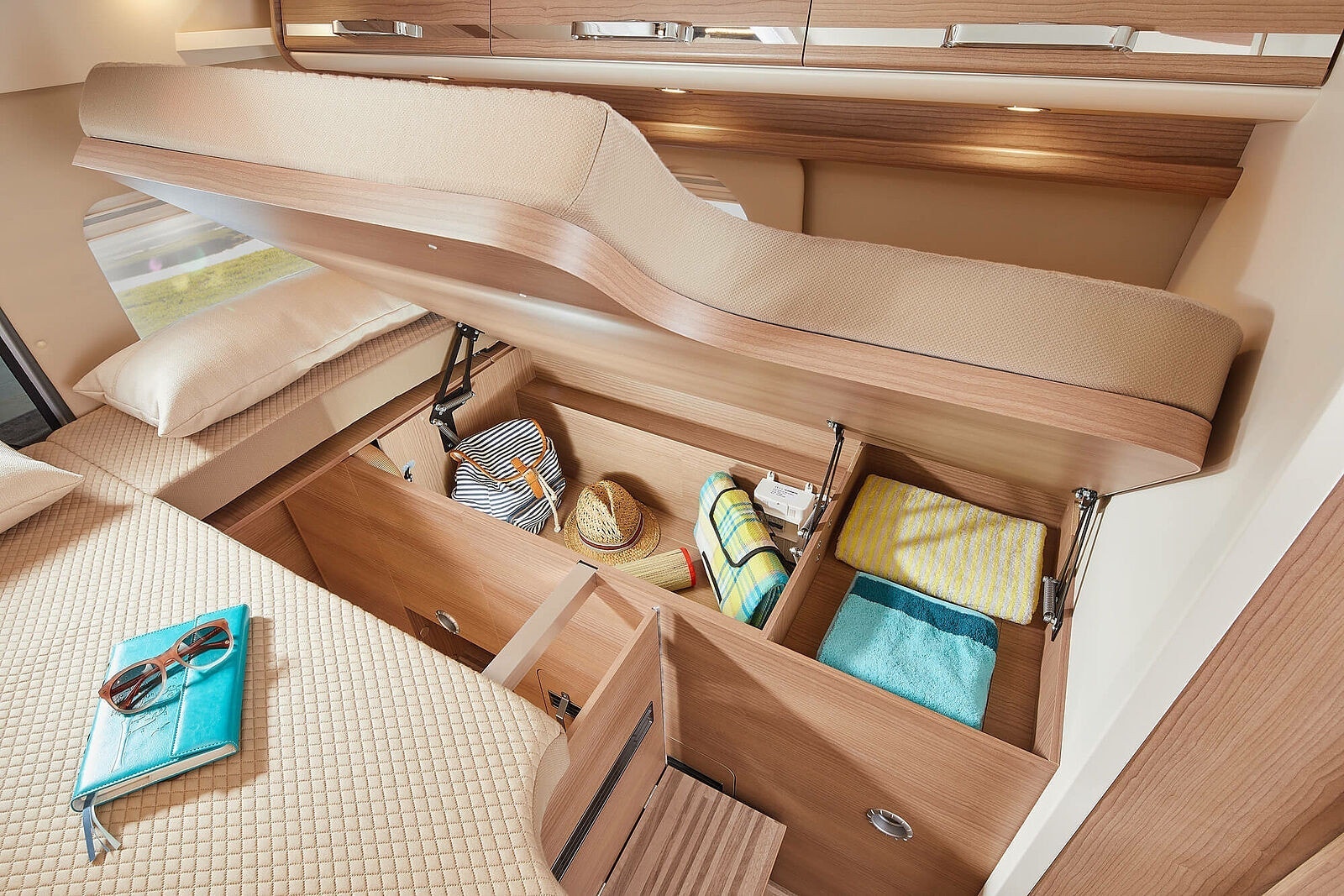 Denne modellen har to langsgående enkeltsenger med to store overskap på siden. Du kommer smidig til sengen ved å bruke den uttrekkbare trappen. Trappen har også oppbevaringsplass. Her kan du sove godt på en underluftet sengebunn og komfortabel madrass på over 200cm i lengden.