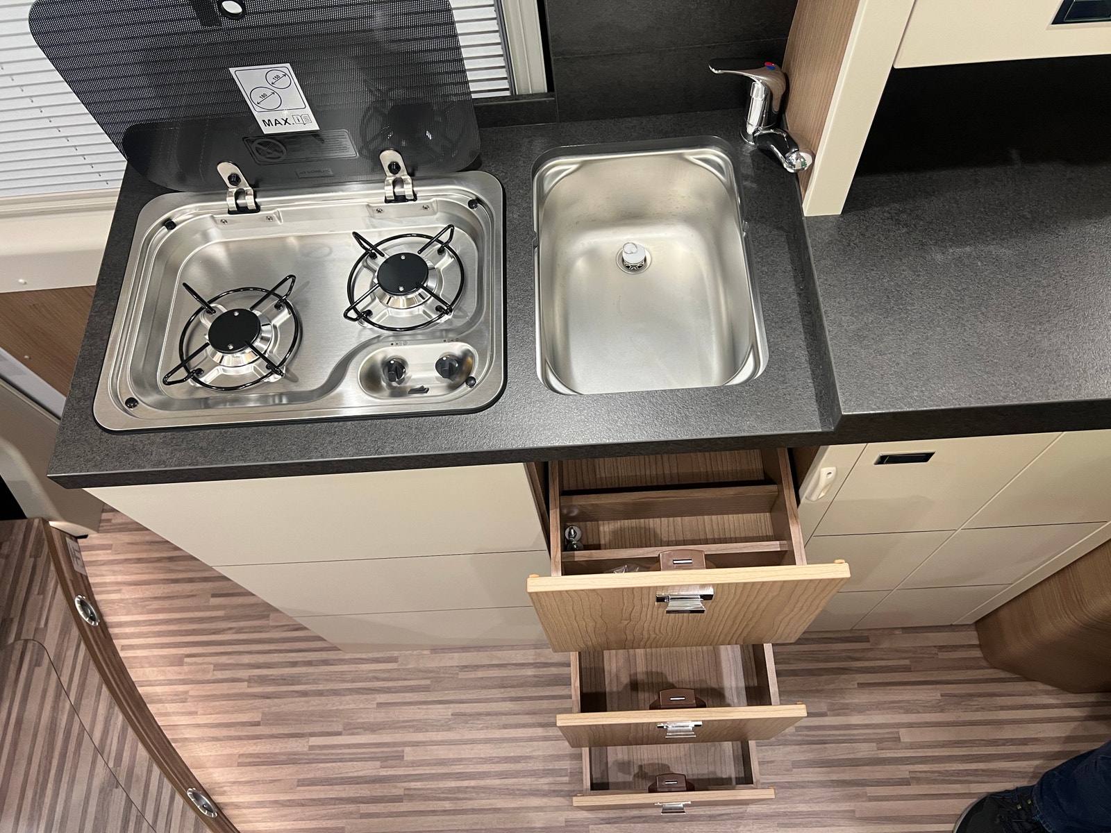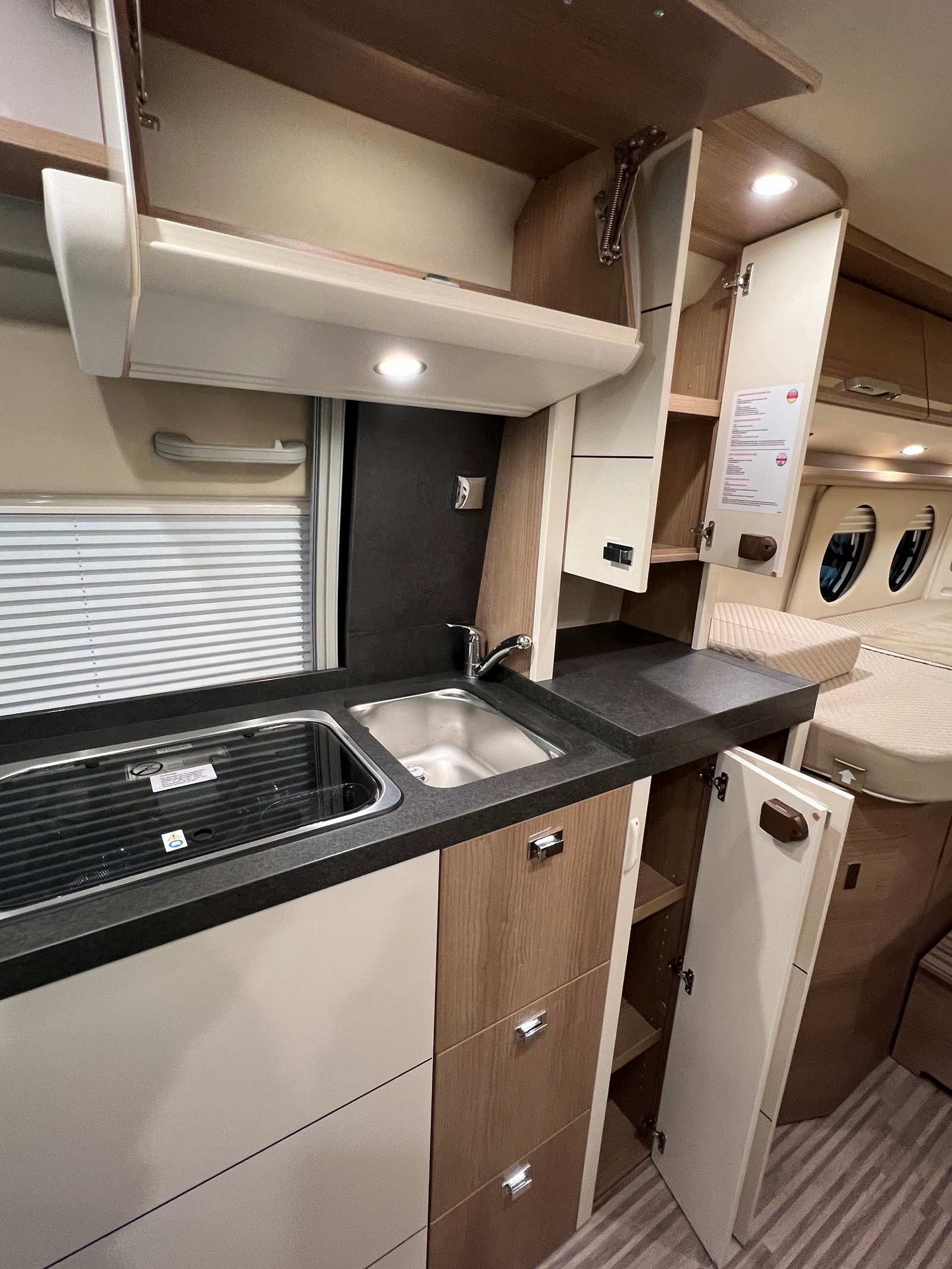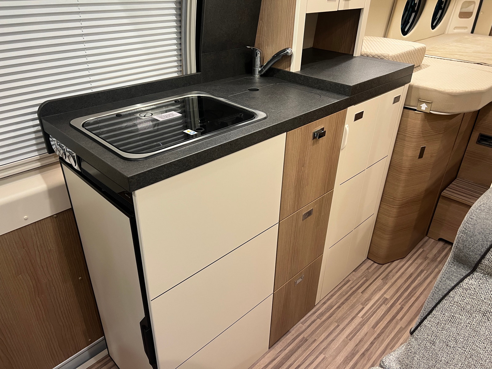 Stor kjøkkenbenk og to romslige kjøkkenskuffer med demping samt ett lite skap. Romselig kompressor kjøleskap. Det er gode muligheter for lagring under sittebenk til tørrvarer etc. Her kommer du til uten å fjerne puten, skuff som dras ut. Koketopp med elektrisk tenner og praktisk glasslokk. Dekselet over oppvaskkum.