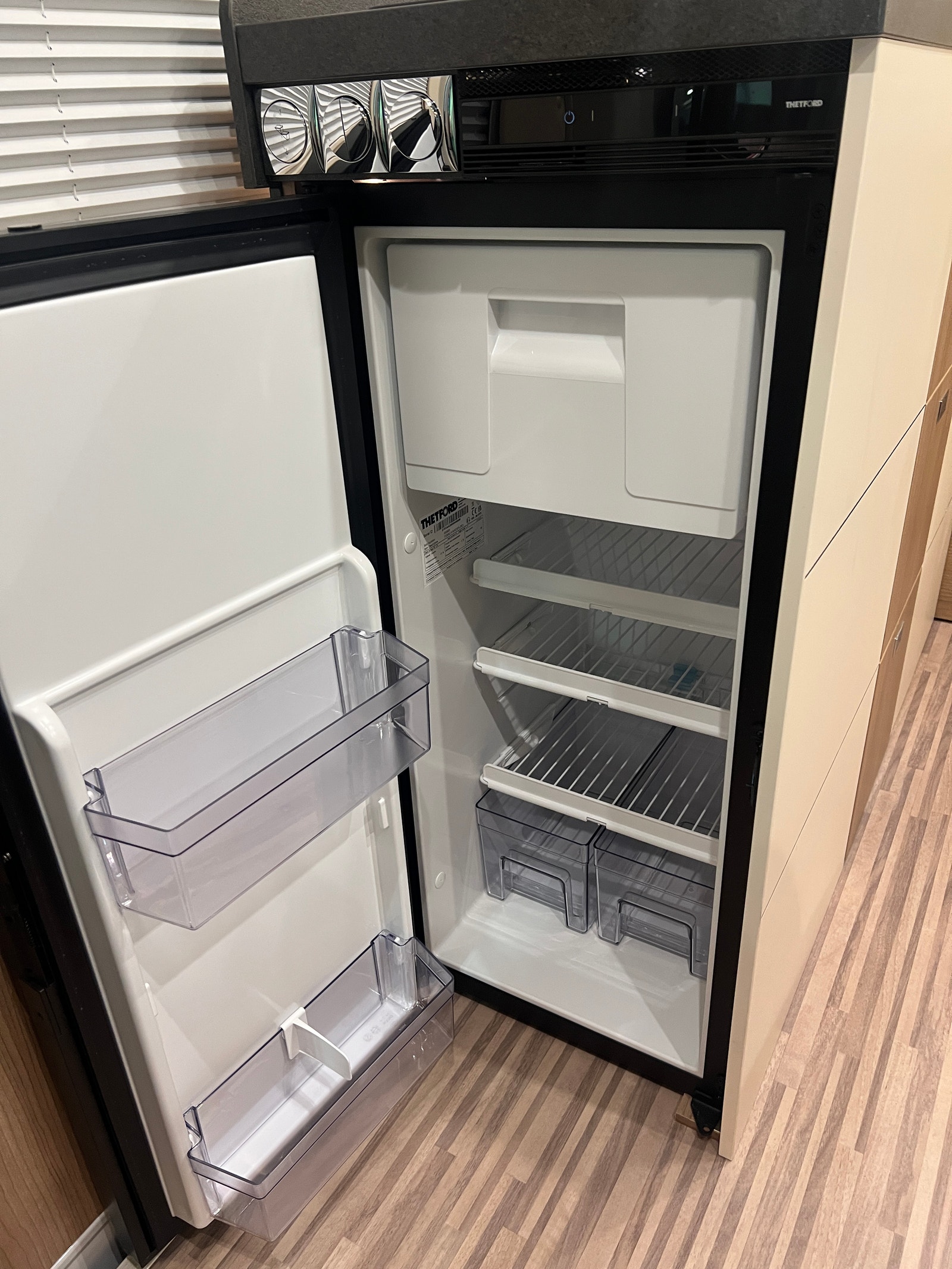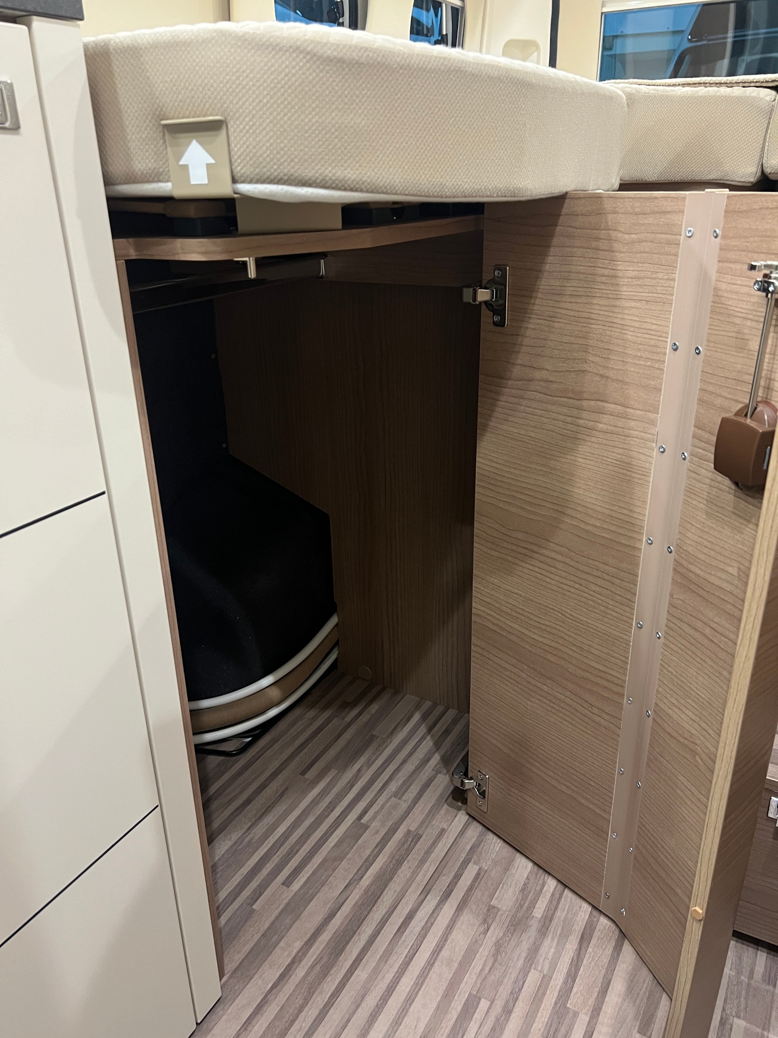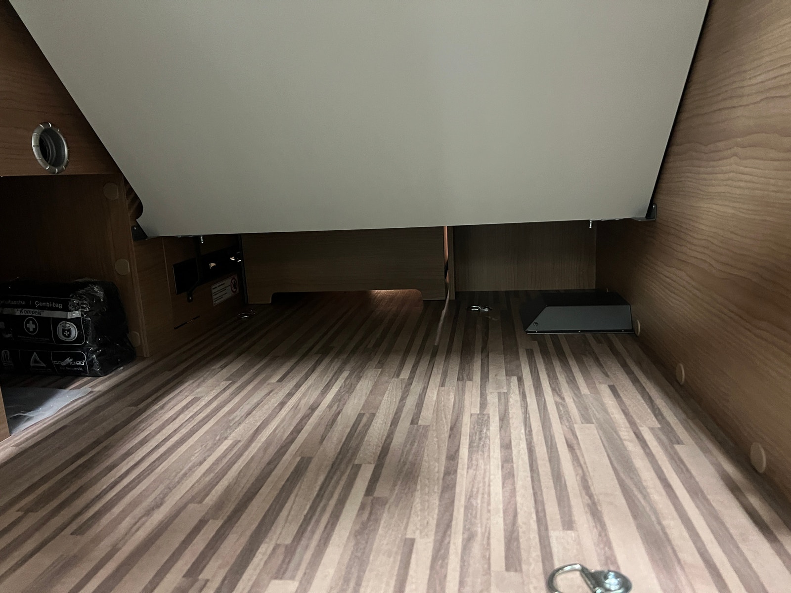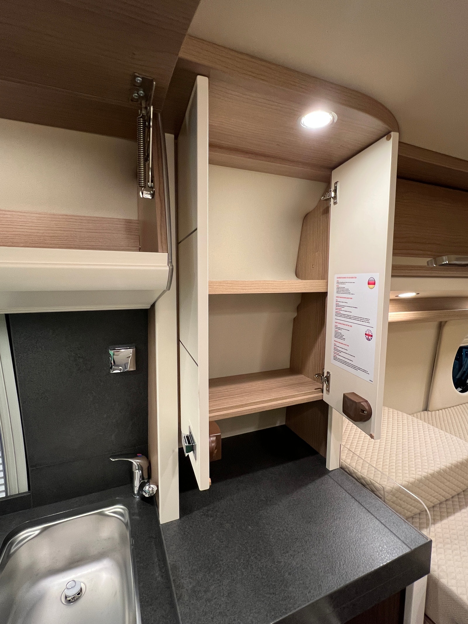 Stor kjøkkenbenk og to romslige kjøkkenskuffer med demping samt ett lite skap. Romselig kompressor kjøleskap. Det er gode muligheter for lagring under sittebenk til tørrvarer etc. Her kommer du til uten å fjerne puten, skuff som dras ut. Koketopp med elektrisk tenner og praktisk glasslokk. Dekselet over oppvaskkum.