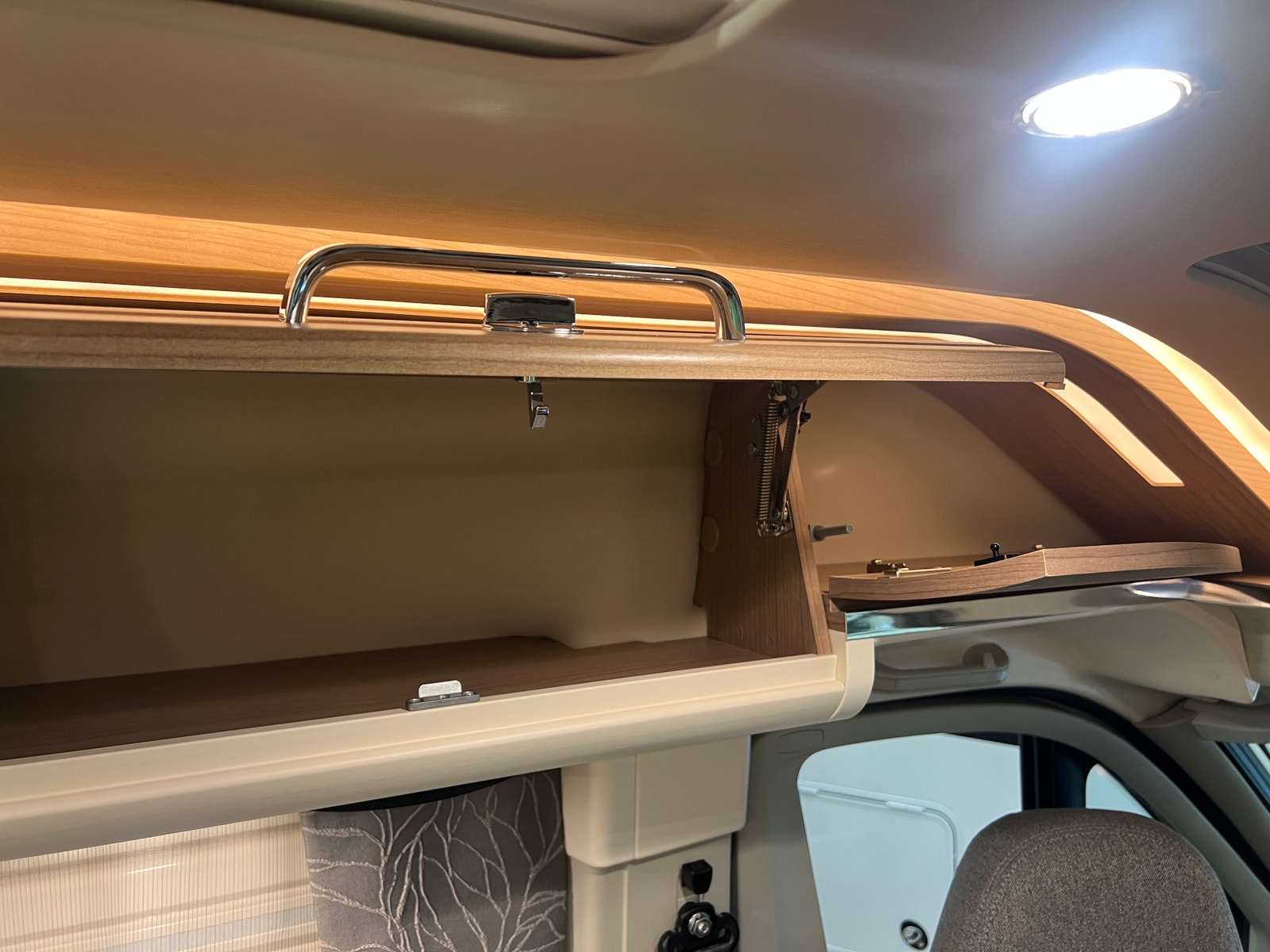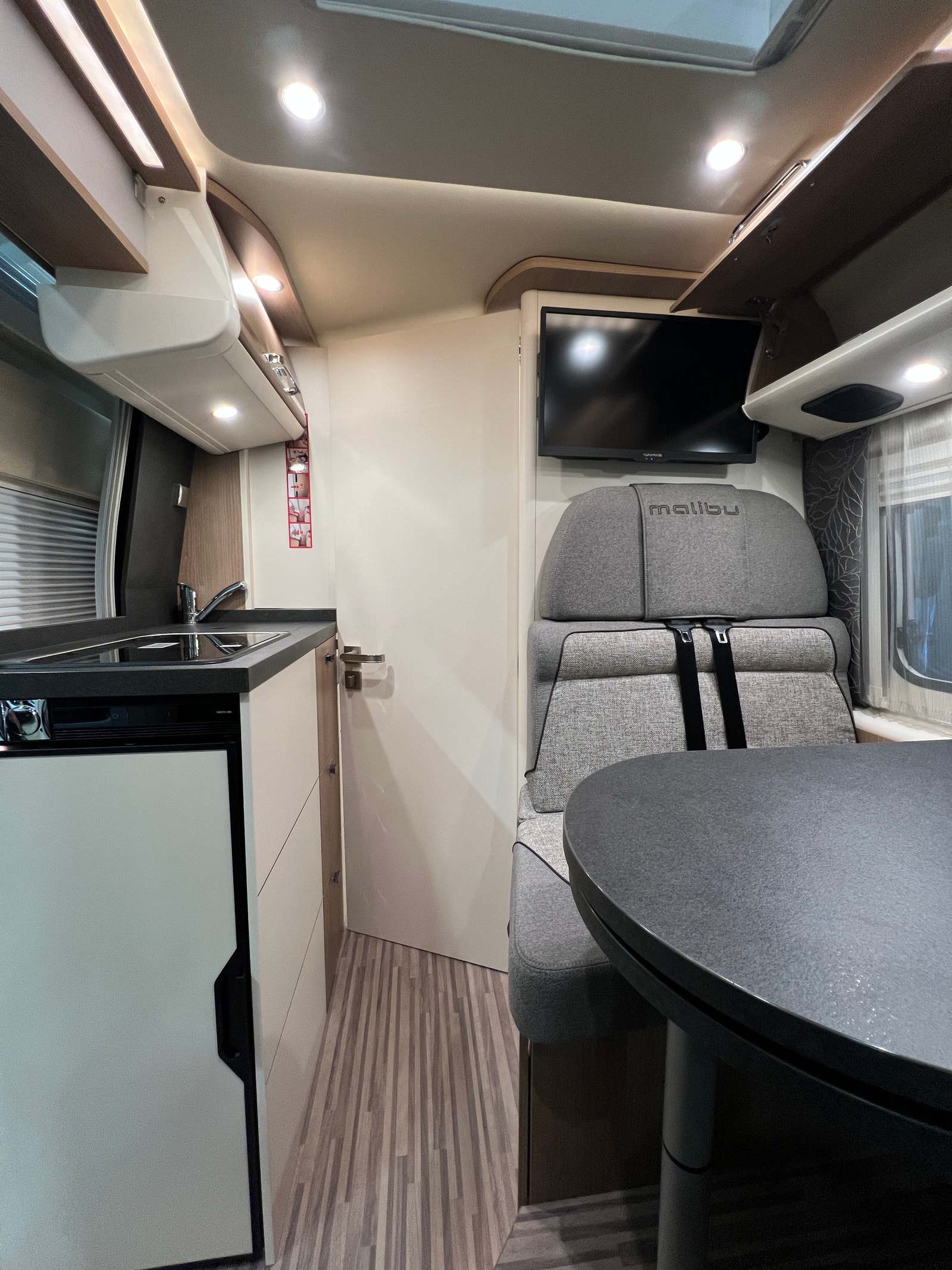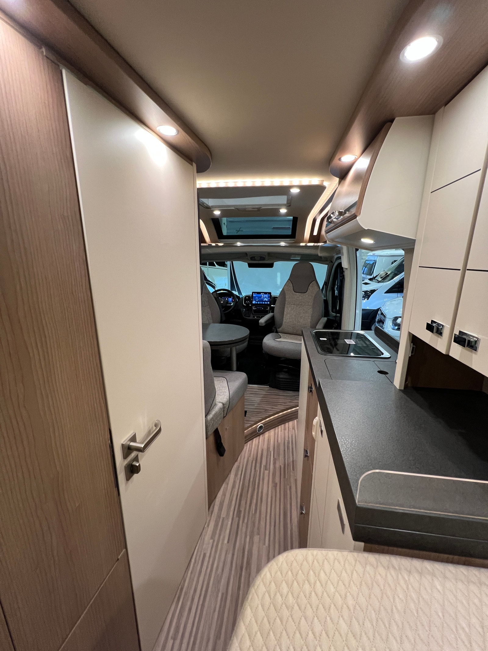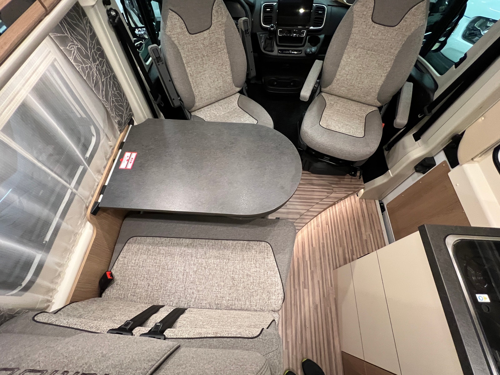 Sittegruppen oppleves som romslig. Begge setene i førerhuset er svingbare. Bordet kan utvides etter behov. Bilen er oppgradert med LED – belysning både på fører og passasjerside og langs dobbeltgulv ved sittegruppen. Med sin utvidet innvendig høyde i førerhus og bodel får du en helt ny rom- og kjørefølelse.