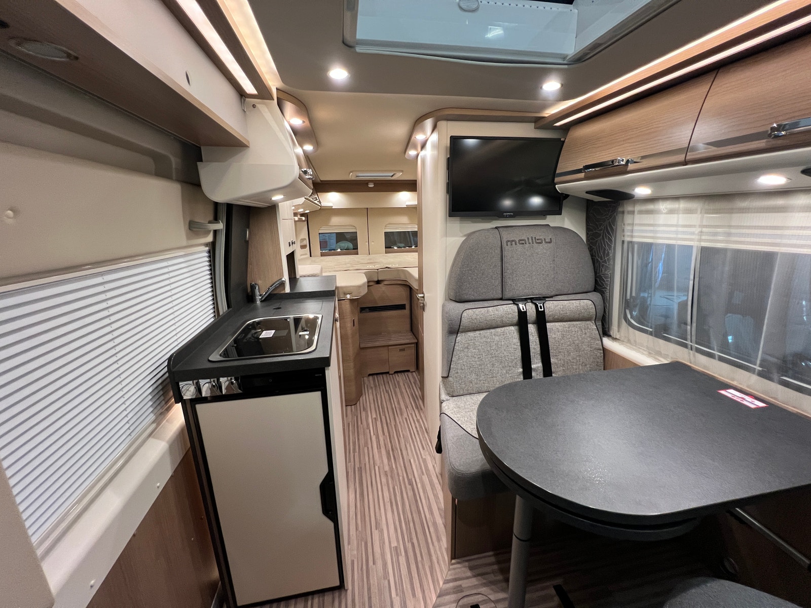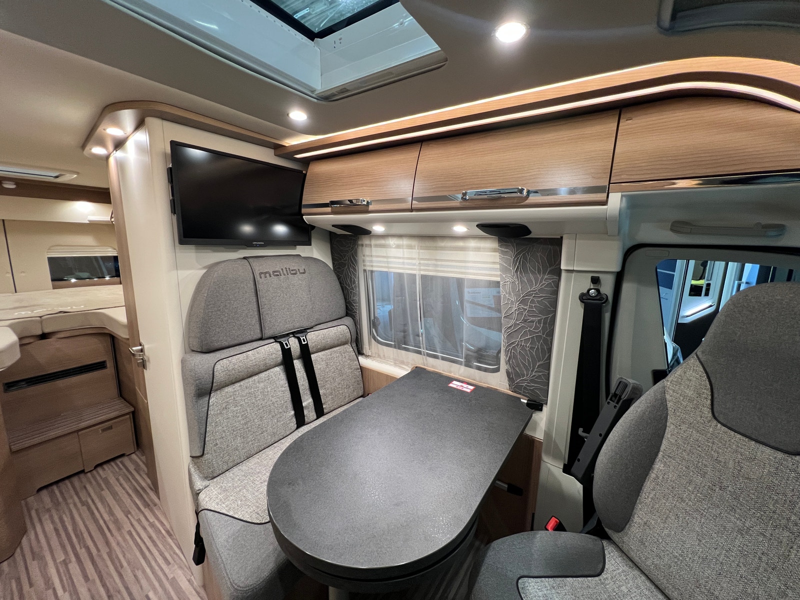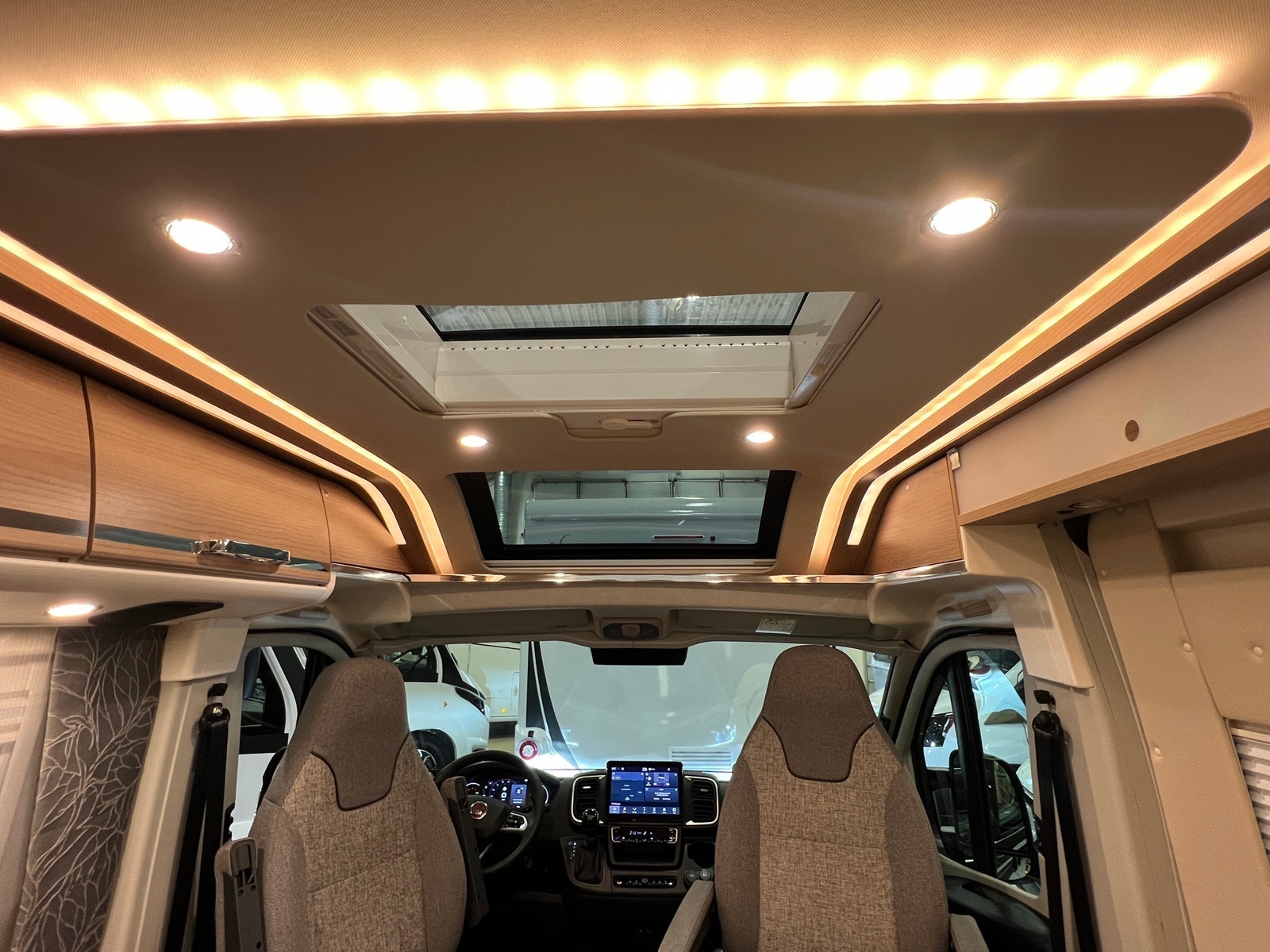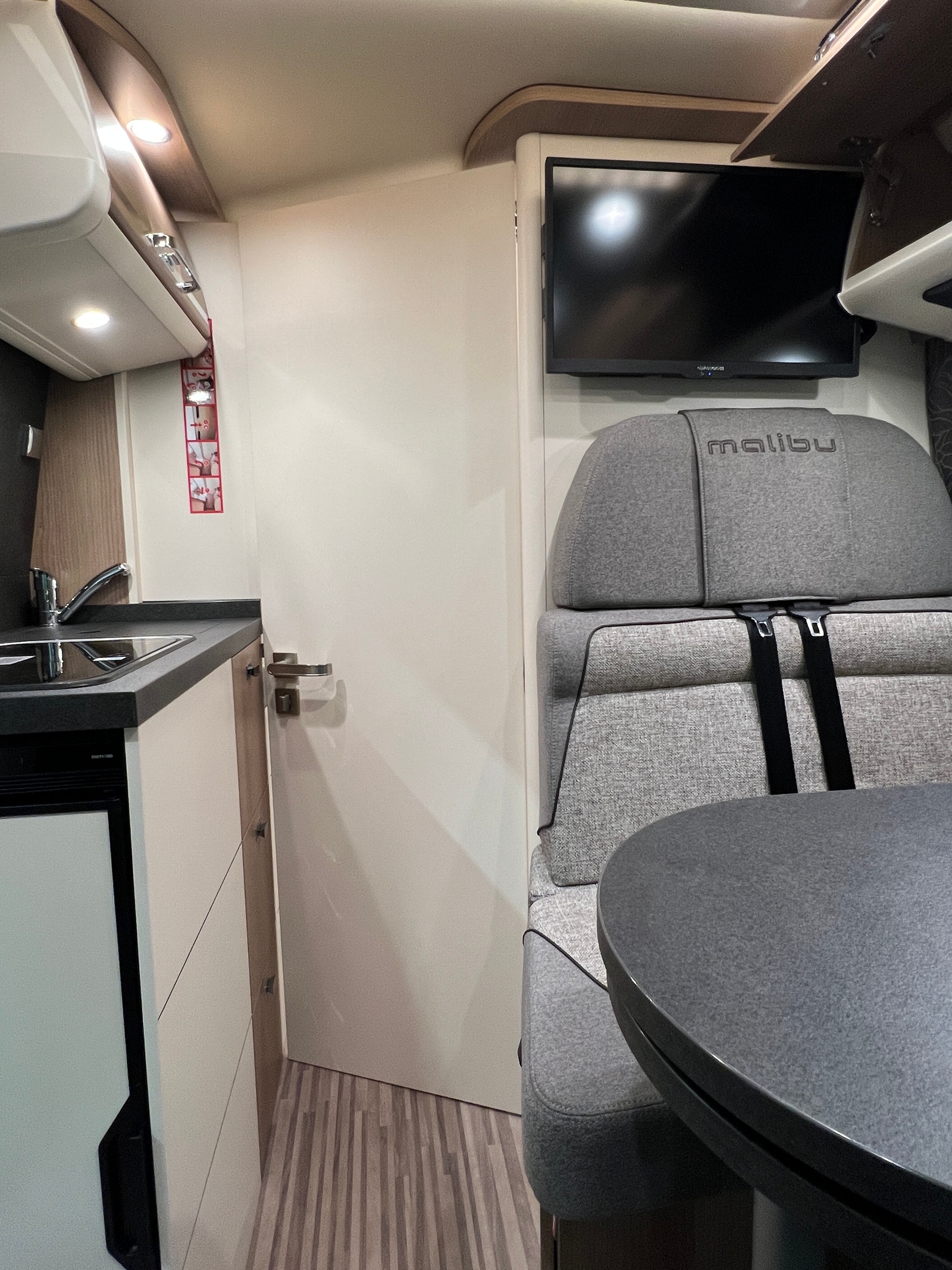 Sittegruppen oppleves som romslig. Begge setene i førerhuset er svingbare. Bordet kan utvides etter behov. Bilen er oppgradert med LED – belysning både på fører og passasjerside og langs dobbeltgulv ved sittegruppen. Med sin utvidet innvendig høyde i førerhus og bodel får du en helt ny rom- og kjørefølelse.