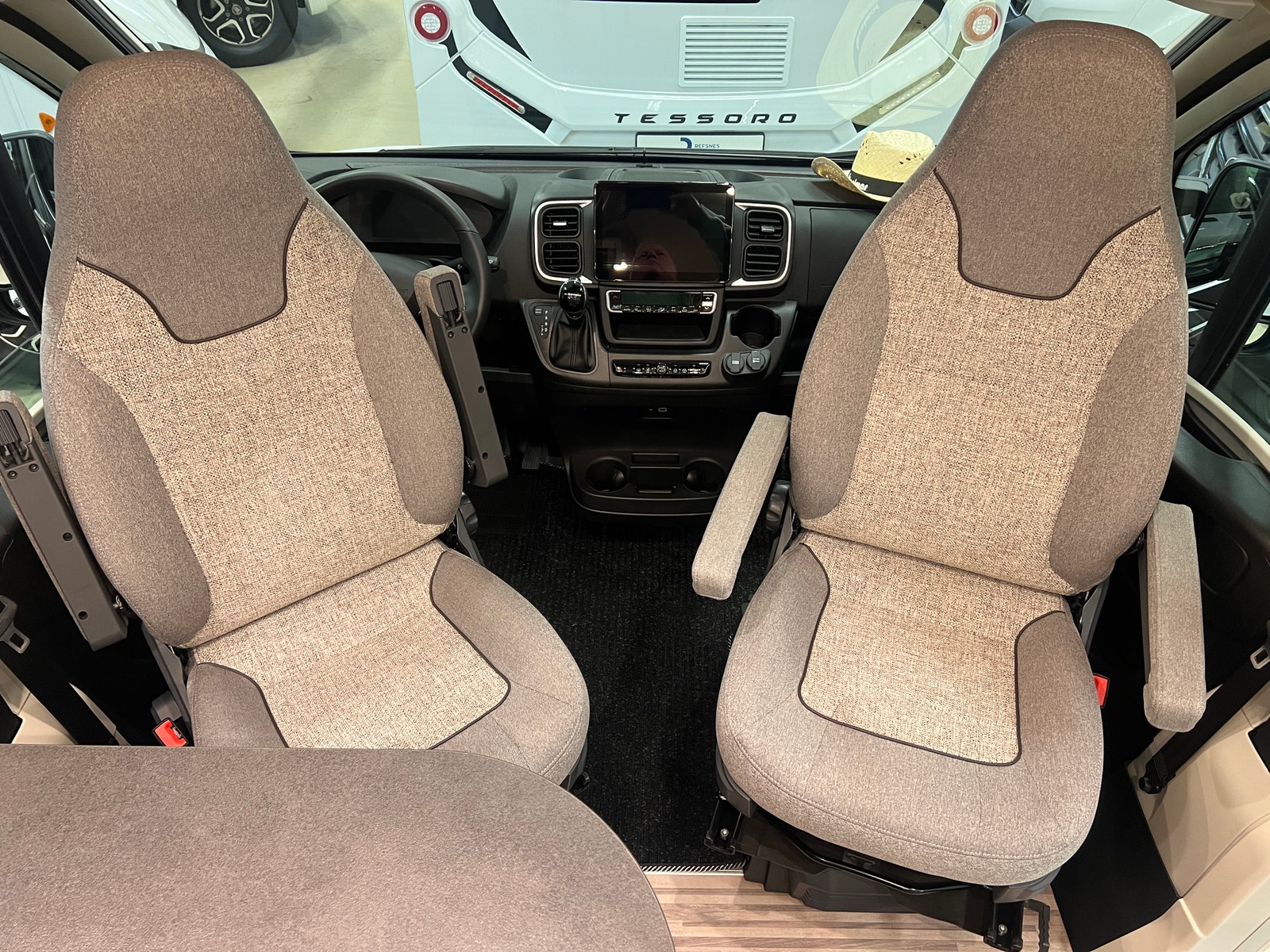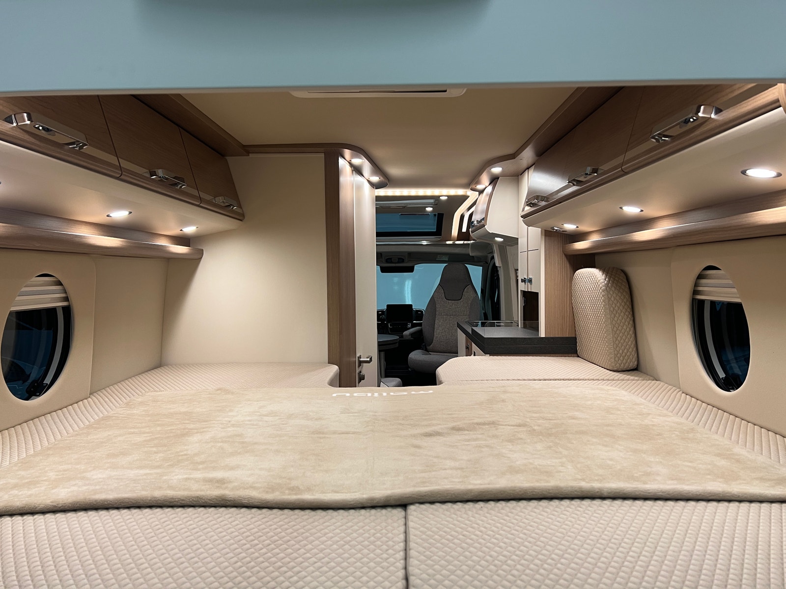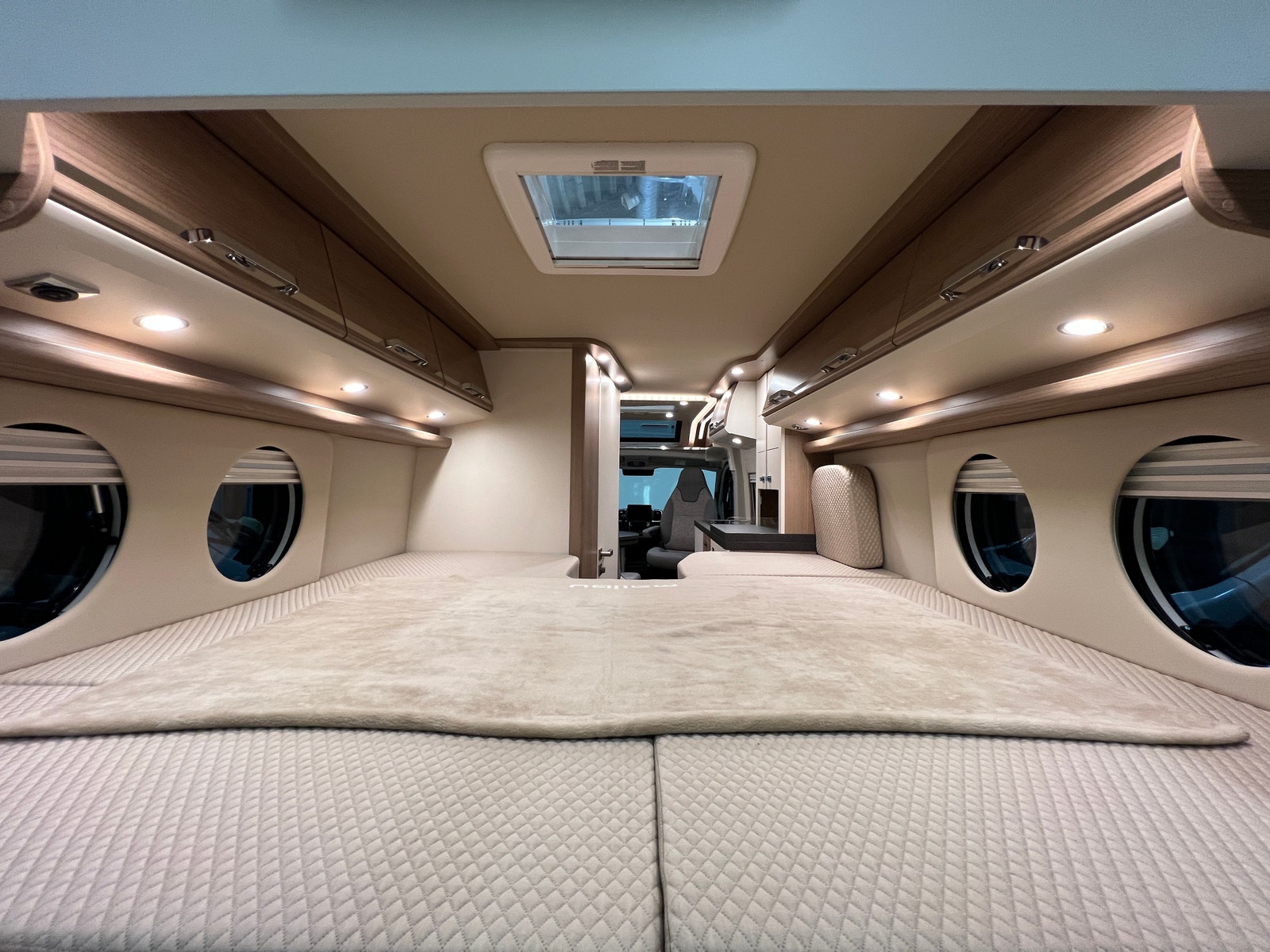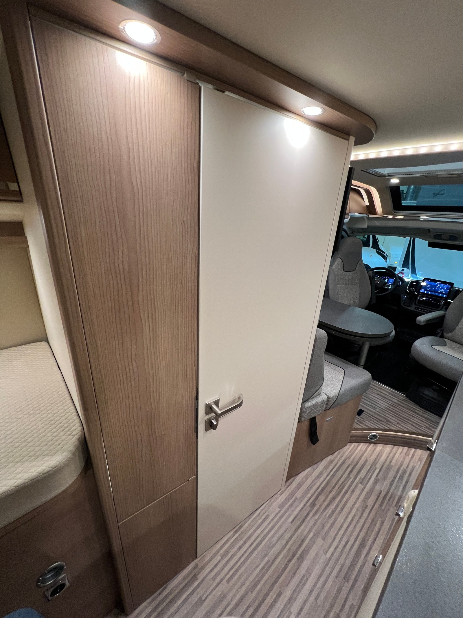 Sittegruppen oppleves som romslig. Begge setene i førerhuset er svingbare. Bordet kan utvides etter behov. Bilen er oppgradert med LED – belysning både på fører og passasjerside og langs dobbeltgulv ved sittegruppen. Med sin utvidet innvendig høyde i førerhus og bodel får du en helt ny rom- og kjørefølelse.