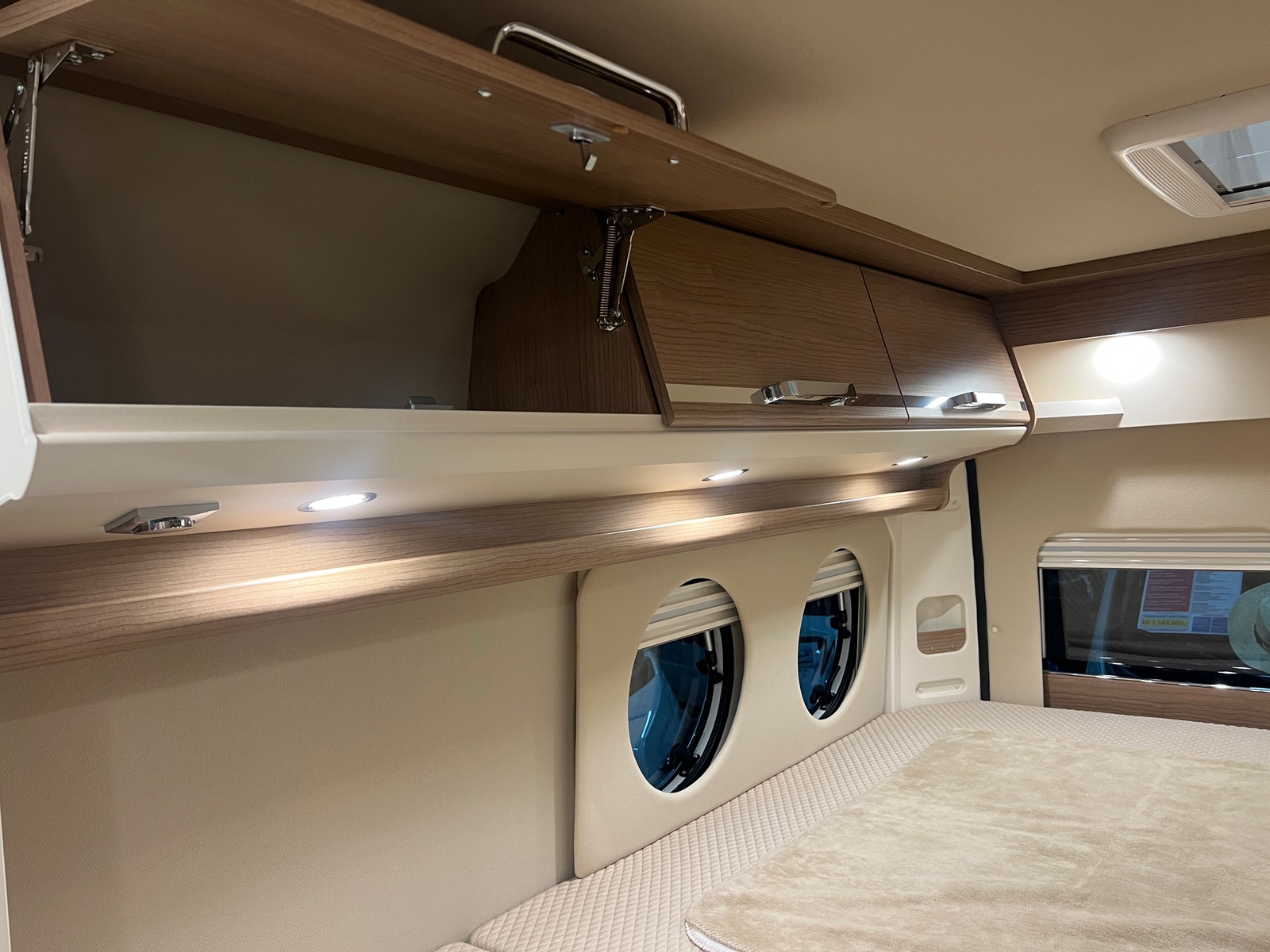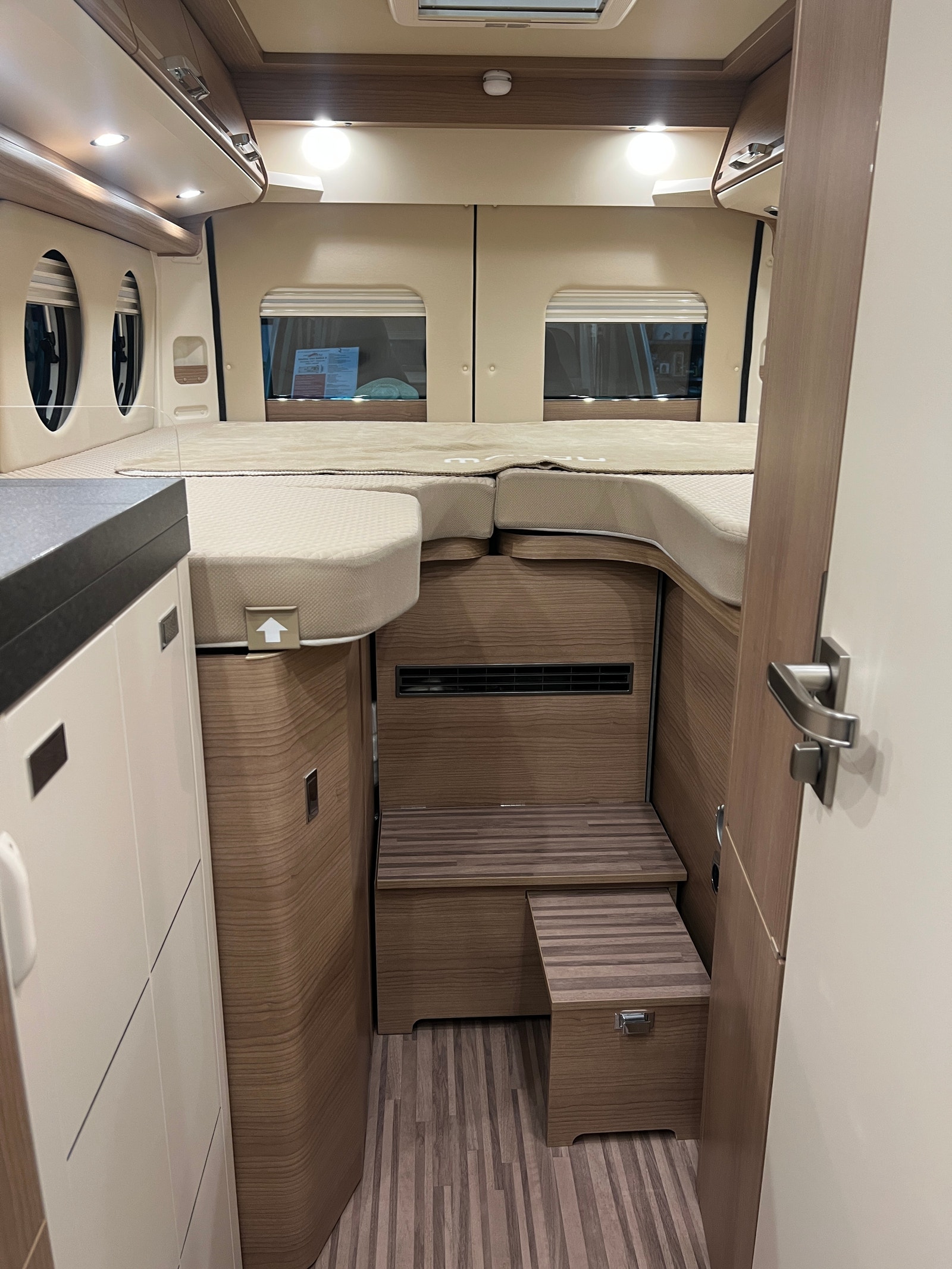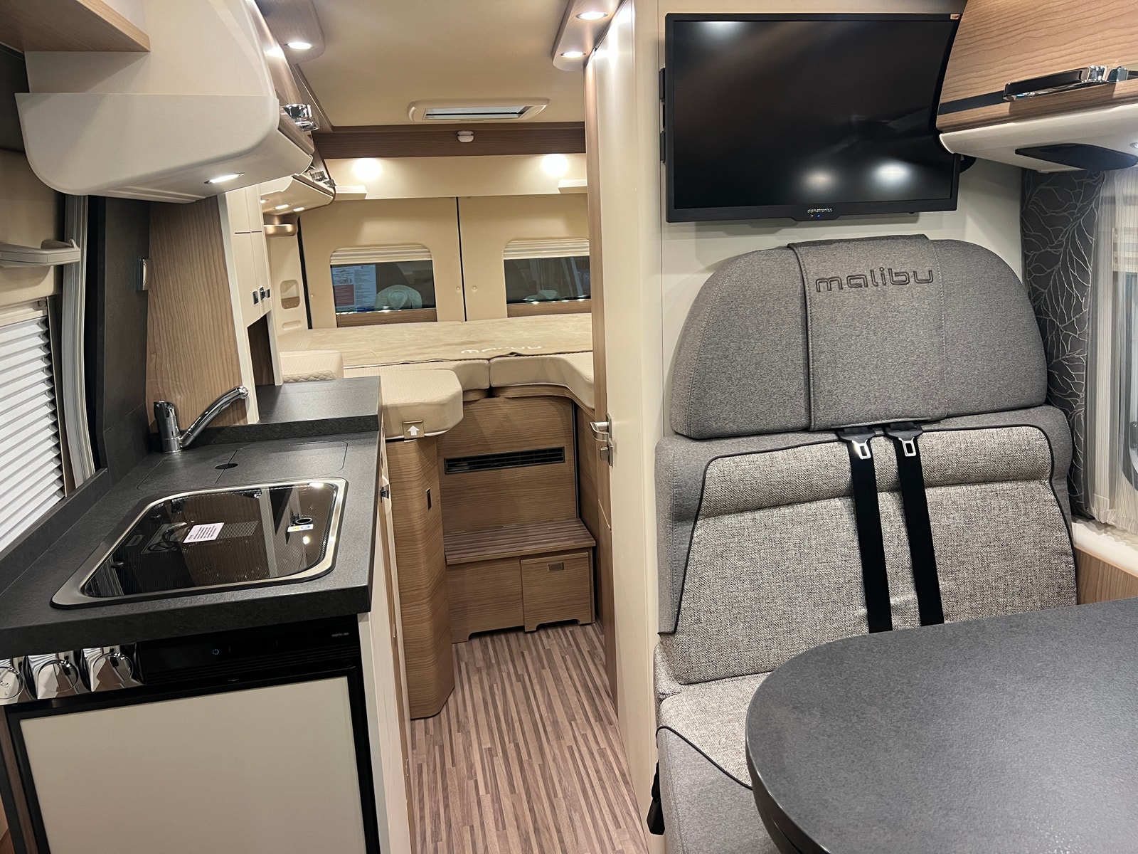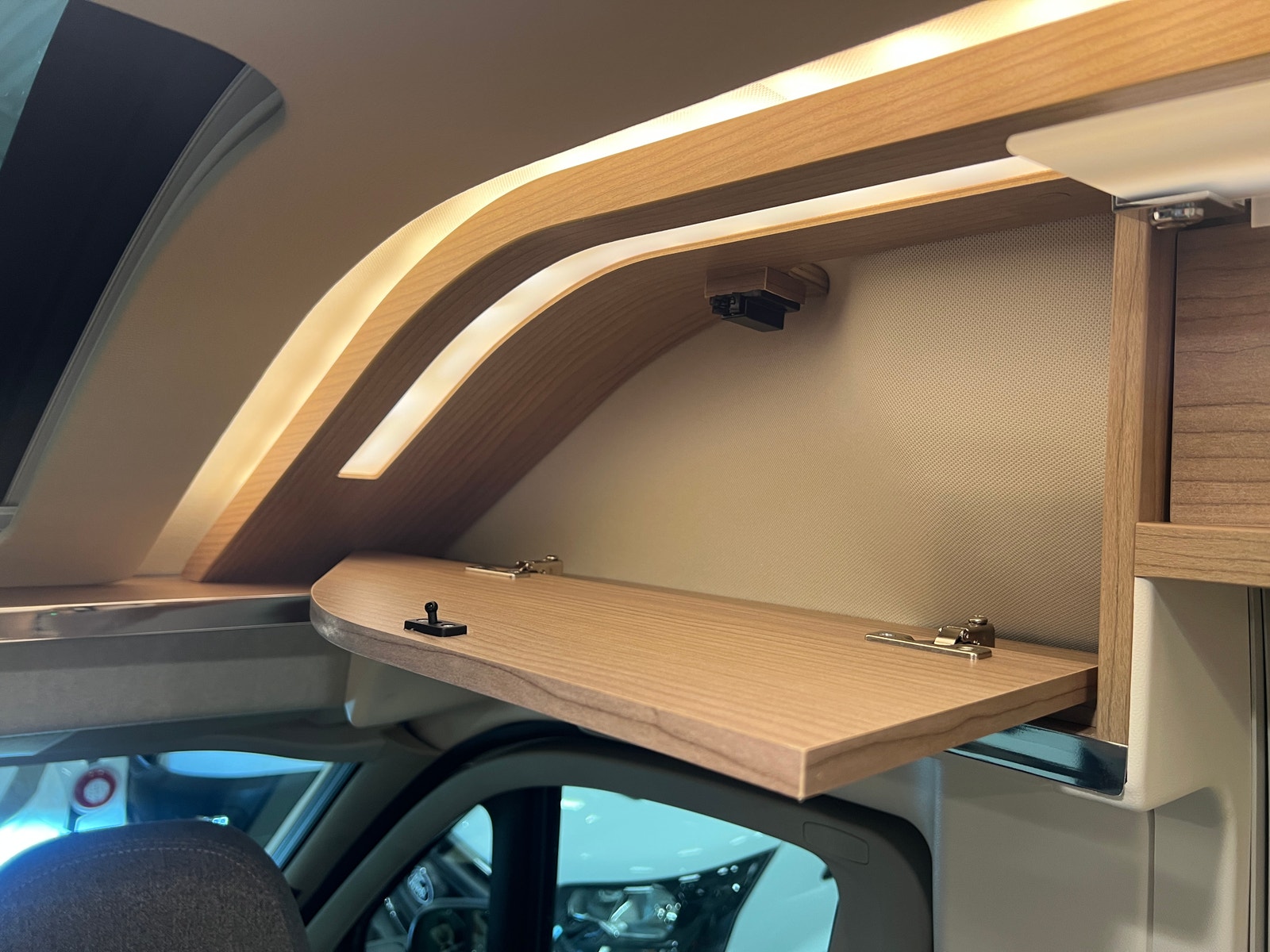 Sittegruppen oppleves som romslig. Begge setene i førerhuset er svingbare. Bordet kan utvides etter behov. Bilen er oppgradert med LED – belysning både på fører og passasjerside og langs dobbeltgulv ved sittegruppen. Med sin utvidet innvendig høyde i førerhus og bodel får du en helt ny rom- og kjørefølelse.