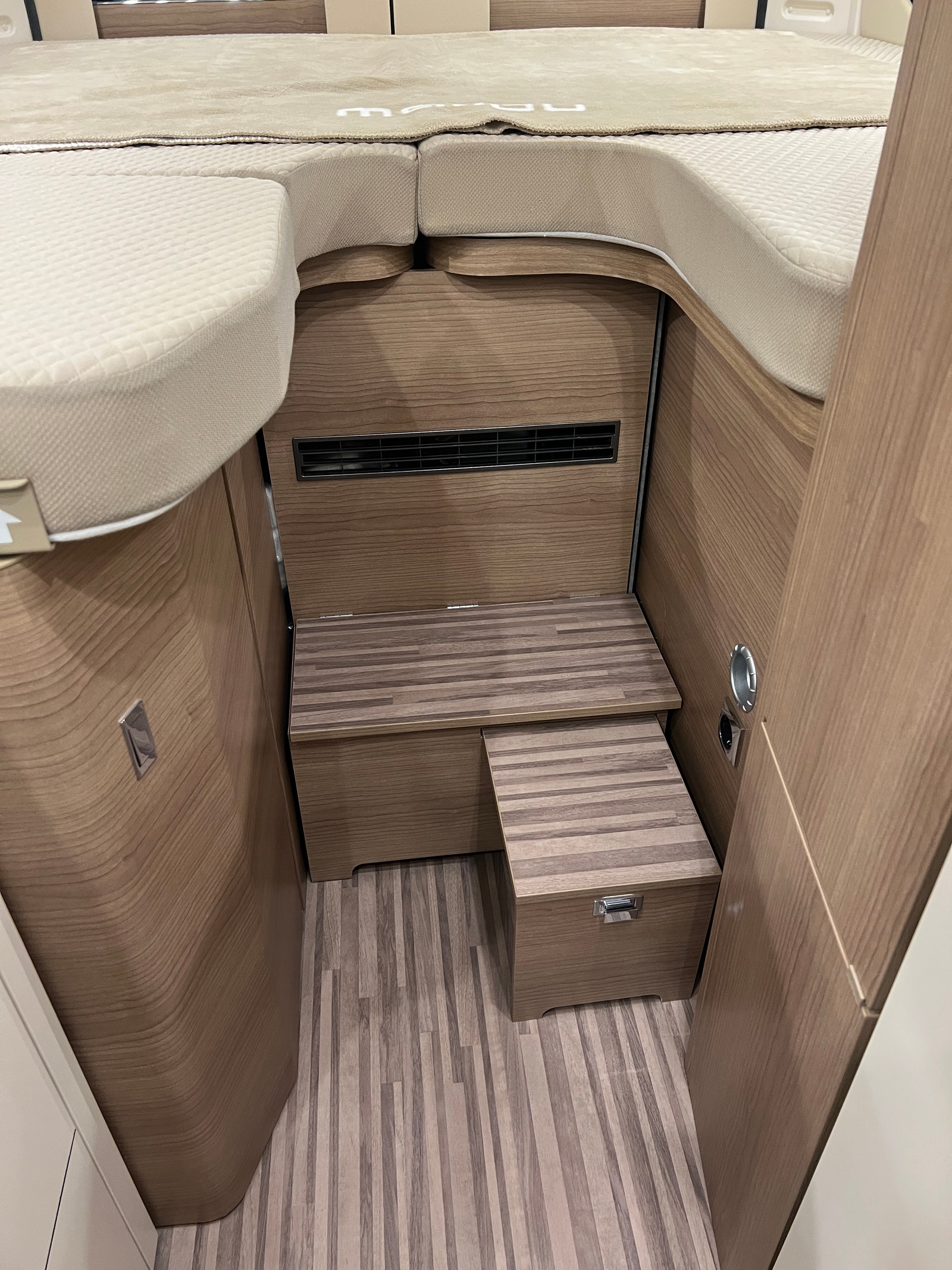 Denne modellen har to langsgående enkeltsenger med to store overskap på siden. Du kommer smidig til sengen ved å bruke den uttrekkbare trappen. Trappen har også oppbevaringsplass. Her kan du sove godt på en underluftet sengebunn og komfortabel madrass på over 200cm i lengden.