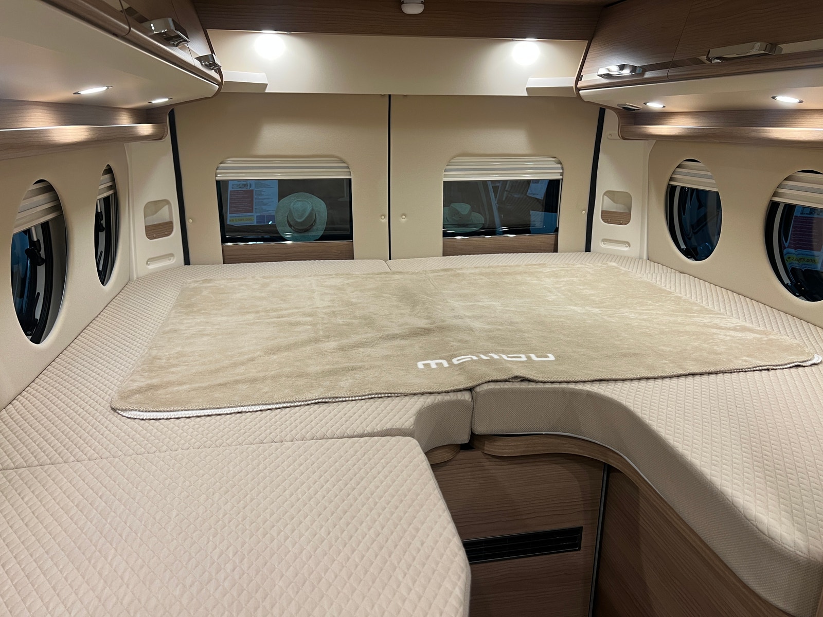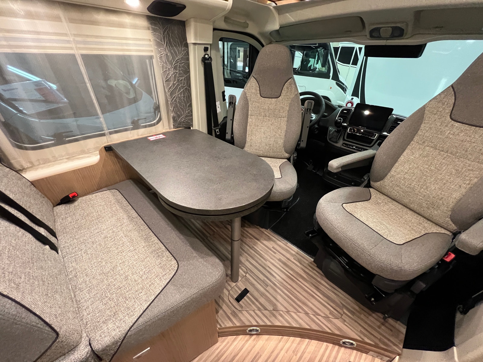 Sittegruppen oppleves som romslig. Begge setene i førerhuset er svingbare. Bordet kan utvides etter behov. Bilen er oppgradert med LED – belysning både på fører og passasjerside og langs dobbeltgulv ved sittegruppen. Med sin utvidet innvendig høyde i førerhus og bodel får du en helt ny rom- og kjørefølelse.