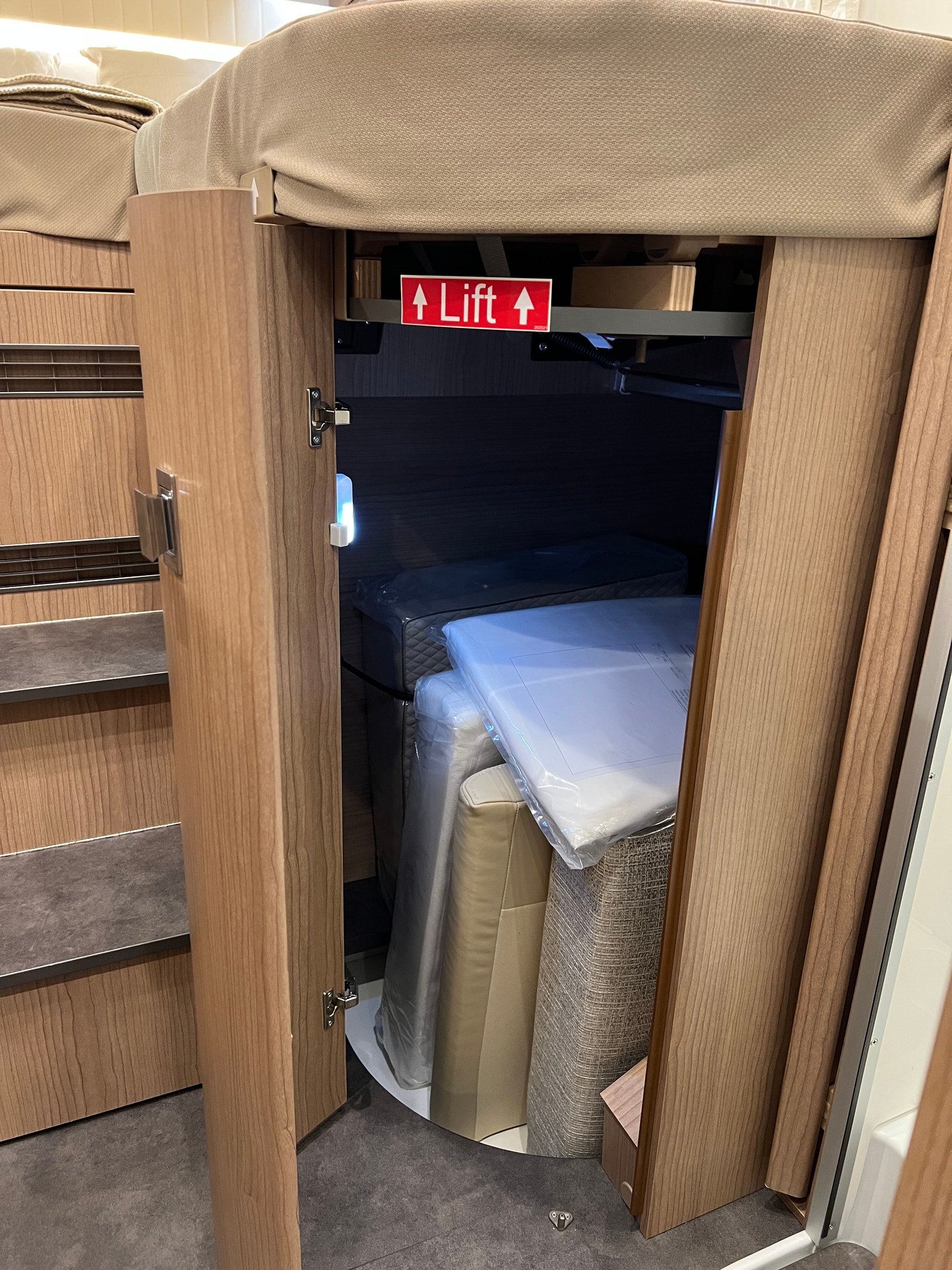 Siden dette er en helintegrert bobil trekkes senkesengen helt frem over dashbord og dekker derfor ikke sofaene ved bruk. Dette gir muligheter for å benytte salongen selv ved bruk av alle senger.