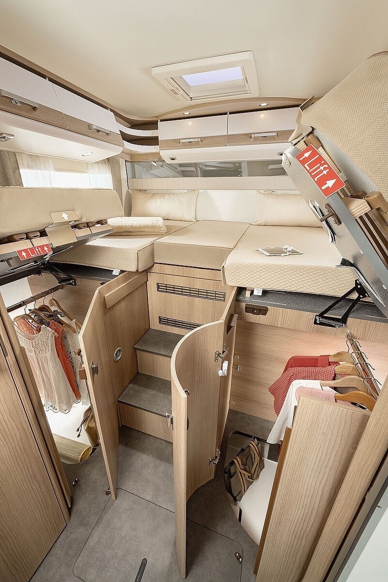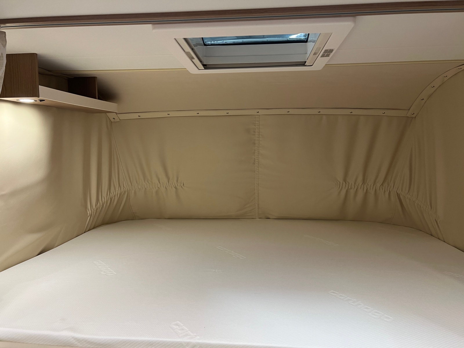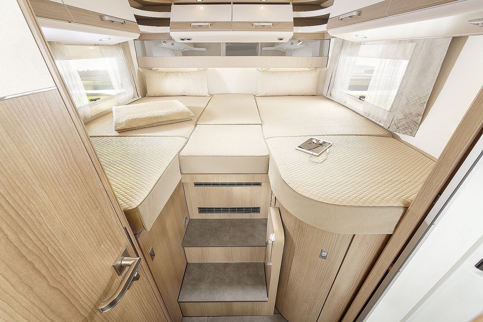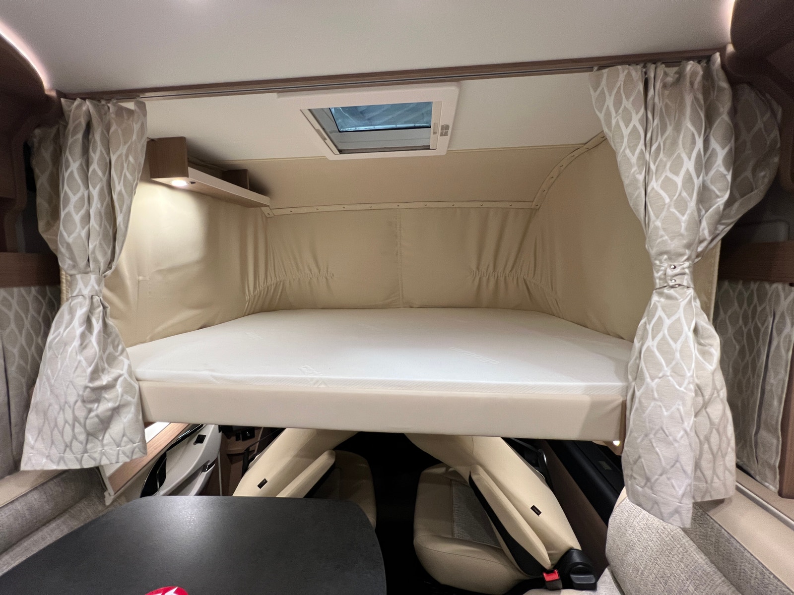 Siden dette er en helintegrert bobil trekkes senkesengen helt frem over dashbord og dekker derfor ikke sofaene ved bruk. Dette gir muligheter for å benytte salongen selv ved bruk av alle senger.