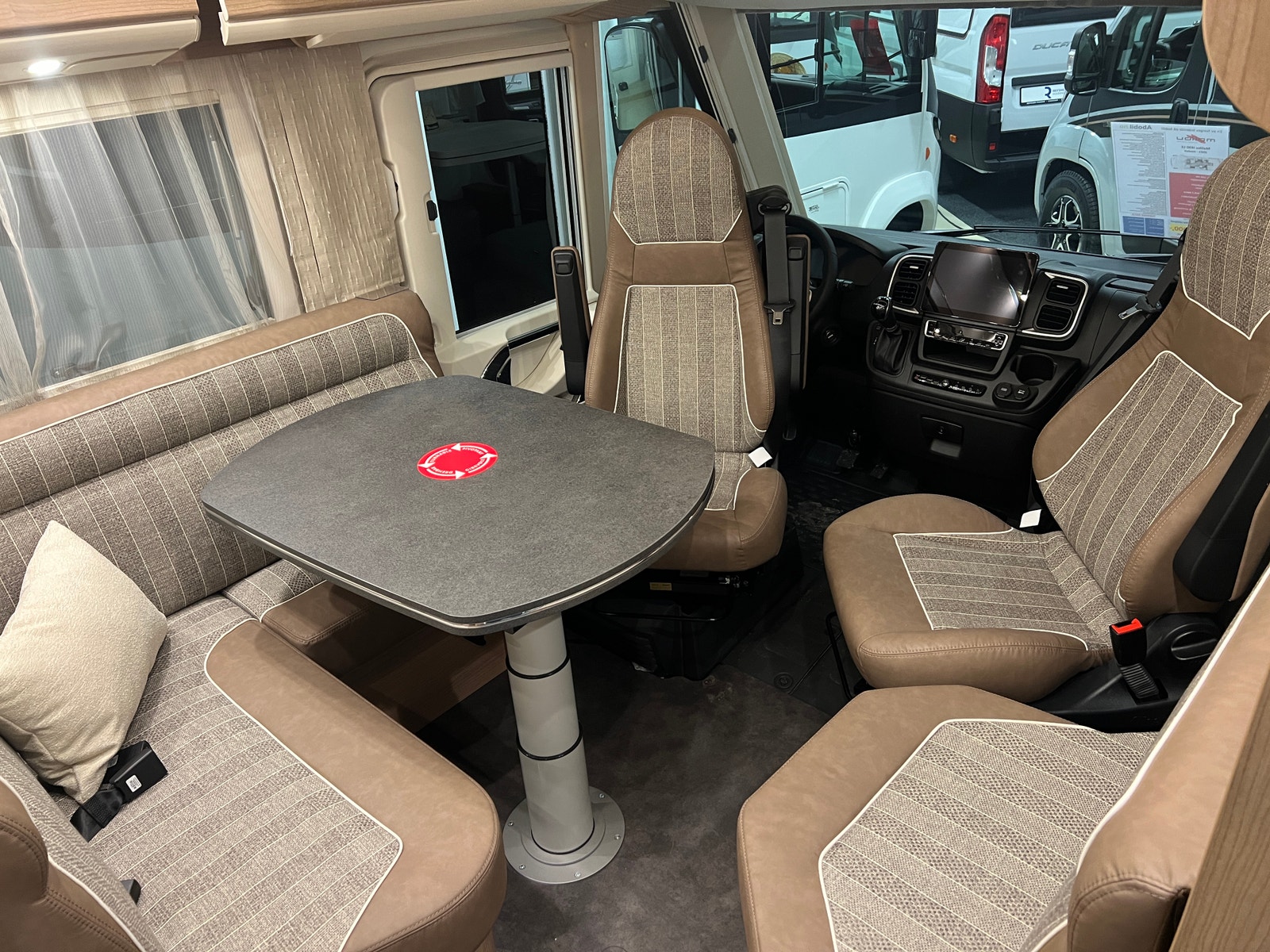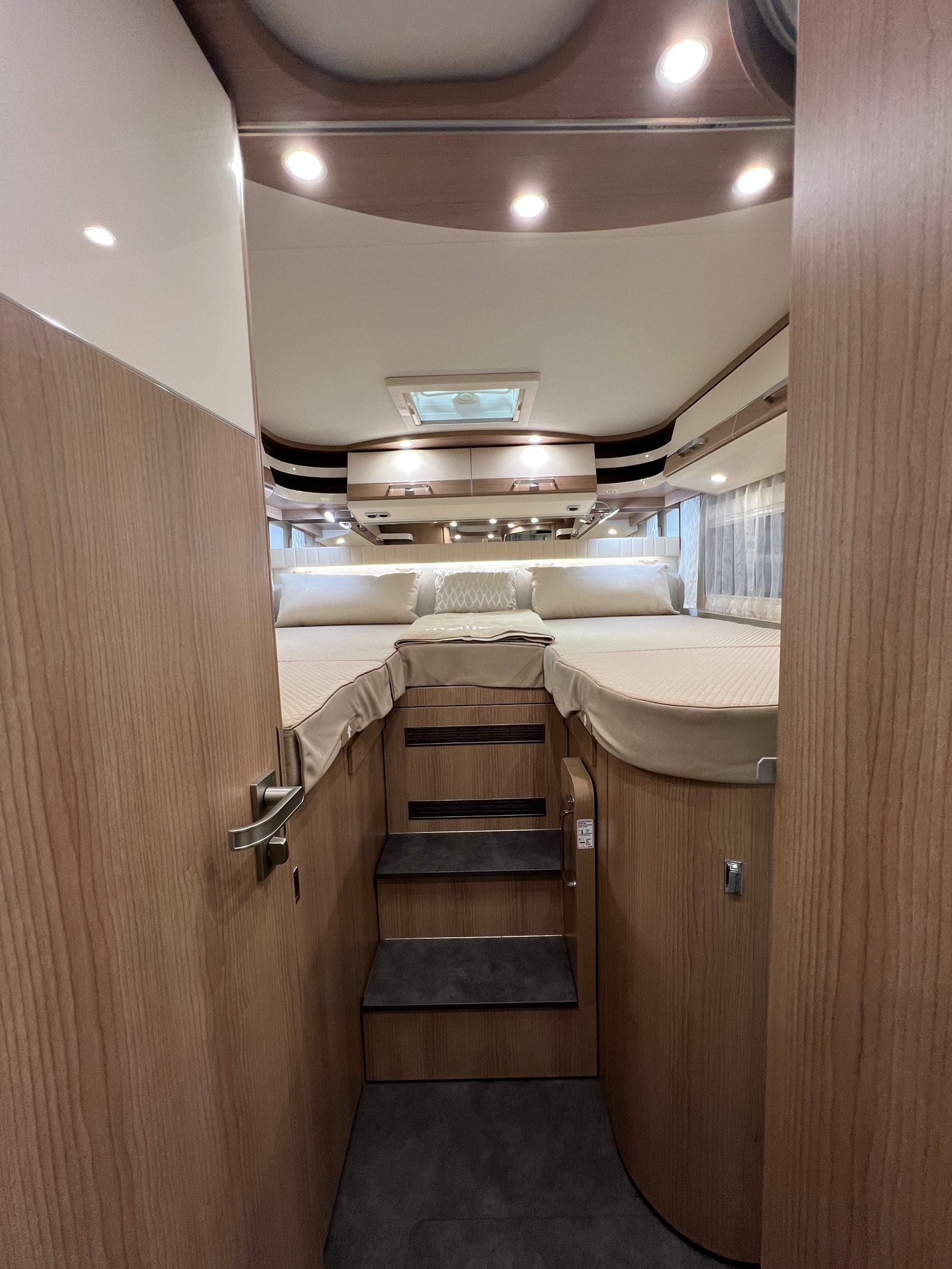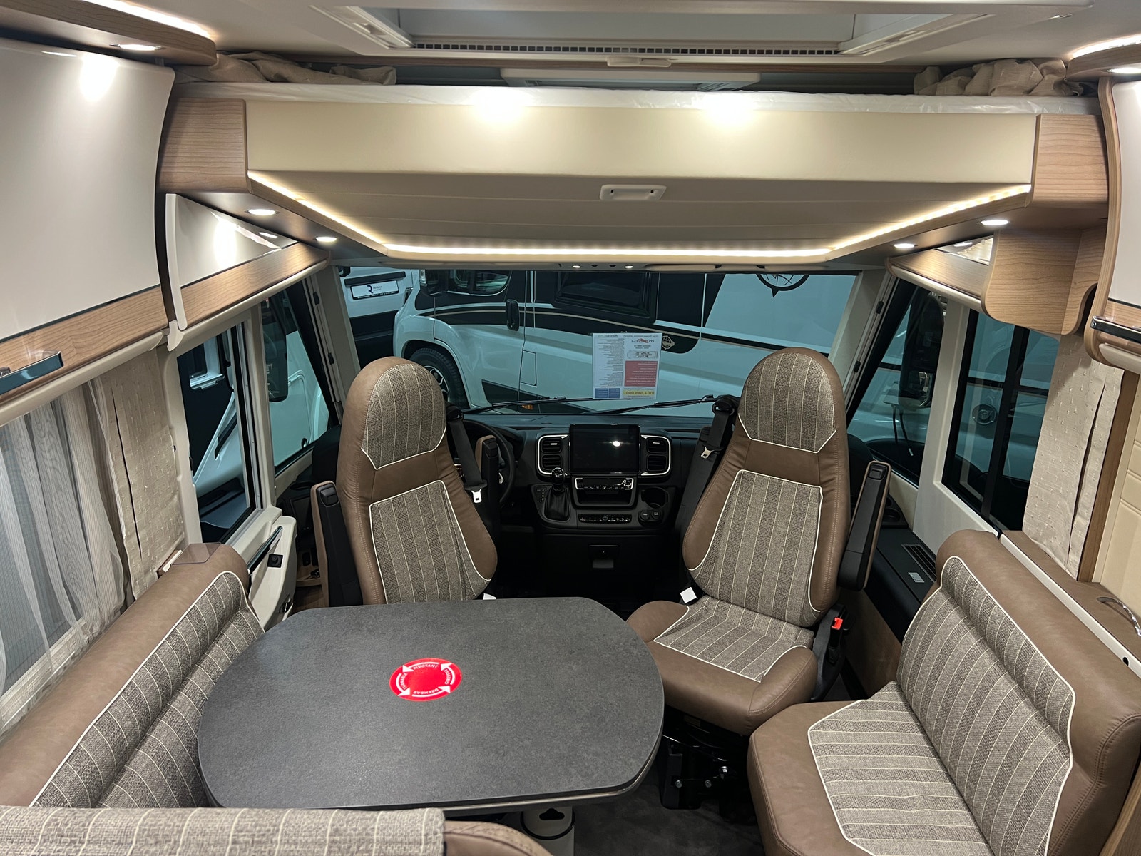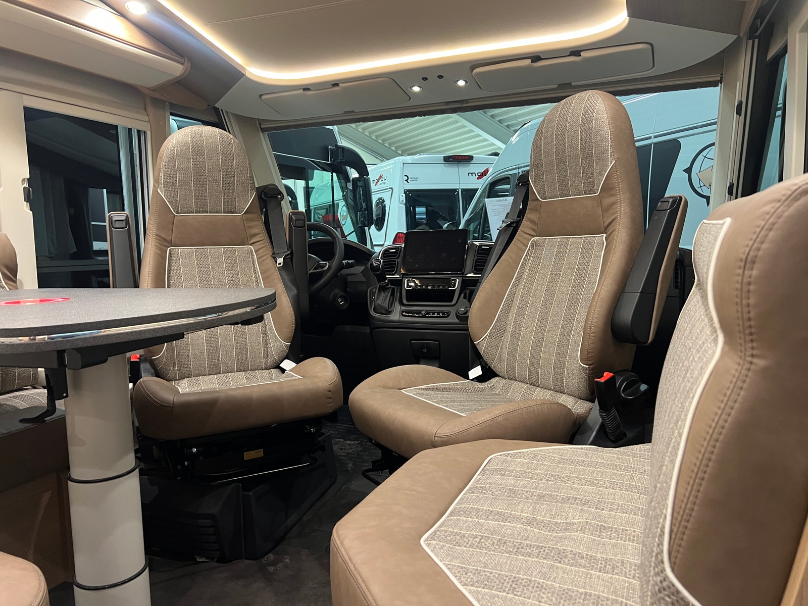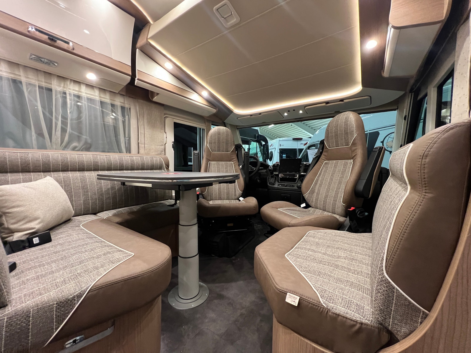 Siden dette er en helintegrert bobil trekkes senkesengen helt frem over dashbord og dekker derfor ikke sofaene ved bruk. Dette gir muligheter for å benytte salongen selv ved bruk av alle senger.