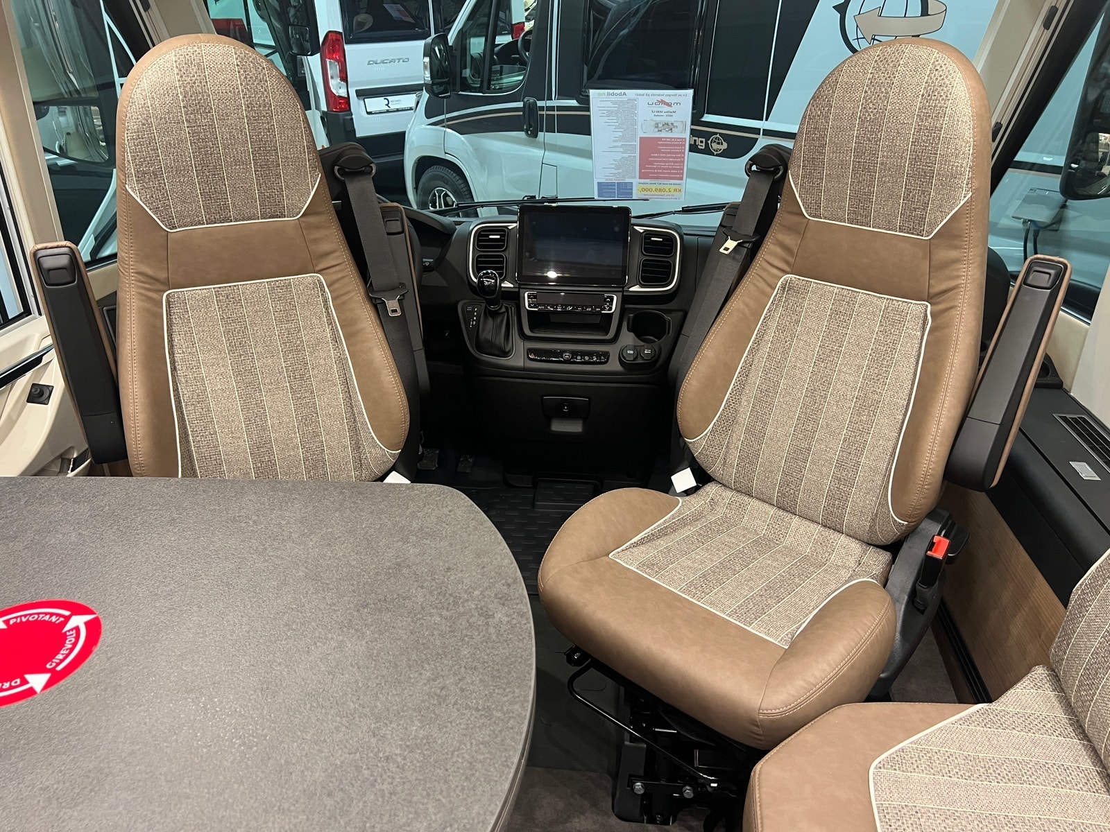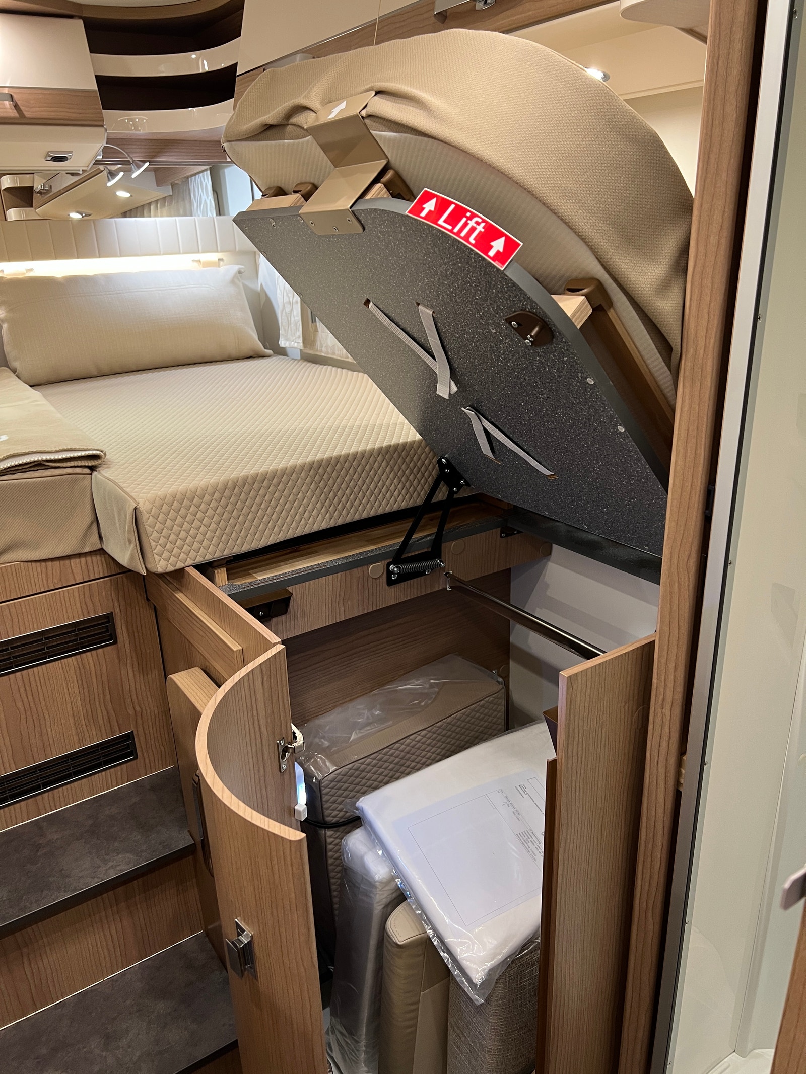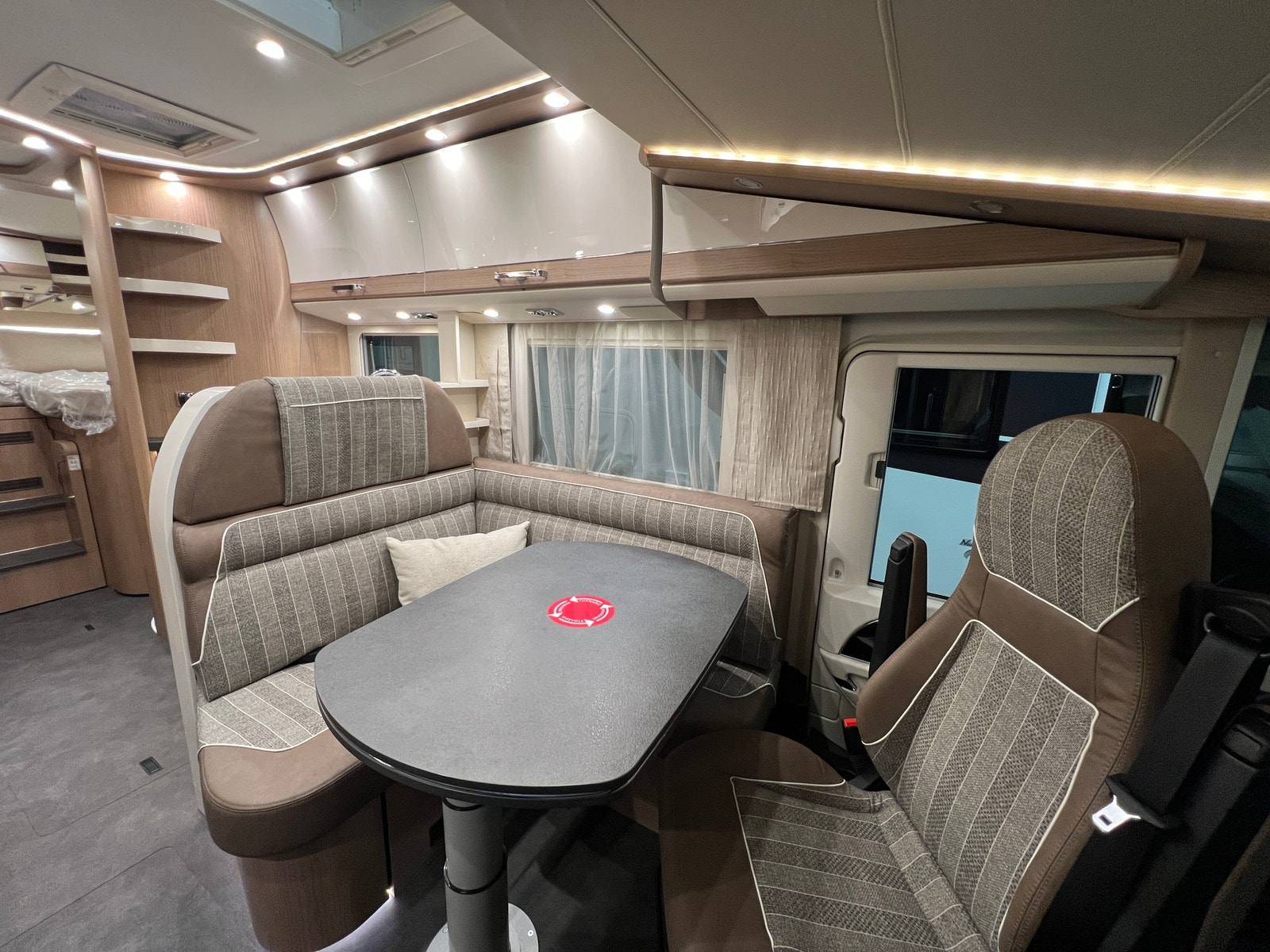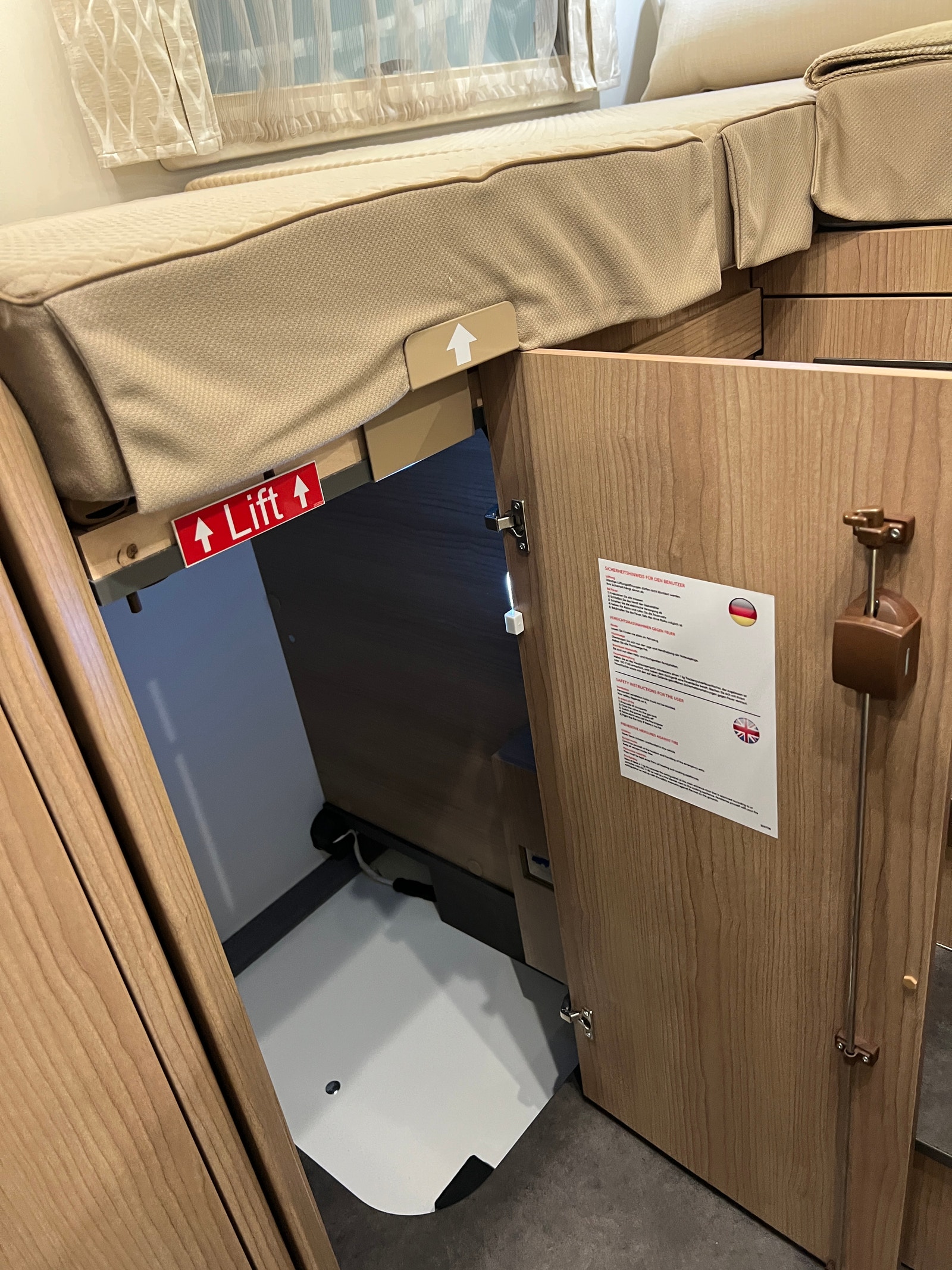 Siden dette er en helintegrert bobil trekkes senkesengen helt frem over dashbord og dekker derfor ikke sofaene ved bruk. Dette gir muligheter for å benytte salongen selv ved bruk av alle senger.