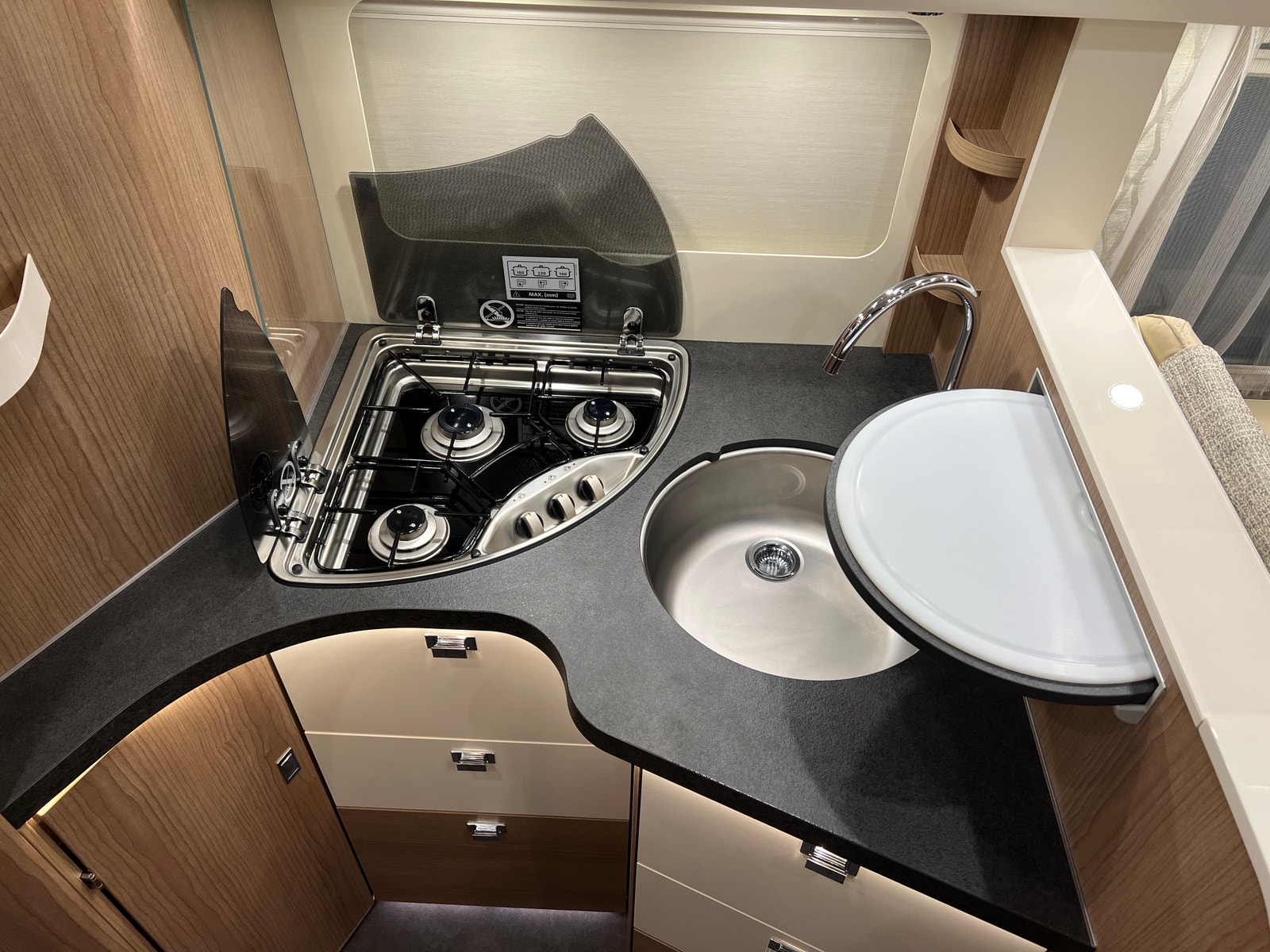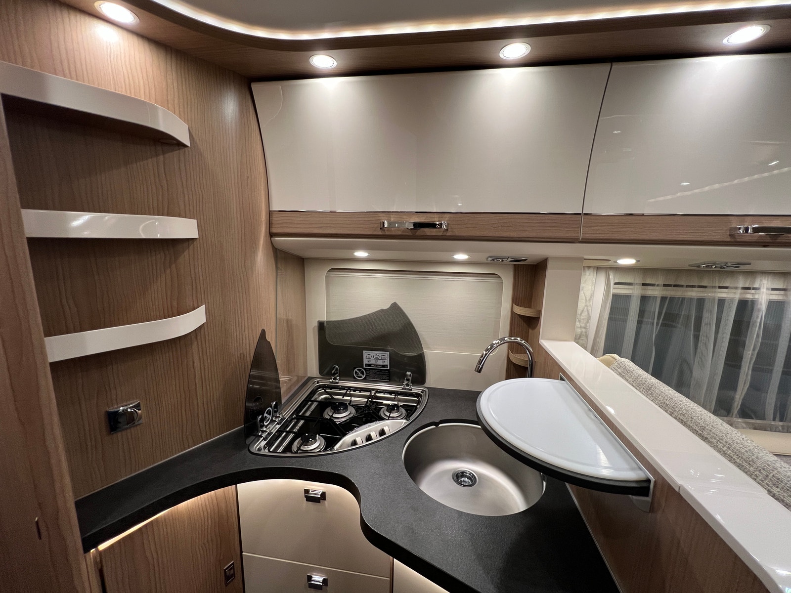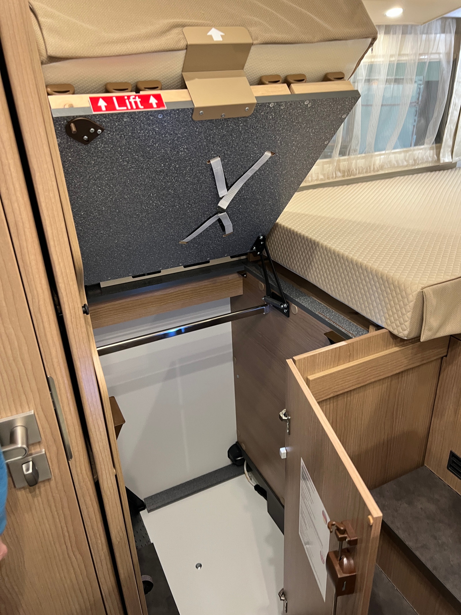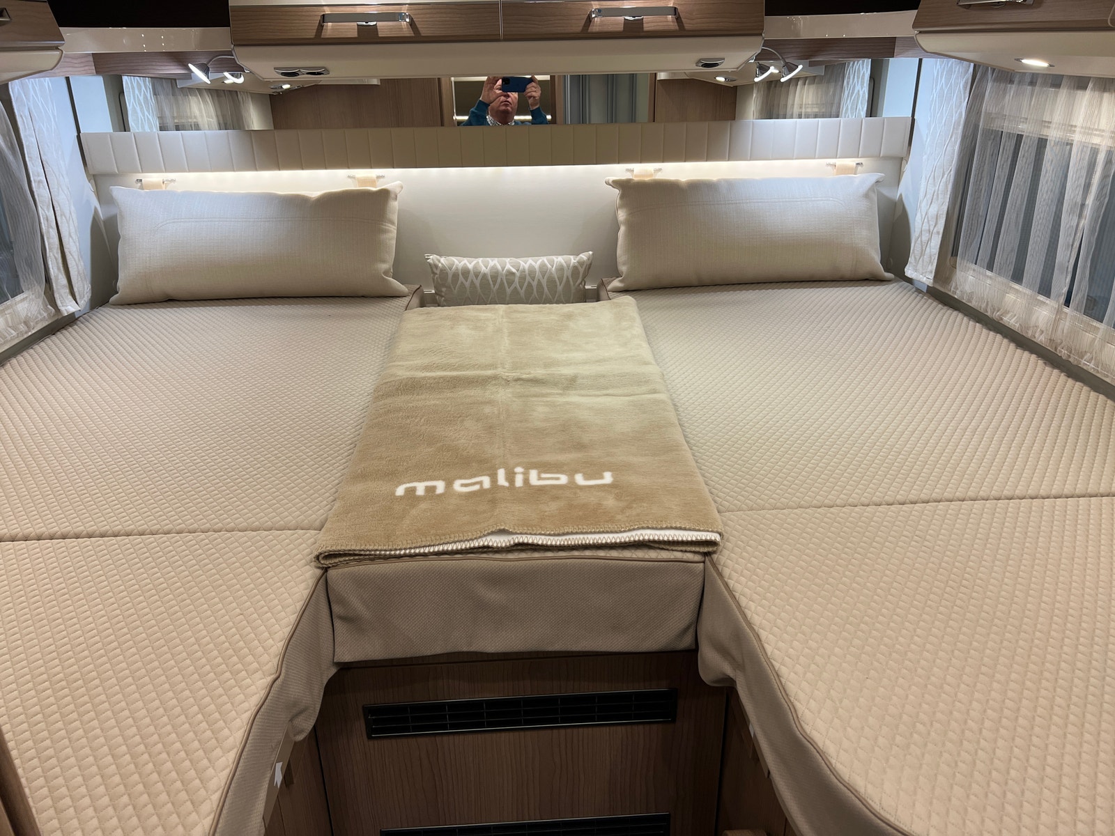 Siden dette er en helintegrert bobil trekkes senkesengen helt frem over dashbord og dekker derfor ikke sofaene ved bruk. Dette gir muligheter for å benytte salongen selv ved bruk av alle senger.