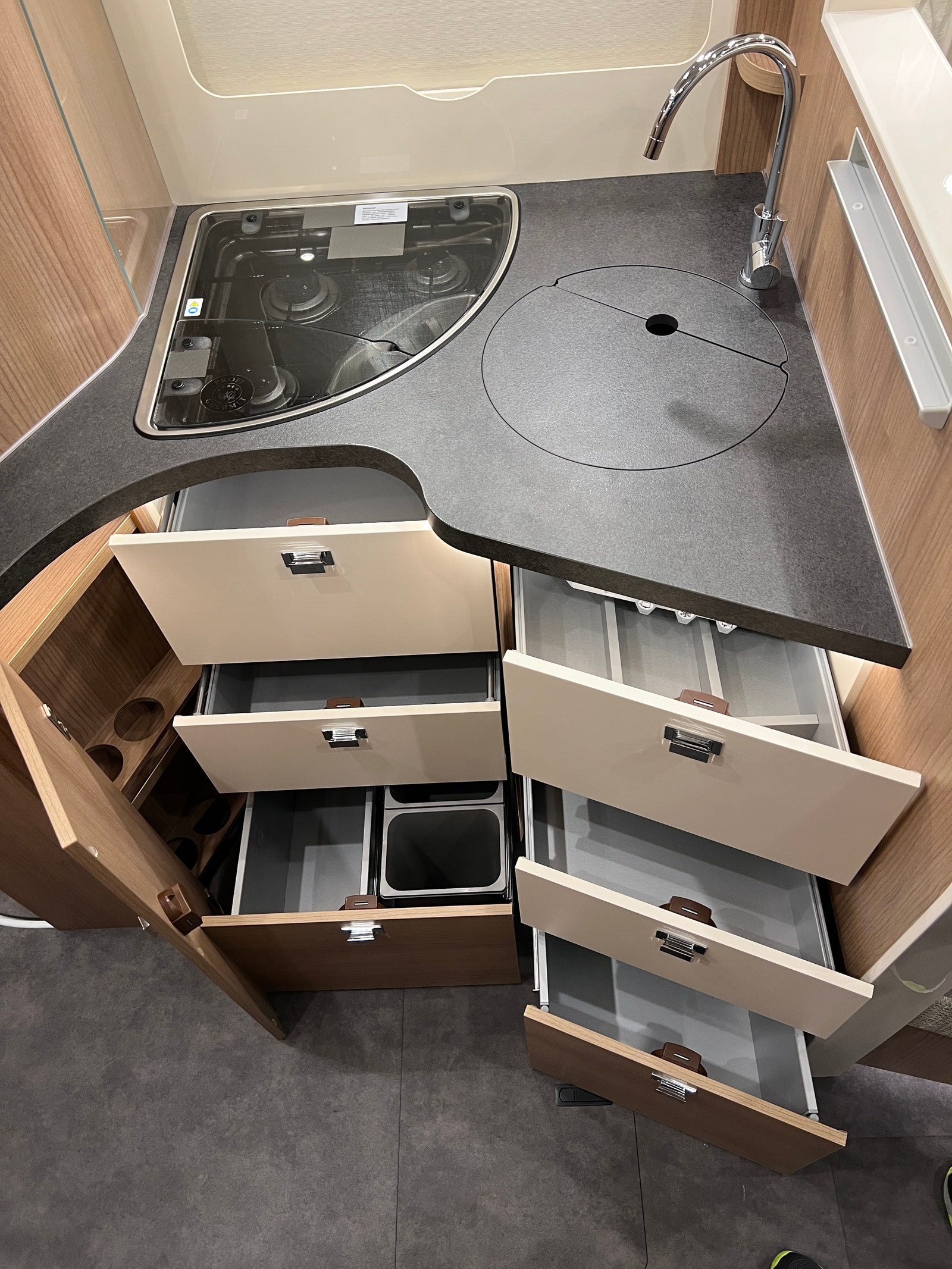 • Komfortvinkelkjøkkenet har ikke bare mengder av skapplass og arbeidsflater, det er også elegant adskilt fra resten av bodelen med en kjøkkenbenk