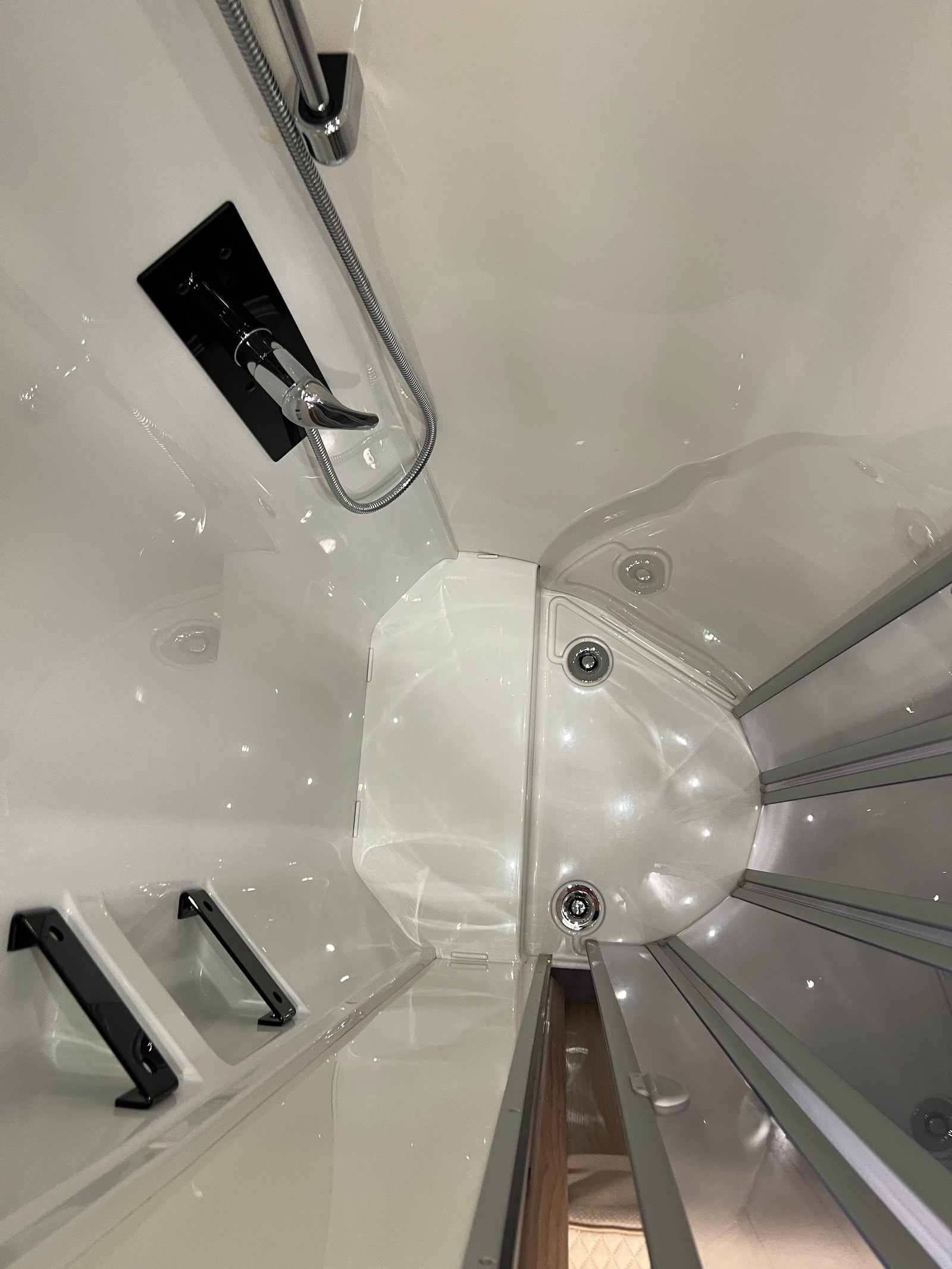 Det er 2 avløp i dusjen på denne modellen for ekstra god drenering selv med litt helling på bodelen ved f.eks fricamping.