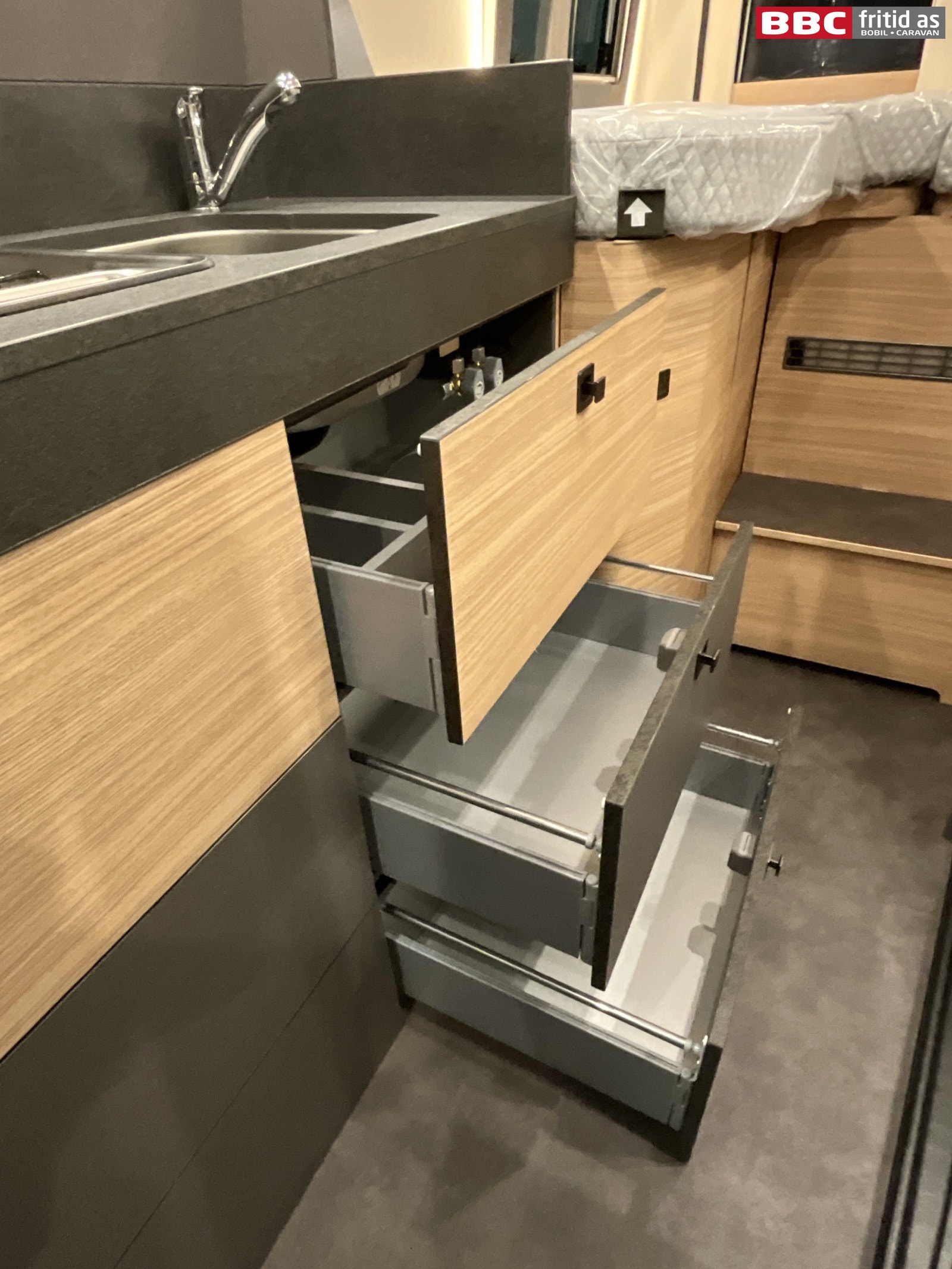 Kjøkkenet innholder kjøkkenbenk (som kan forlenges ca 25 cm ved behov, 2 kokebluss, vask, 2 overskap, 3 skuffer, 2 lys over benken, 2 taklys, og 230V-uttak. Kjøleskapet har innebygd fryseboks.