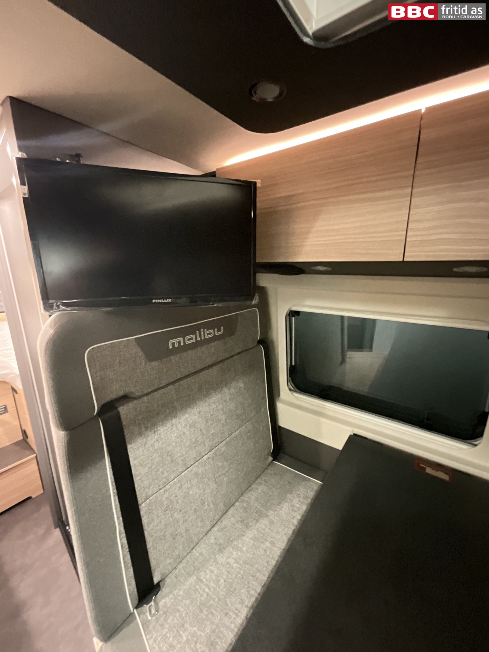 Rett-salong for 2 personer. Pene farger og materialer i god kvalitet. Bordet måler ca 91 x 54 cm, og kan i tillegg svinges ut med en ekstraplate under bordet på ca 38 cm. Meget praktisk løsning. Bordet kan også taes av ved behov. Ellers er det 4 overskap, 230V og USB-uttak, 4 taklys, 2 lys under overskapene, takluke på 40 x 60 cm, TV Finlux 22″ på veggfeste og gulvluker for oppbevaring.