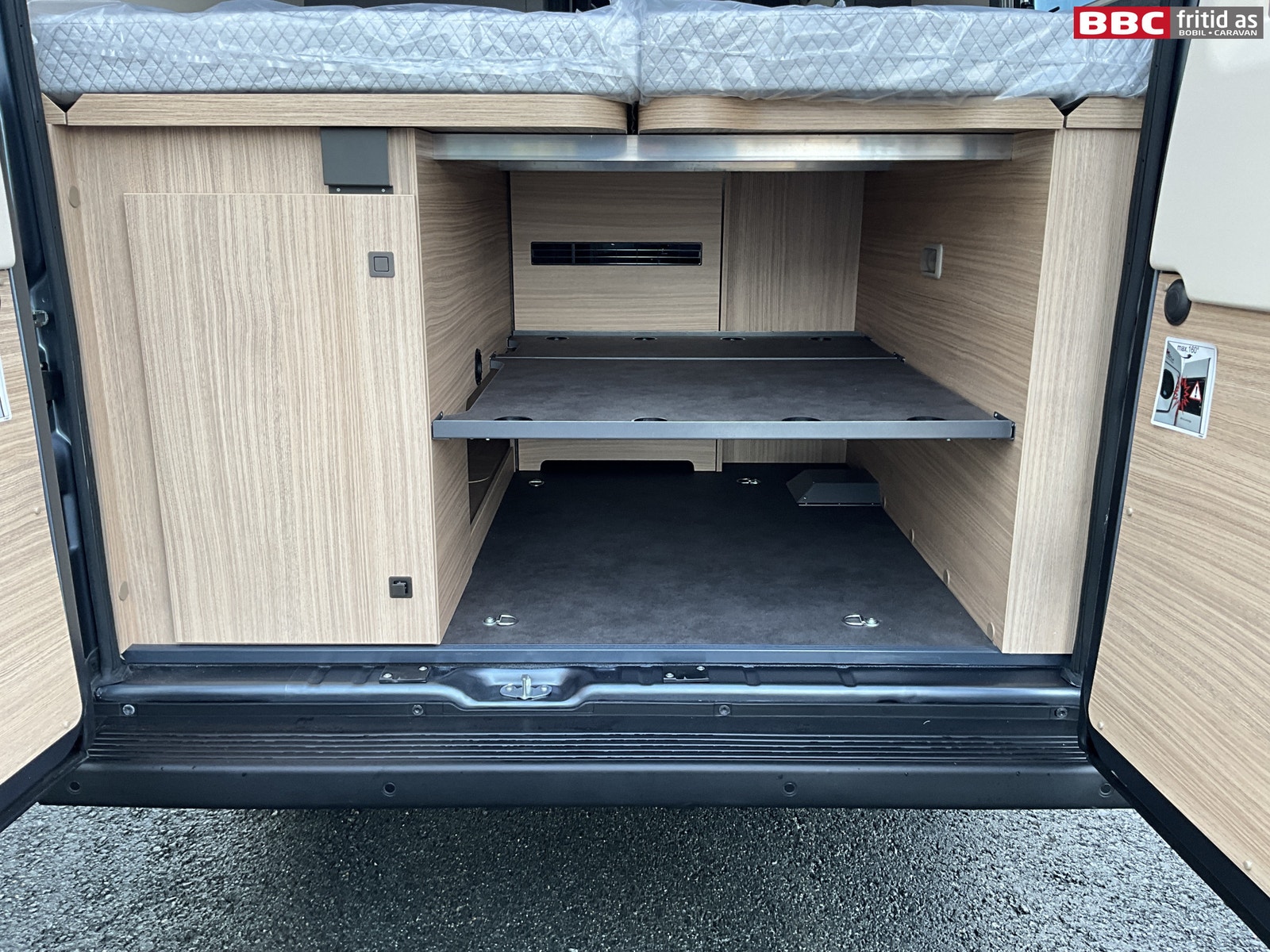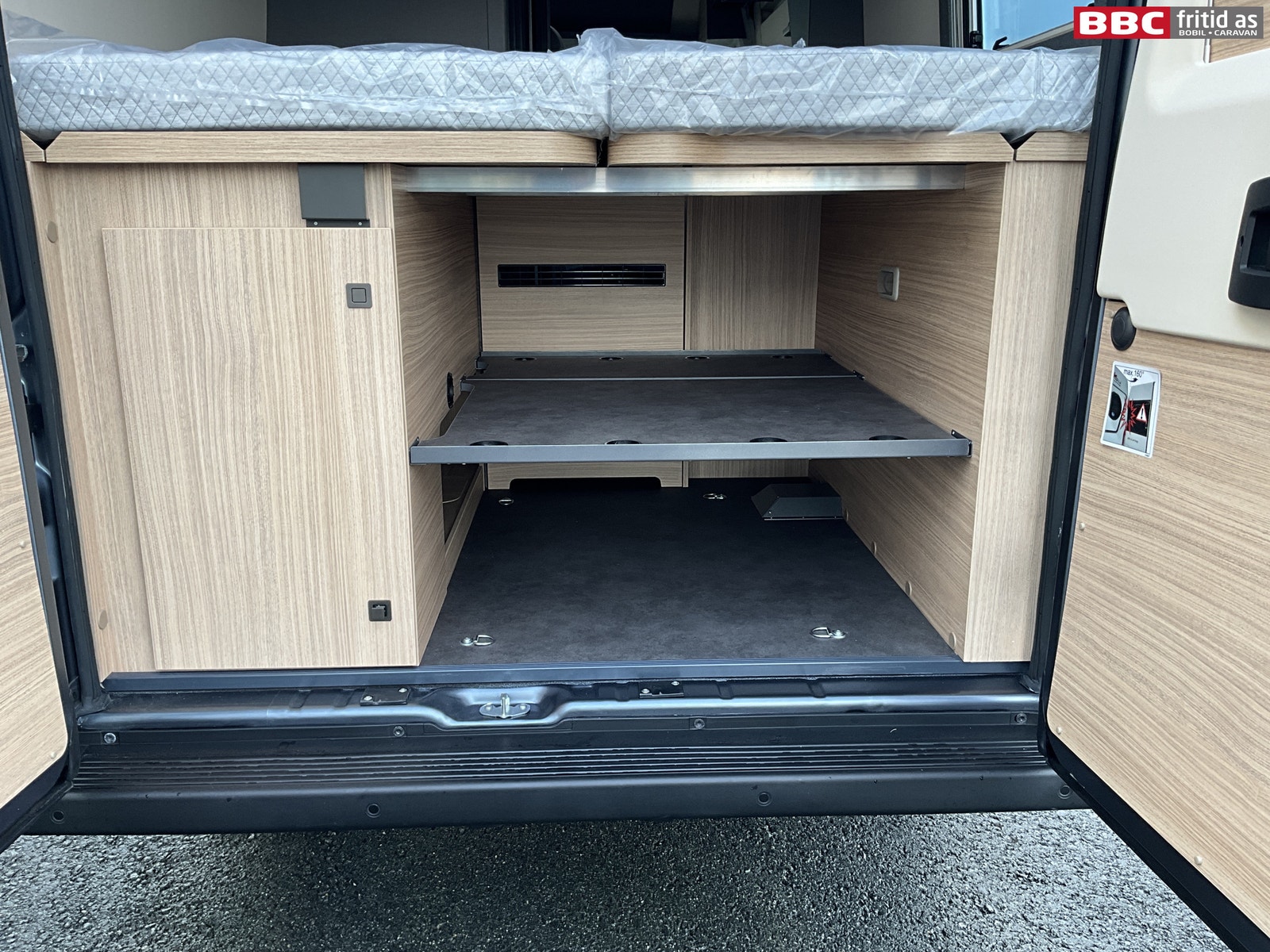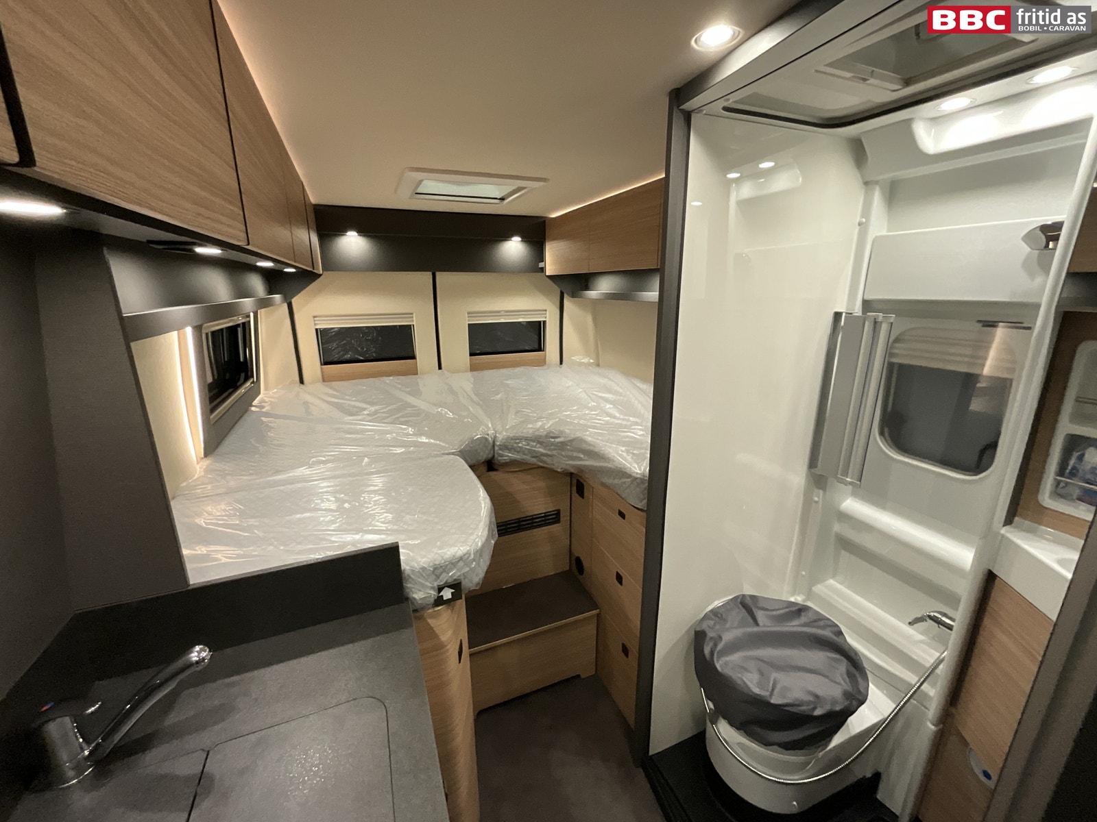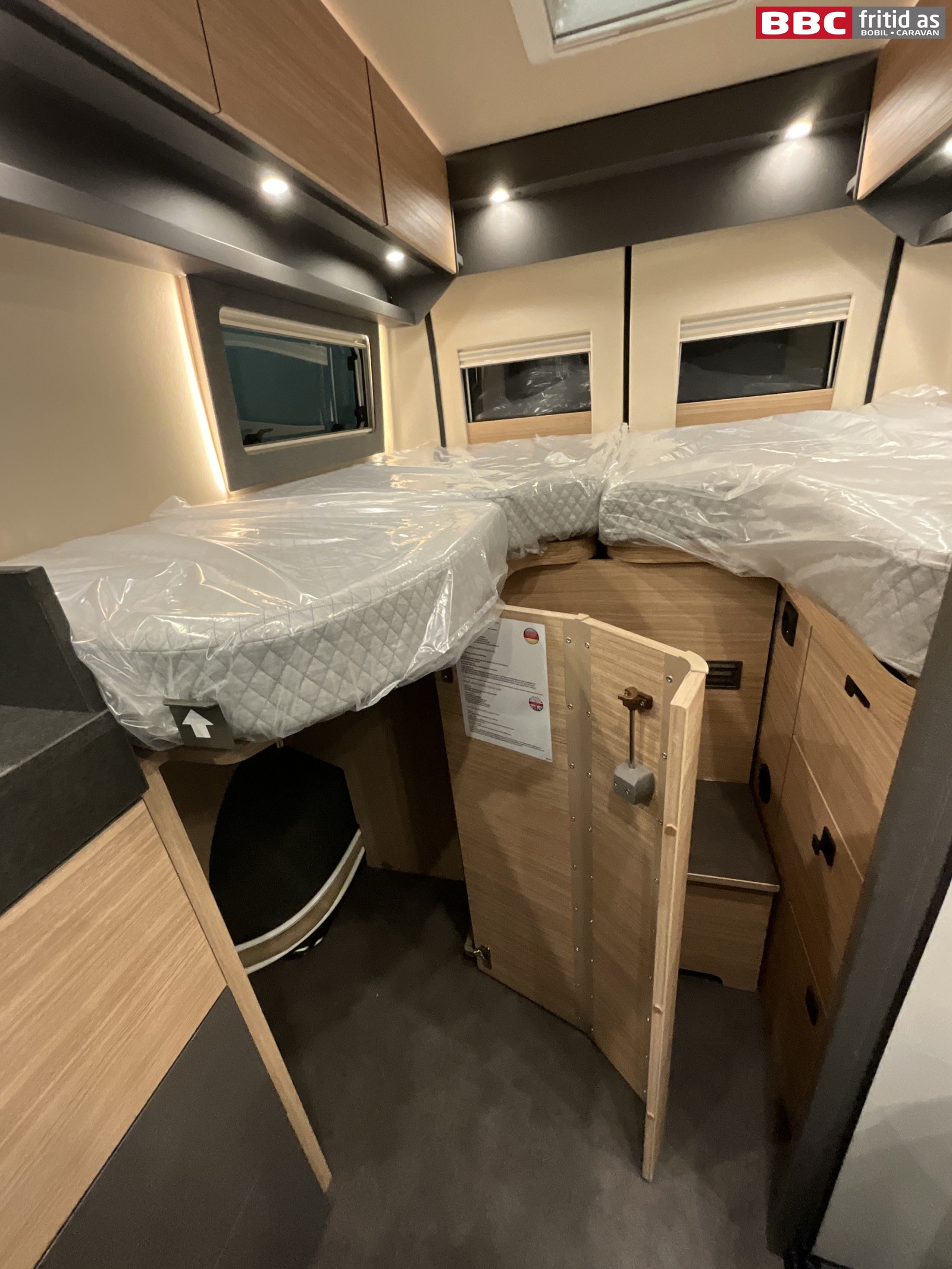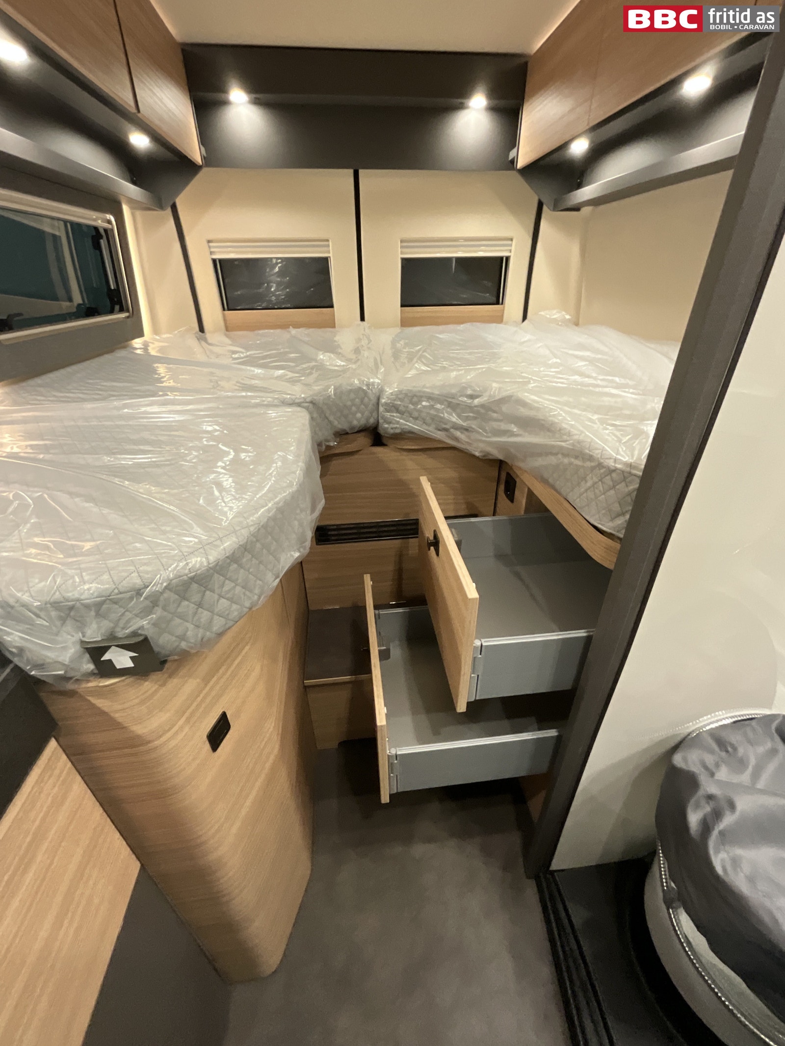 Bakerst i bilen er det 2 enkeltsenger på 195 x 75 og 180 x 75 cm. Disse kan også legges sammen til stor dobbeltseng. 1 seng kan vippes opp i fotenden, det er 2 skuffer under sengene, 6 overskap, 2 underskap, 2 hyller, 2 leselys, 6 lys under overskapene, 2 stk USB-uttak og 3 vinduer. Takluken måler 40 x 40 cm.