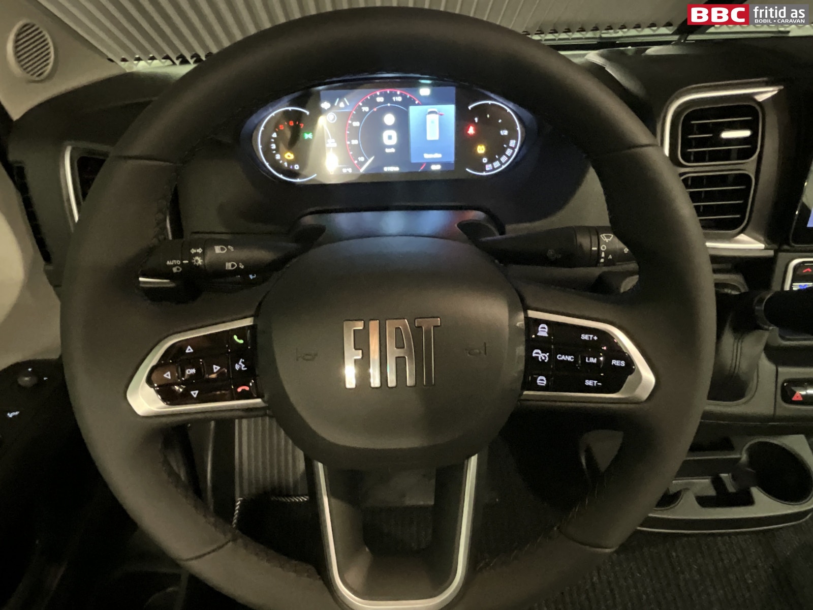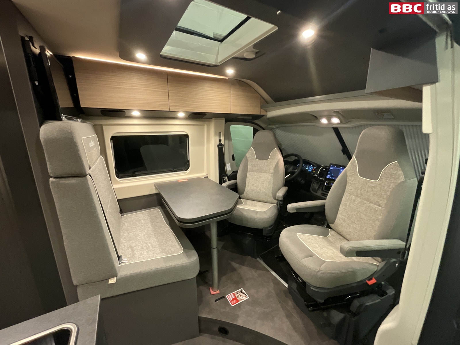 Fremme i bilen er det 2 gode vendbare fremseter med justerbare armlener. Meget gode å sitte i. Det er også 4 koppholdere, 12V og USB-uttak, Fiat 2-din DAB+ radio med stor touch-skjerm hvor du styrer handsfree, bluetooth, navigasjon og radiokanaler. Elektriske vinduer og speil, nøkkelfri start (Startknapp), multifunksjonsratt, digitalt varmeapparat, aircondition, 2 taklys, REMIS blending i front og sideruter.