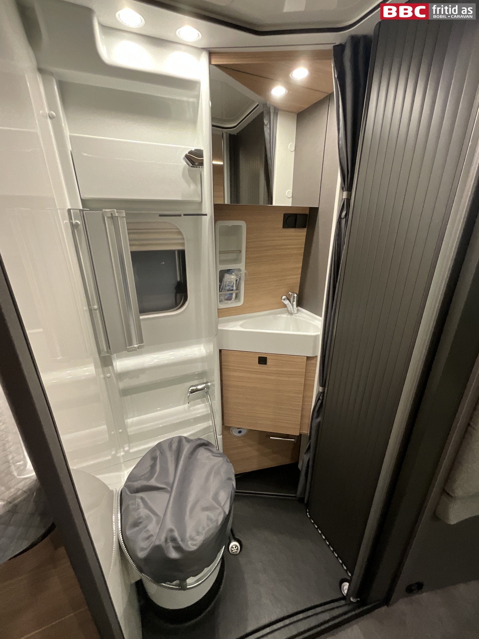 Inne på badet er det wc, vask, dusj, underskap, speil, 3 taklys, 230V-uttak, takluke og skyvedør mot gangen.