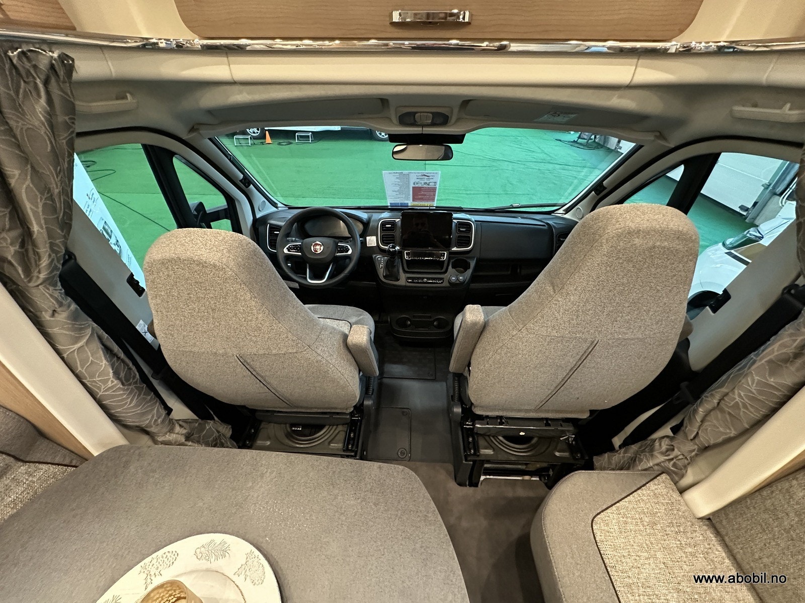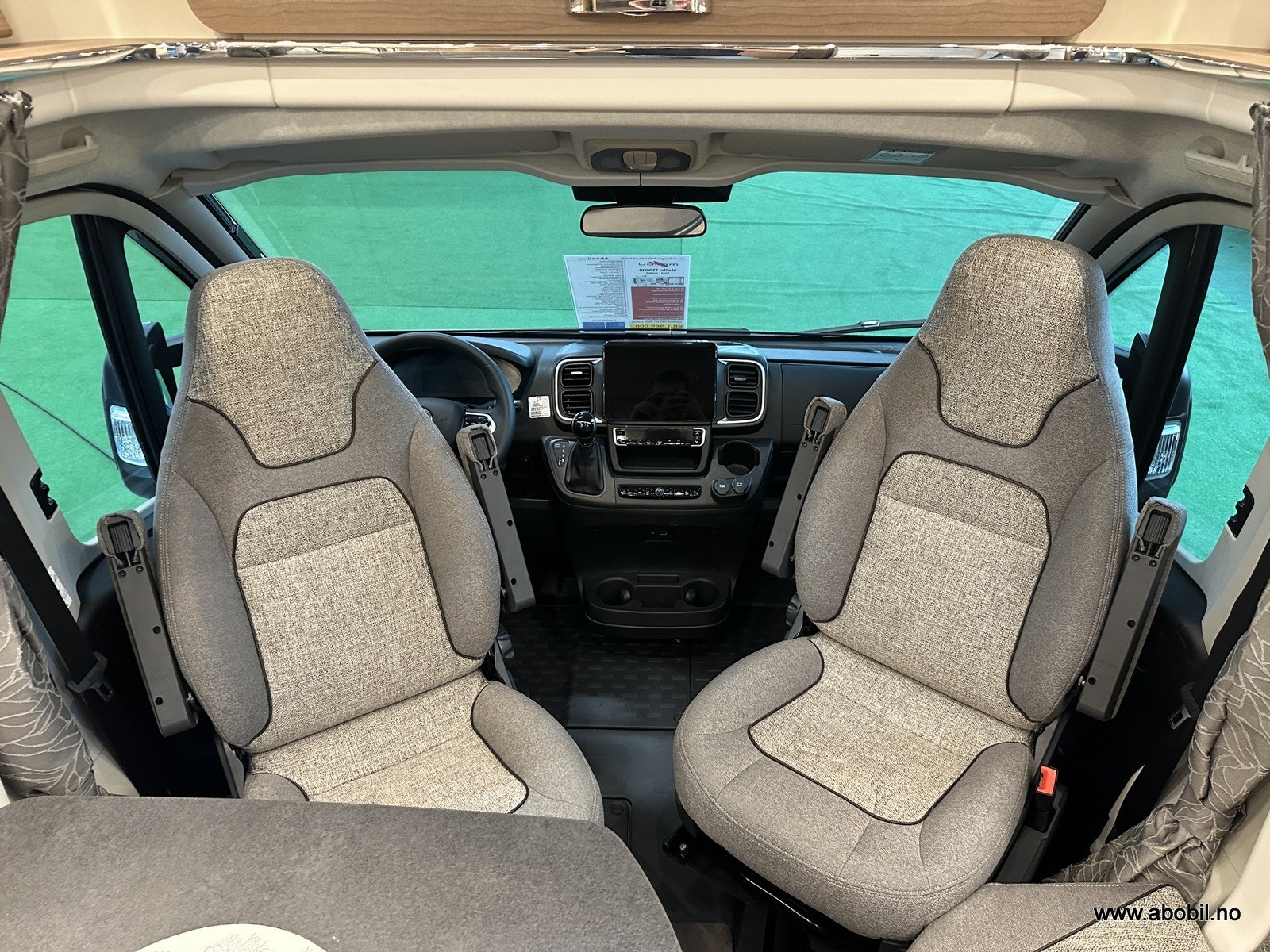 Komfortable fører- og passasjerseter, dreibare og med polstrede armlener, trukket i matchende interiørstoff.
