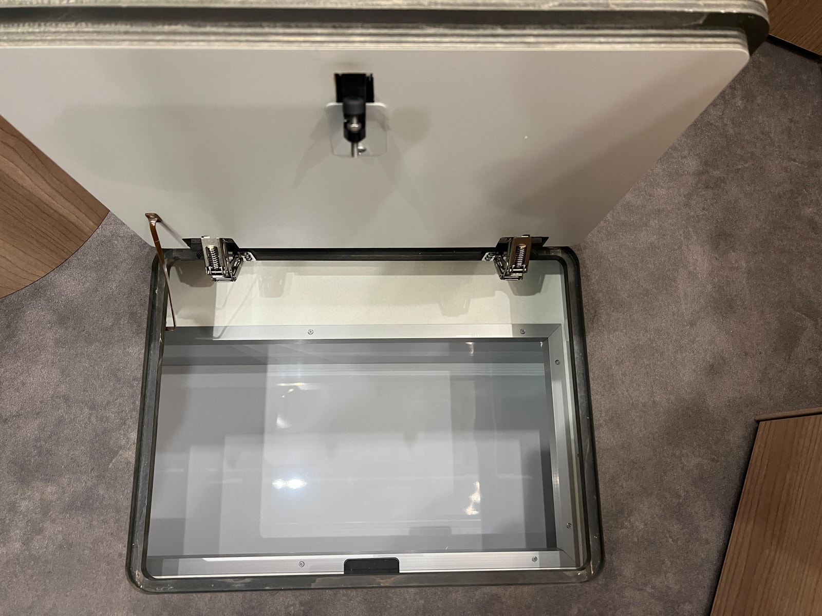 Stort oppbevaringsrom i dobbeltgulv – tilgang både innenfra og utenfra.