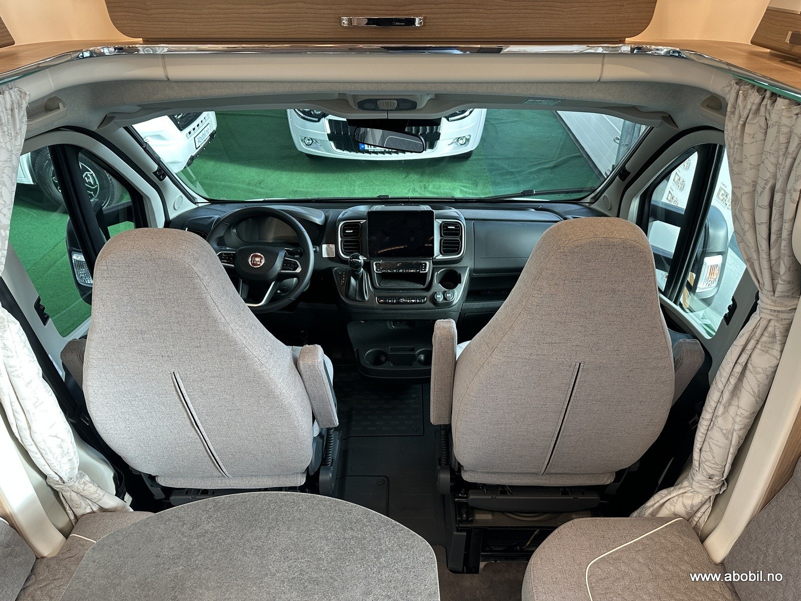 Komfortable fører- og passasjerseter, dreibare og med polstrede armlener, trukket i matchende interiørstoff.