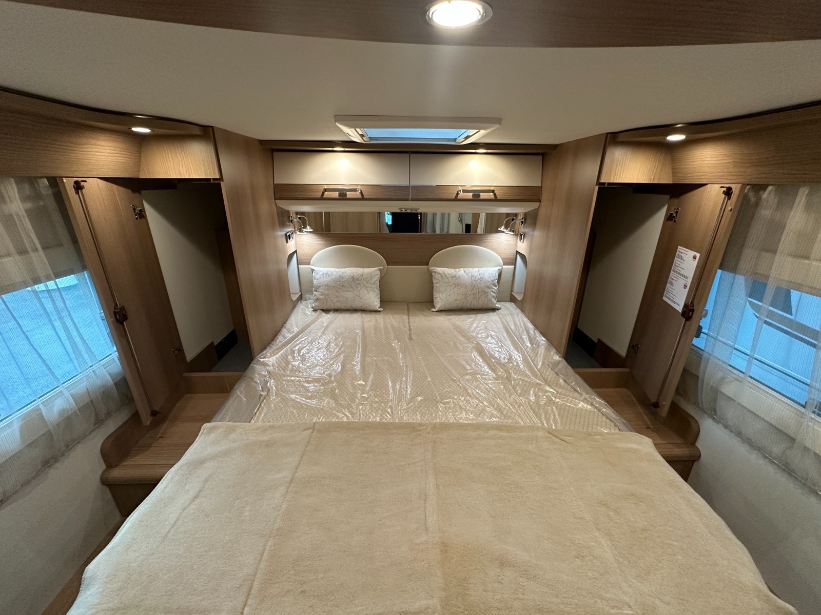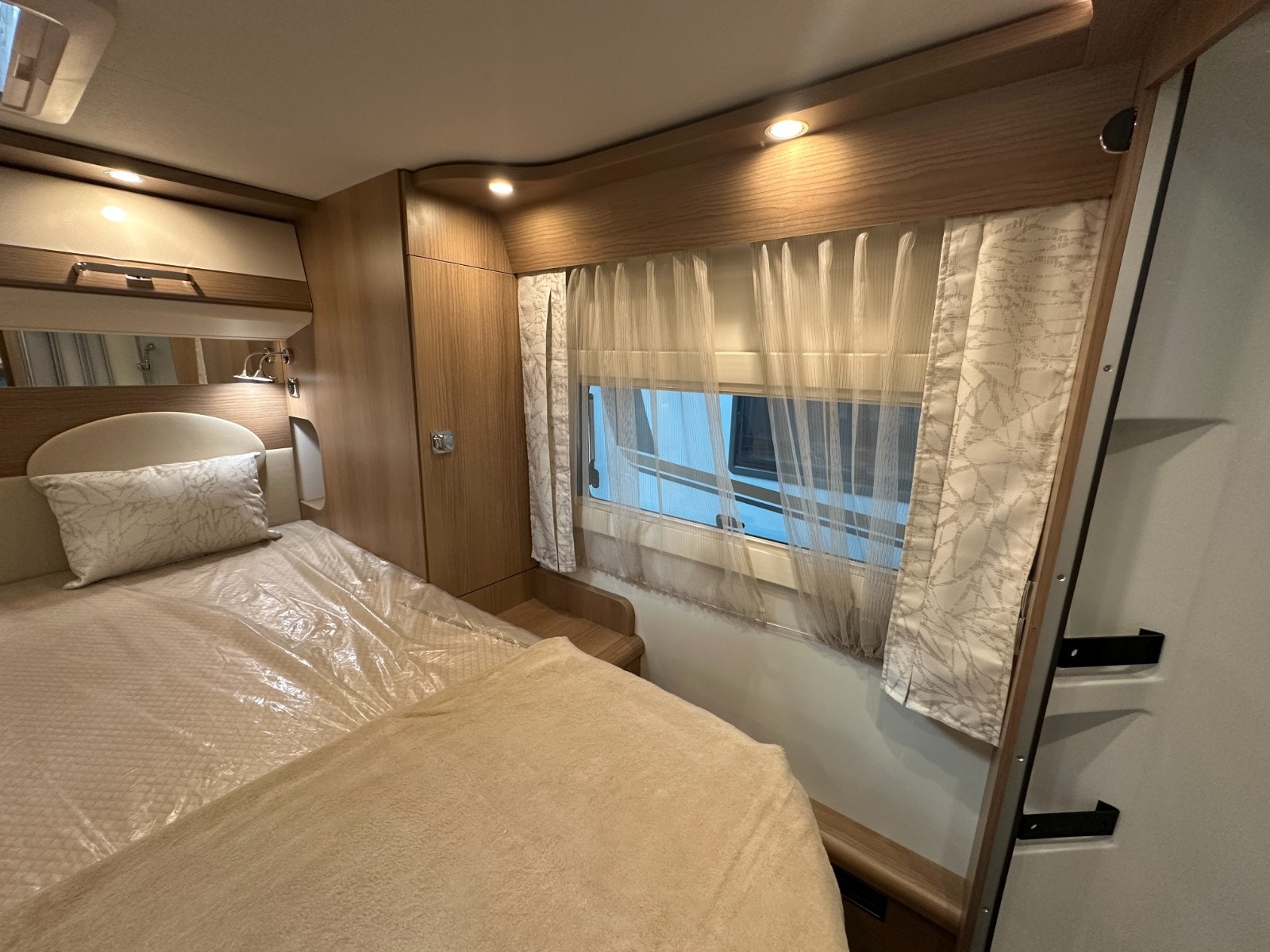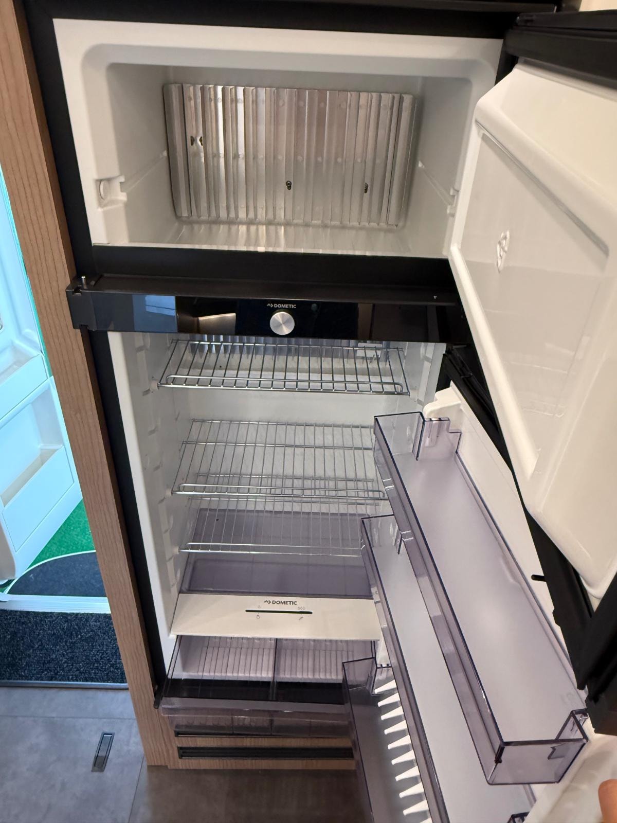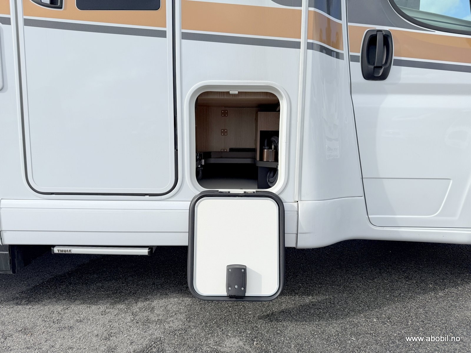 XL Premium-dør “two 2.0” – bred åpning (63 cm), dobbel sikkerhetslås og ekstra bredt vindu. Inkluderer formørkningsgardin og helintegrert myggnett. Stort oppbevaringsrom i dobbeltgulv – tilgang både innenfra og utenfra.