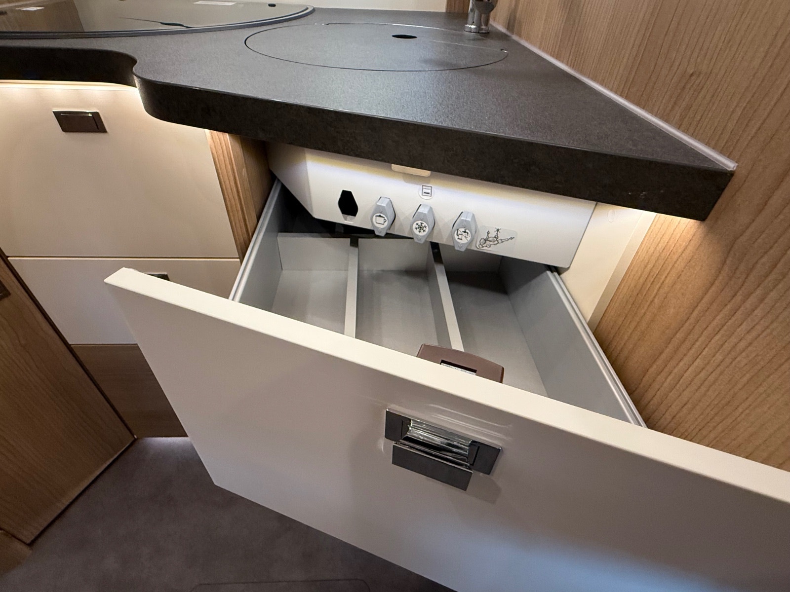 6 romslige skuffer med softclose – inkludert bestikkinndeling i tre.