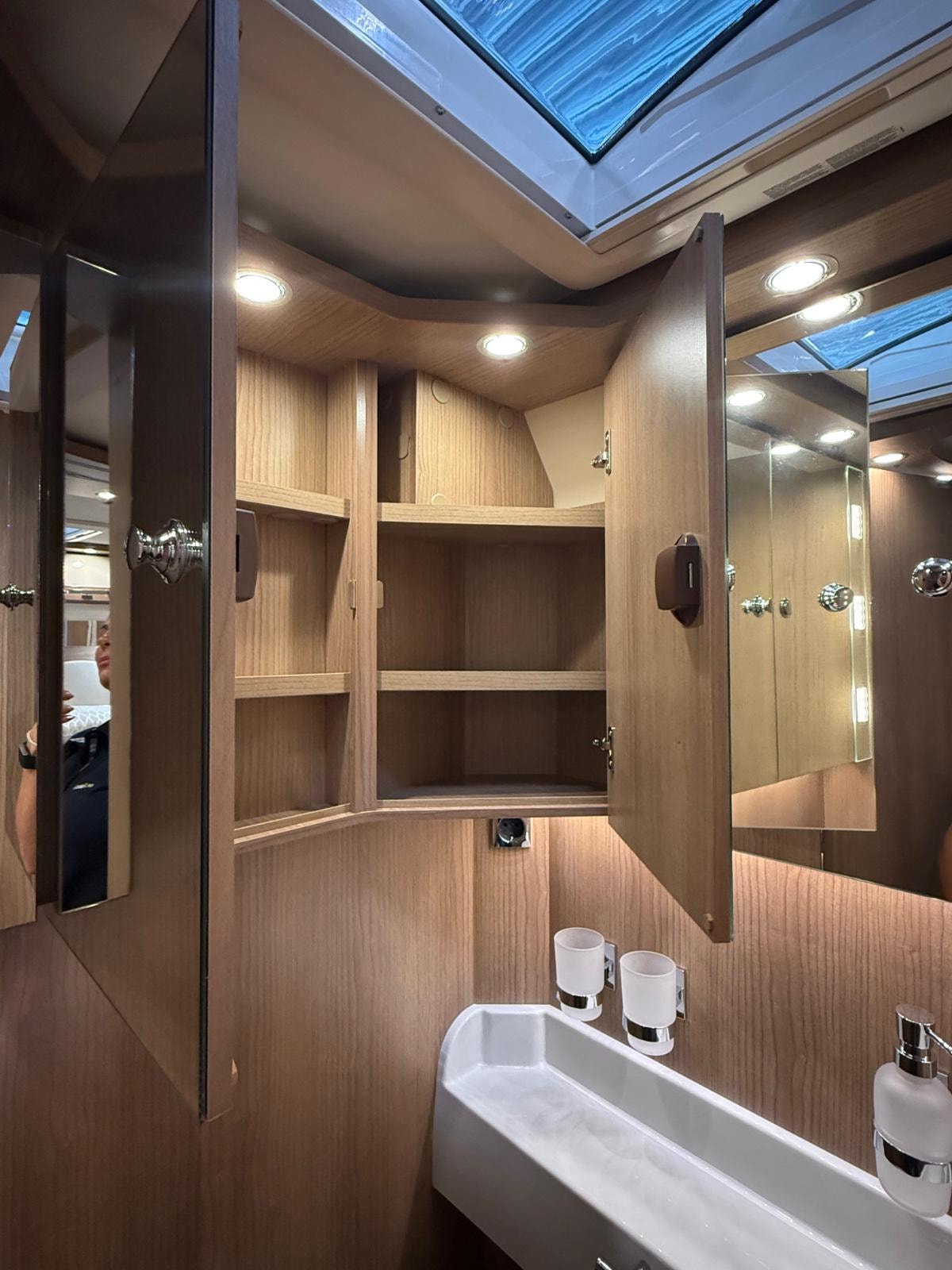 Stor speilskap med hylleinndeling.