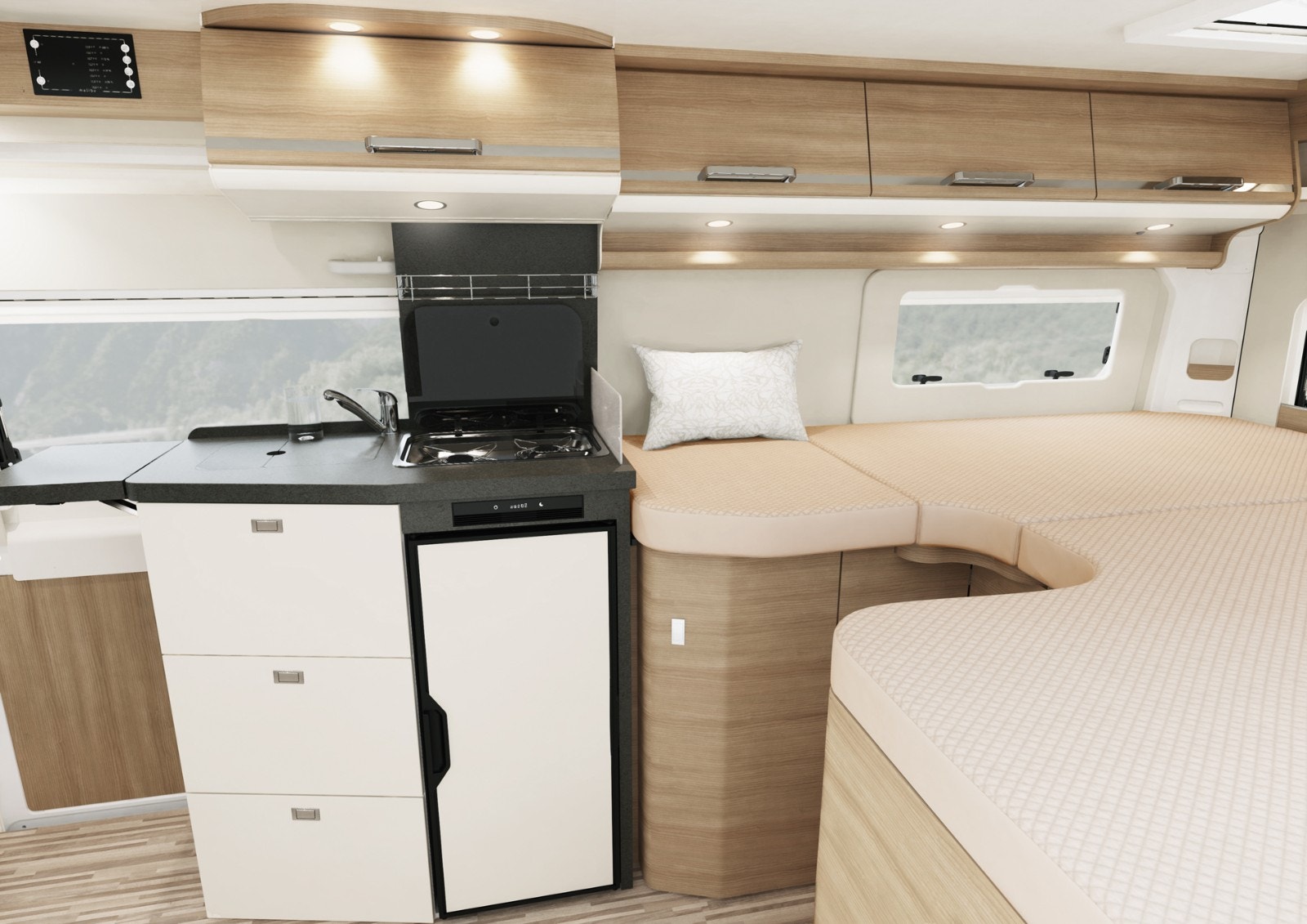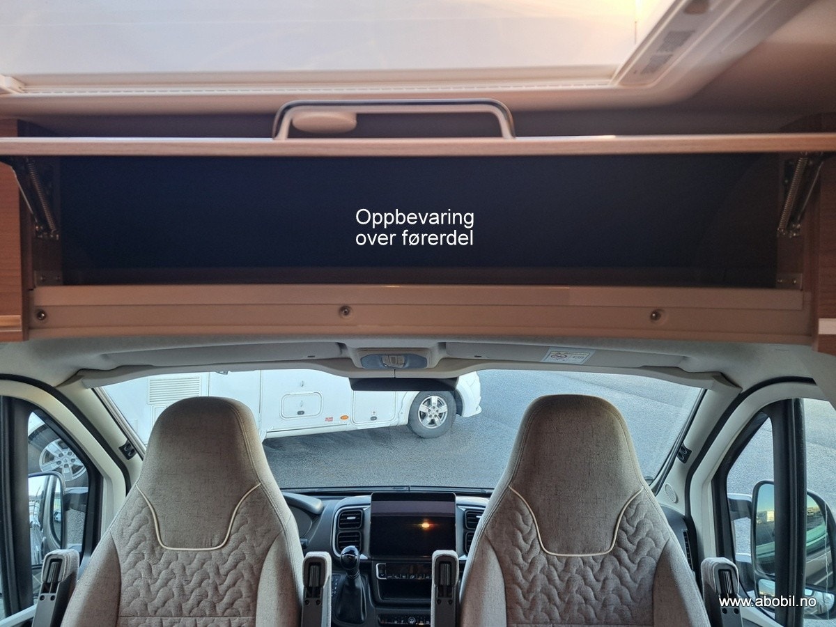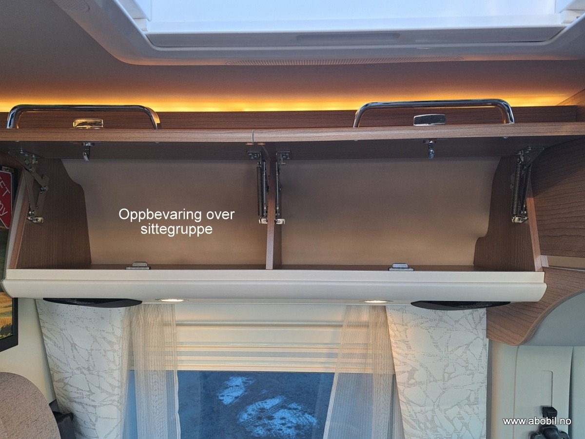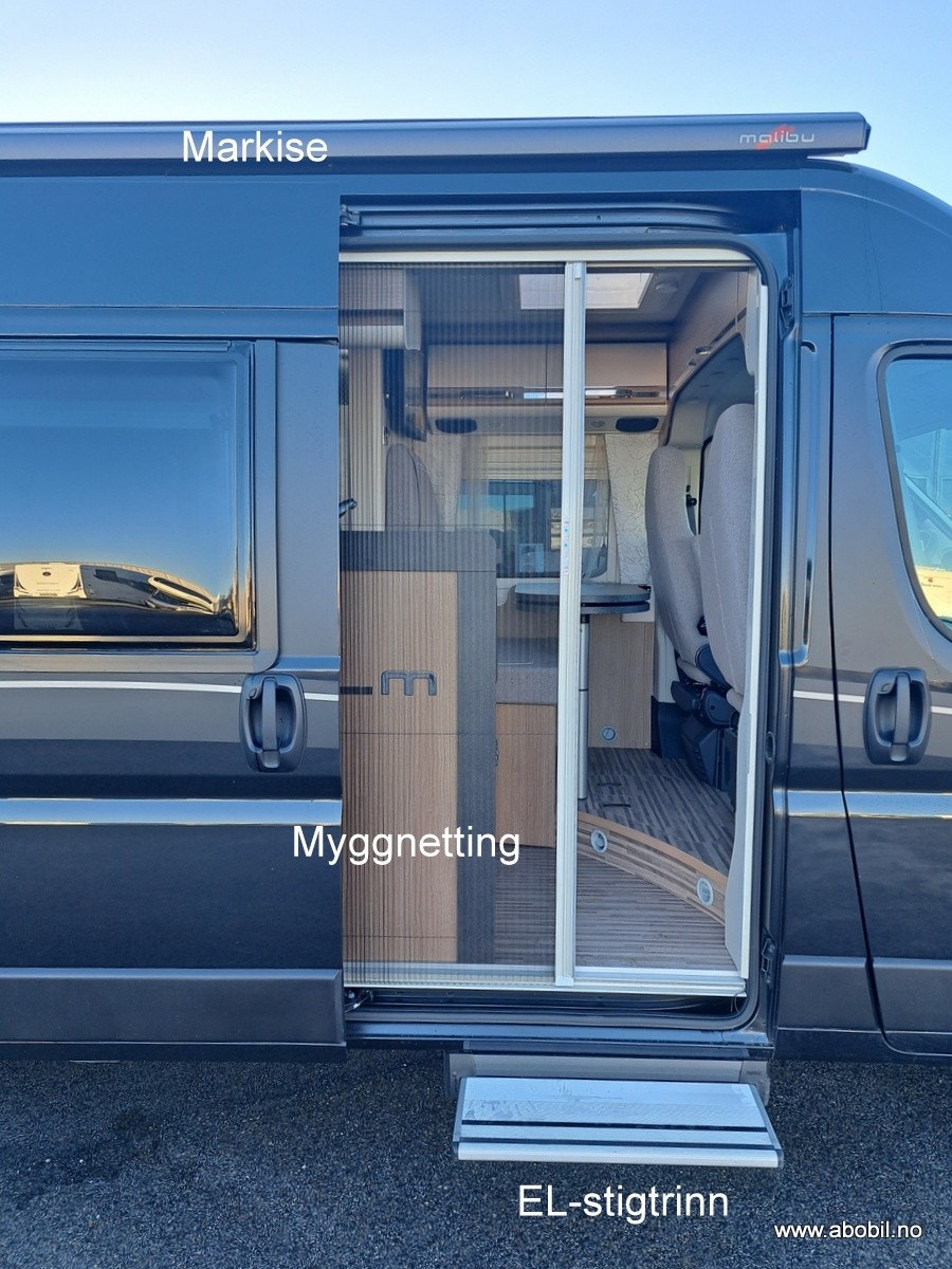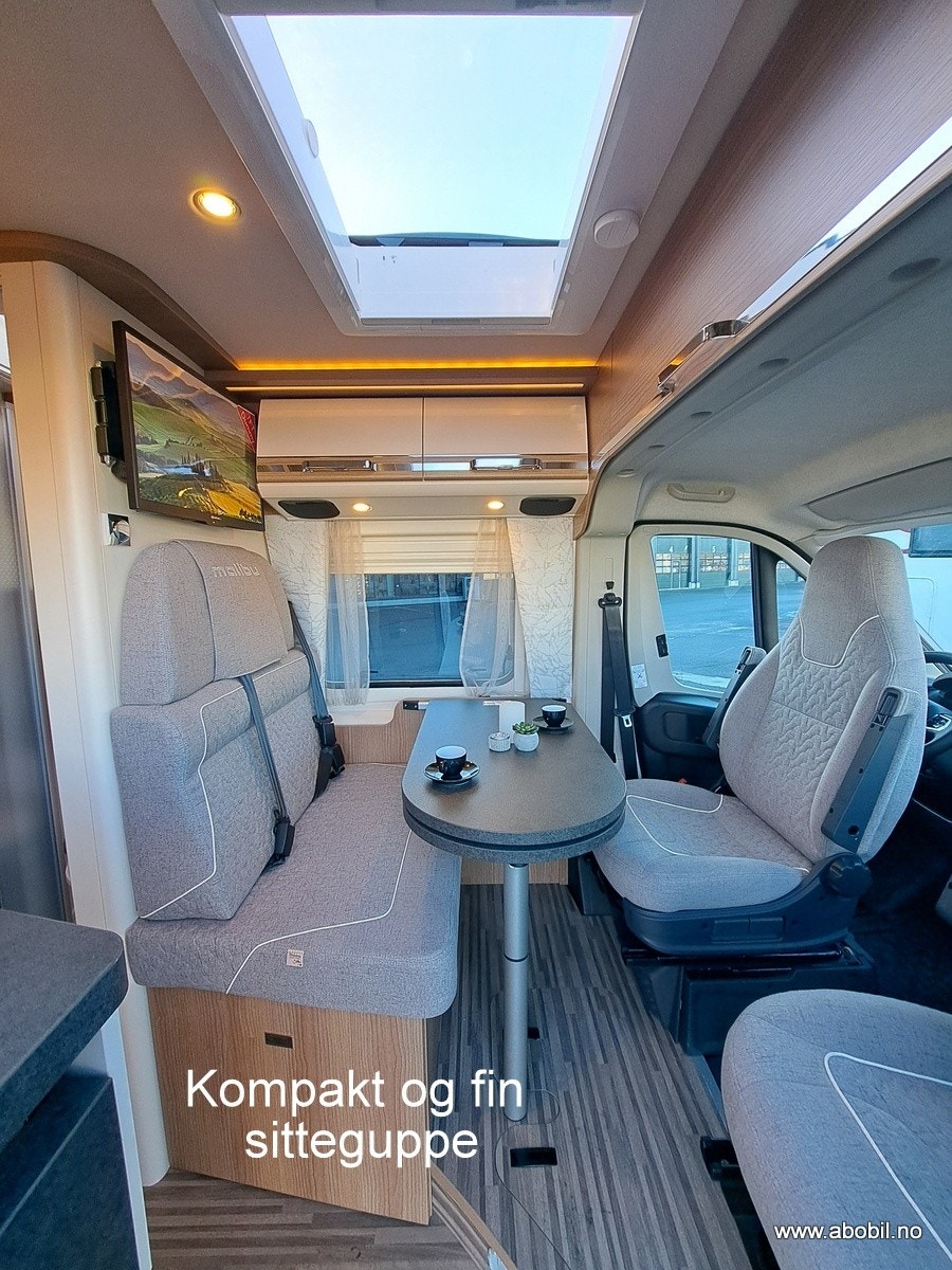 Den kompakte sittegruppen rommer komfortabelt fire personer, med svingbare førerseter som er perfekt integrert i designet. Bodelsbordet har en uttrekkbar funksjon for å utvide bordplaten. Det finnes praktisk oppbevaringsrom i dobbeltgulvet under sittegruppen, med enkel tilgang takket være ett-grepstilgang. Elegant inngangsområde med Malibu-branding i krom og indirekte markeringsbelysning gir en luksuriøs følelse. Ambientebelysning kan styres uavhengig av arbeidslyset, og det finnes en stor takluke Midi Heki over sittegruppen for ekstra lys og luft. Mulighet for vegghengt flatskjerm på 24