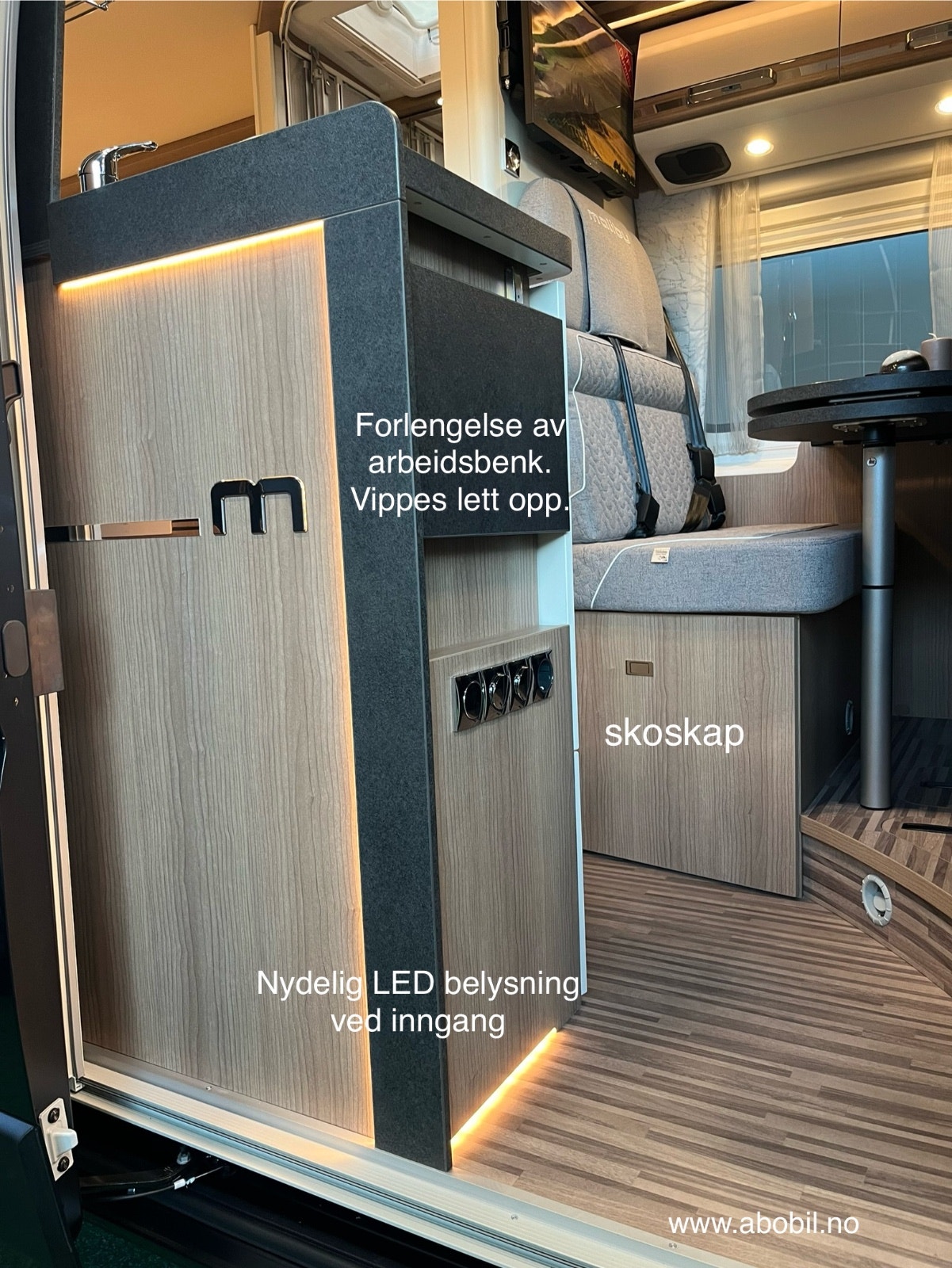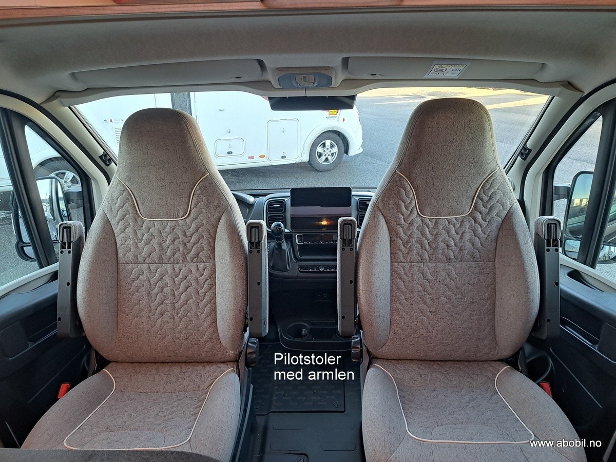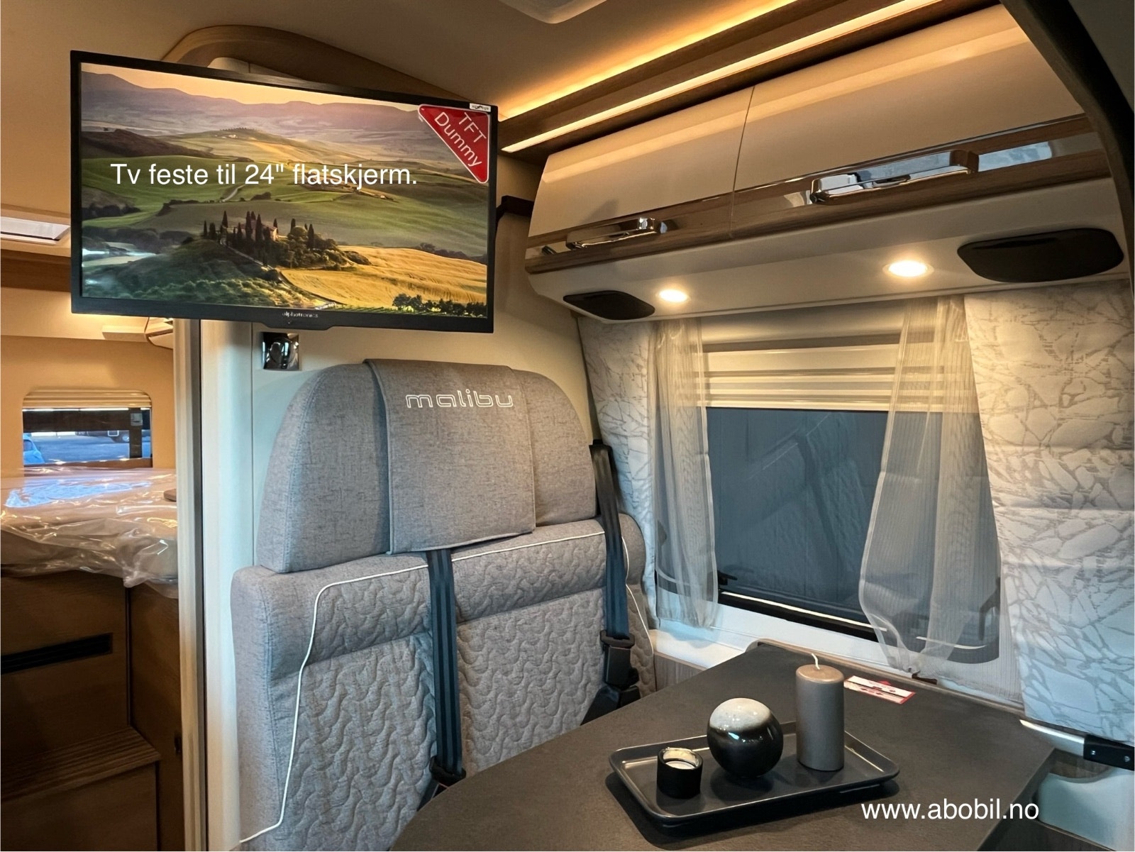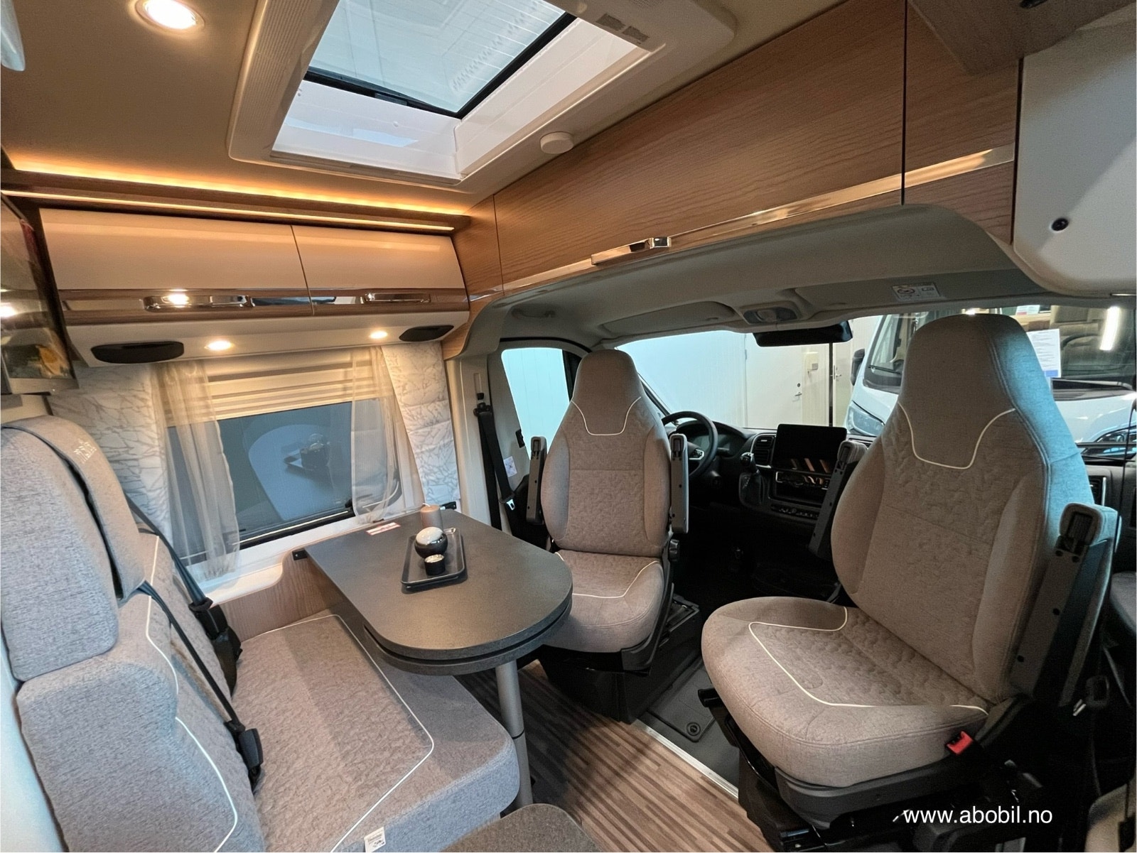 Den kompakte sittegruppen rommer komfortabelt fire personer, med svingbare førerseter som er perfekt integrert i designet. Bodelsbordet har en uttrekkbar funksjon for å utvide bordplaten. Det finnes praktisk oppbevaringsrom i dobbeltgulvet under sittegruppen, med enkel tilgang takket være ett-grepstilgang. Elegant inngangsområde med Malibu-branding i krom og indirekte markeringsbelysning gir en luksuriøs følelse. Ambientebelysning kan styres uavhengig av arbeidslyset, og det finnes en stor takluke Midi Heki over sittegruppen for ekstra lys og luft. Mulighet for vegghengt flatskjerm på 24