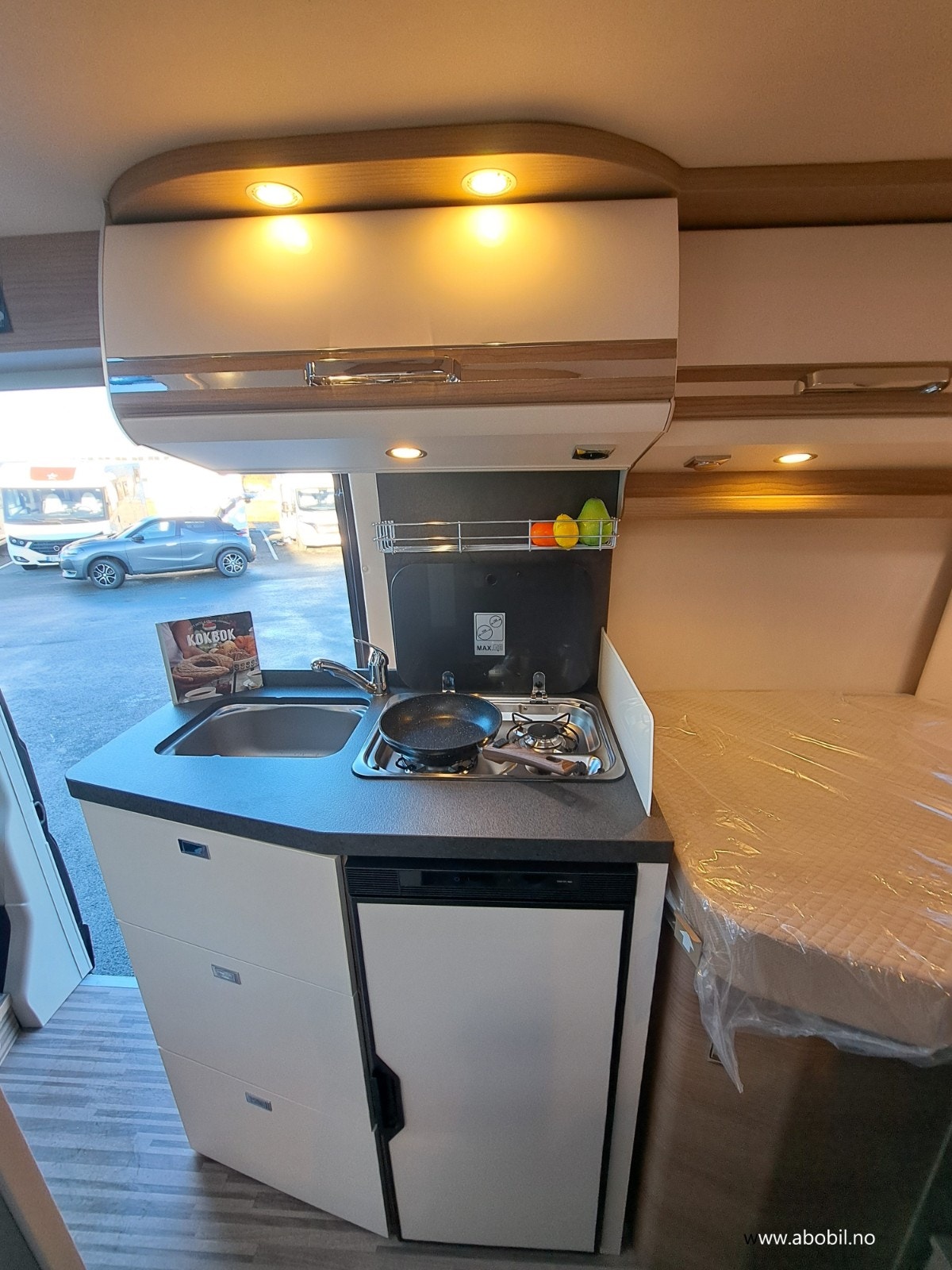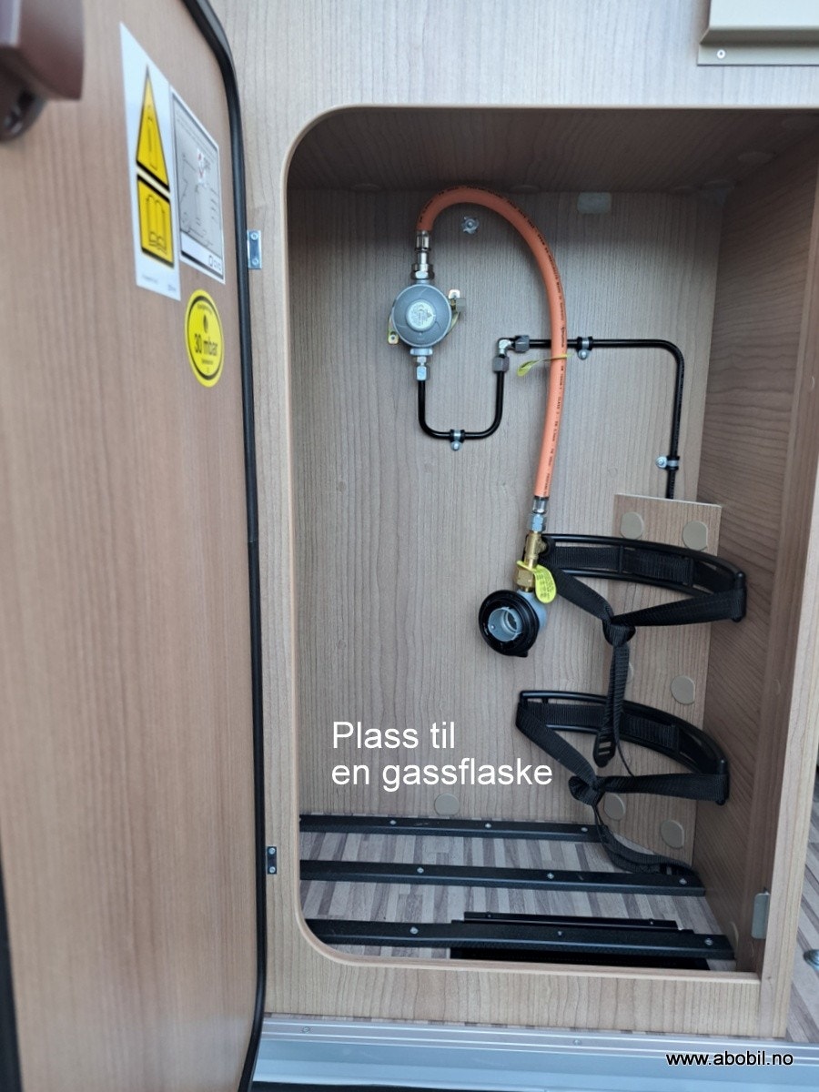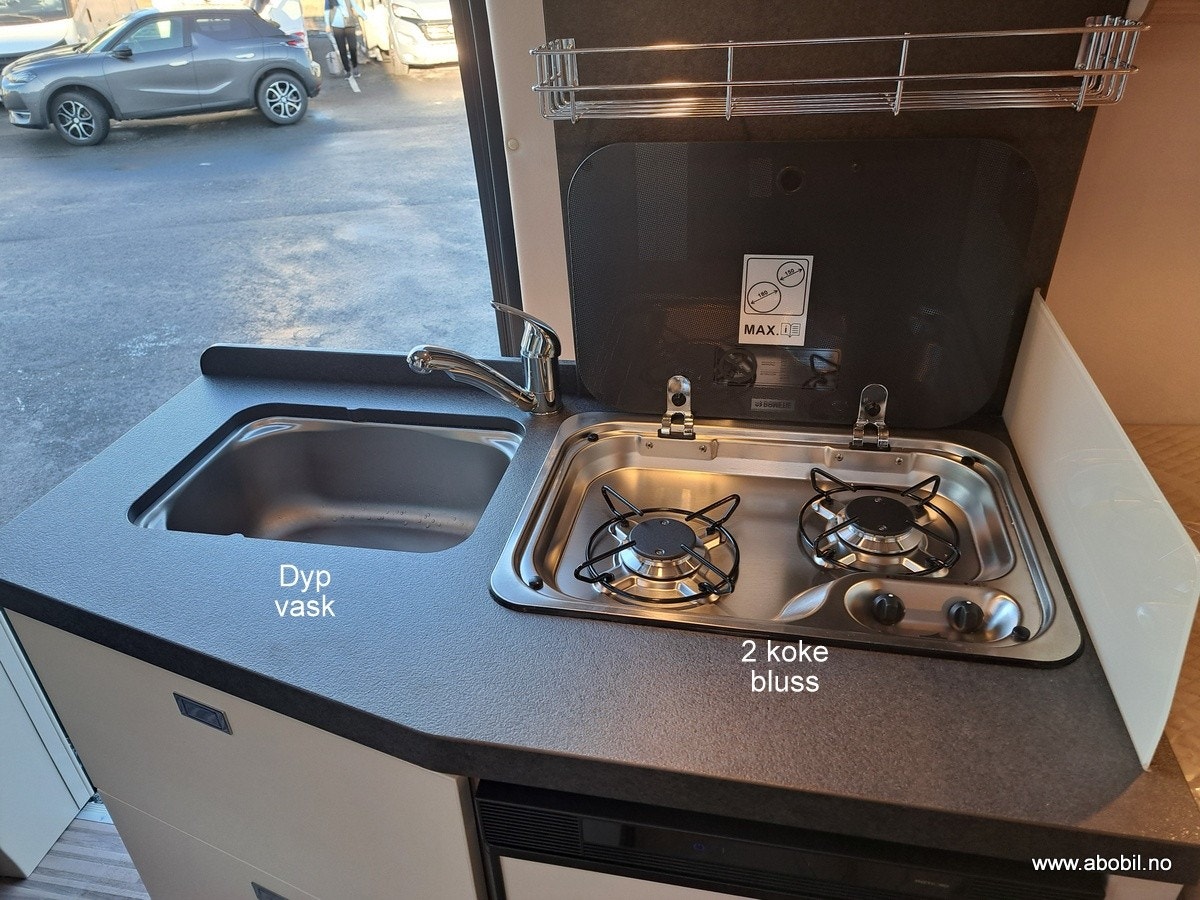 Bobilen har et utvidet arbeidsområde på kjøkkenet, inkludert en stor kjøkkenbenk og et multifunksjonelt deksel over oppvaskkummen. Den har et kraftig 84L kompressorkjøleskap, lett tilgjengelig takket være et one-level-gulv som gir enkel tilgang til både kjøkken og baderom. Tre brede rullelagrede kjøkkenskuffer med softclose, dobbelt lås og integrert bestikkinnsats av tre gir både funksjonalitet og orden. Gasskomfyr med to bluss og elektrisk tenner, samt et praktisk glasslokk. Stor oppbevaringsskuff for matvarer gir rikelig plass til alt du trenger på veien.
