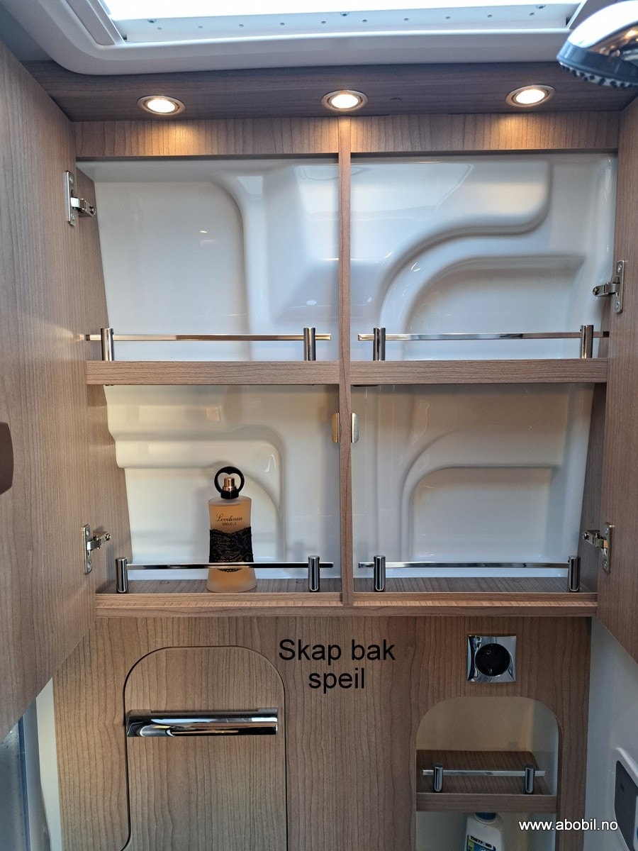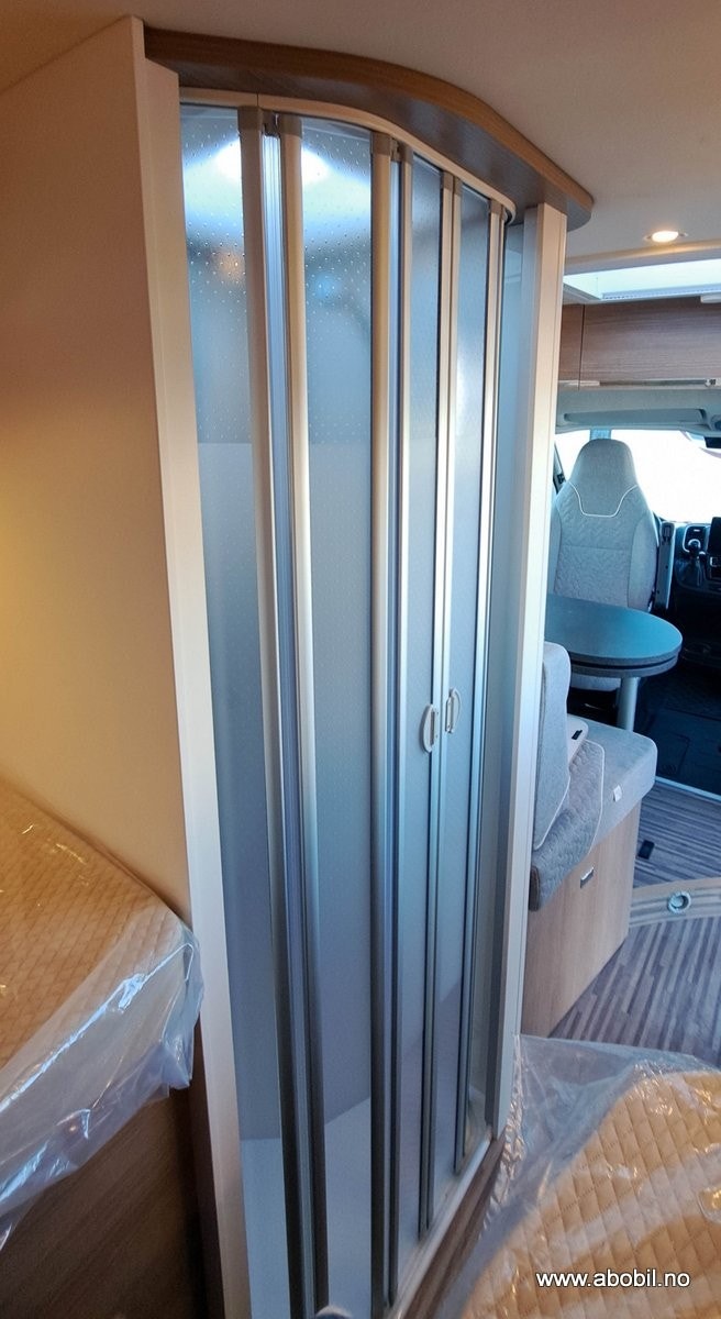 Bobilen har et kompakt og funksjonelt bad, med et svingbart og uttrekkbart toalett og en plassbesparende vaskeservant som kan foldes ut ved behov. Dusjen er utstyrt med en stabil skyvedør som kan separeres fullstendig, slik at du får en romslig dusjopplevelse uten at resten av badet blir vått. Alle funksjonene i badet er lett tilgjengelige med ett håndgrep.