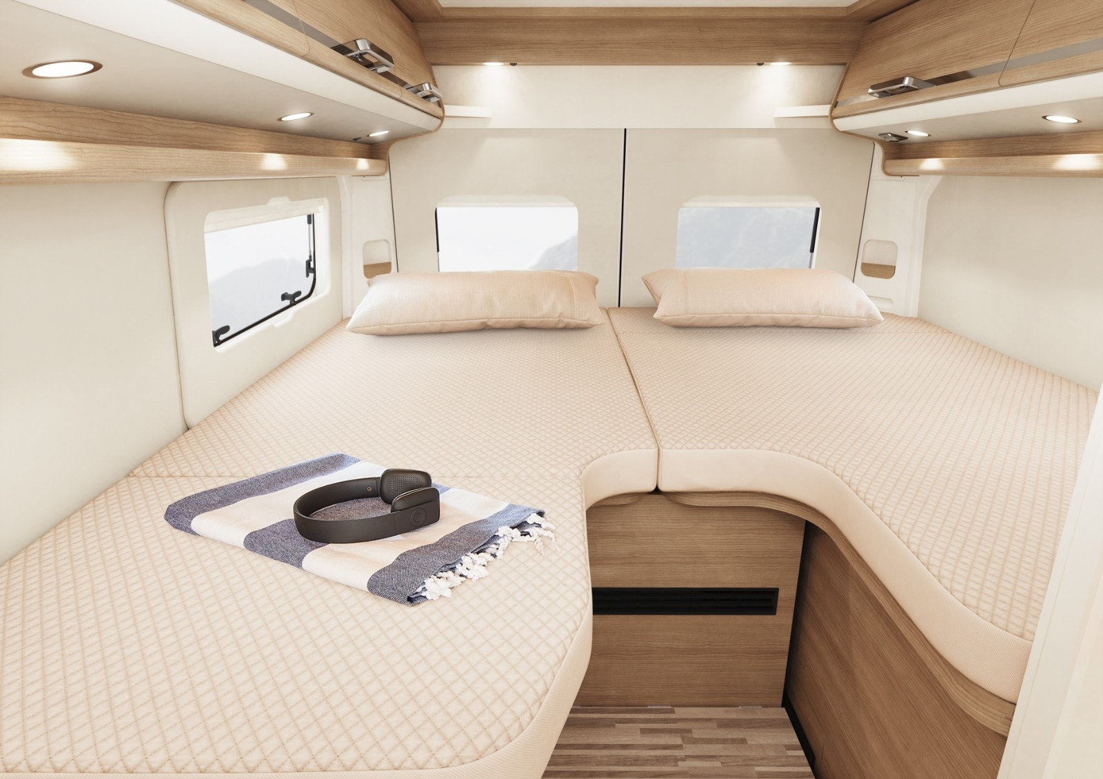 Soveløsningen består av to langsgående enkeltsenger med ventilert sengebunn og kvalitets madrass for maksimal komfort. For oppbevaring er det et stort klesskap under den langsgående enkeltsengen på passasjersiden. Lagringsrommet/skapet er lett tilgjengelig både ovenfra og forfra, takket være en hevefunksjon og separat madrassdel. Det finne også et stort sengetøysskap under sengen på førersiden, lett tilgjengelig ovenfra med «Ett grepsåpning». For annen oppbevaring finnes også overskap med åpne hjørnehyller.