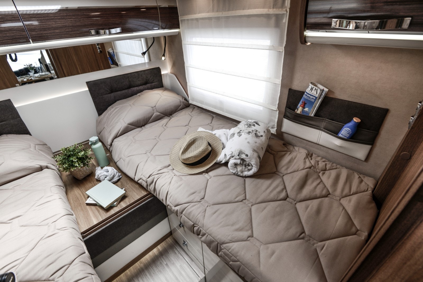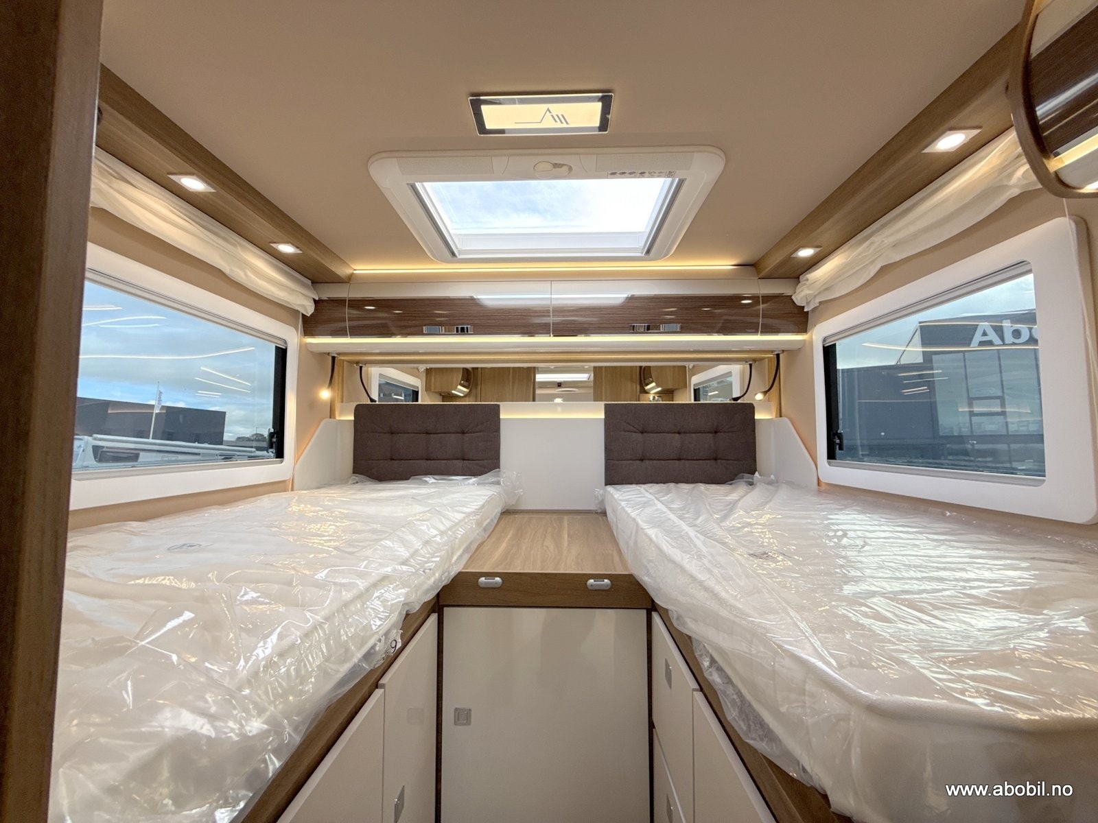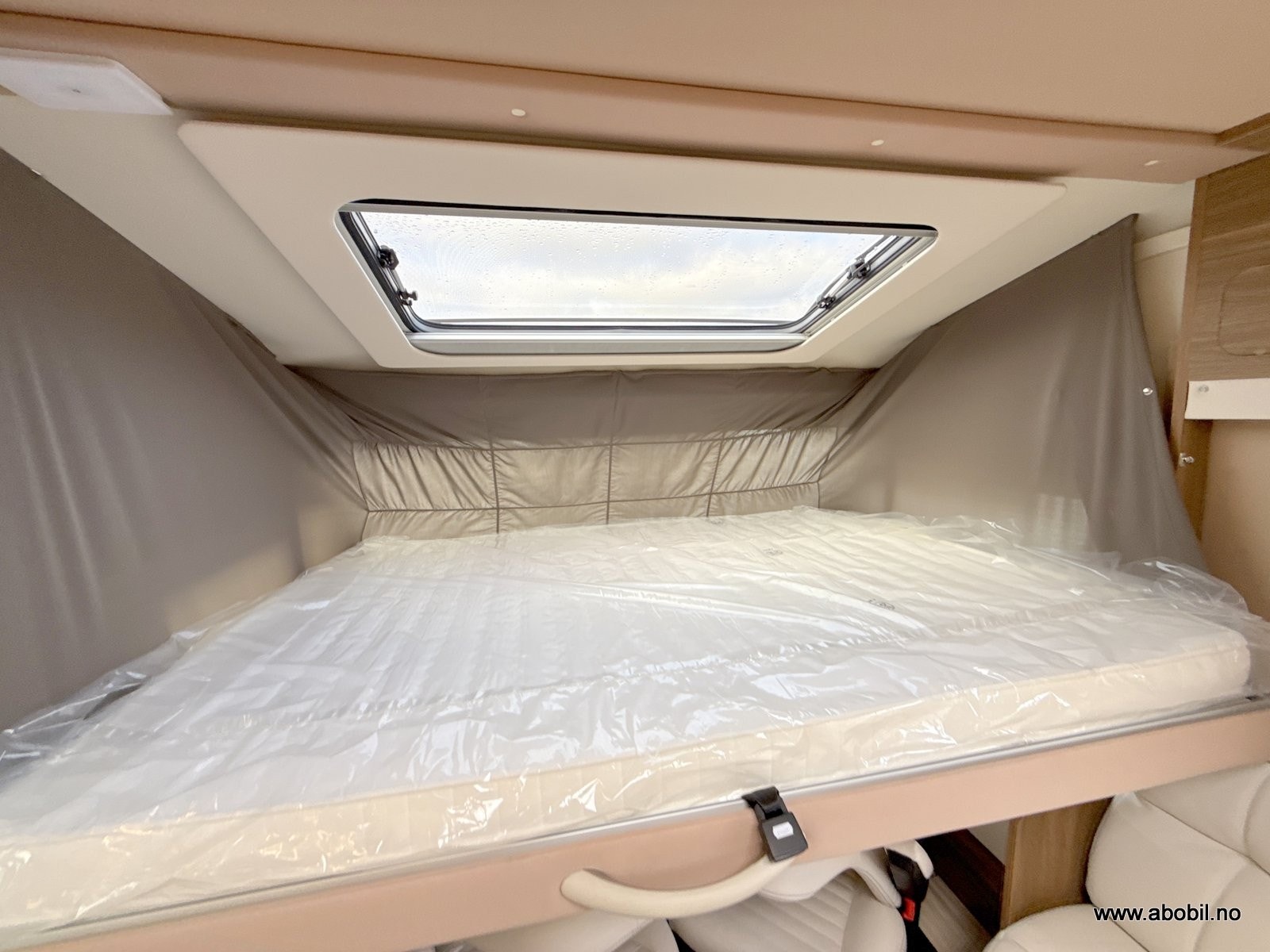 Soverom bak: To enkeltsenger (195 x 83 cm og 191 x 83 cm) som enkelt kan omgjøres til en stor dobbeltseng med en ekstra madrass. Ekstra stor takluke 96*66 cm med myggnetting og blending. Gode lademuligheter for mobiltelefon etc.