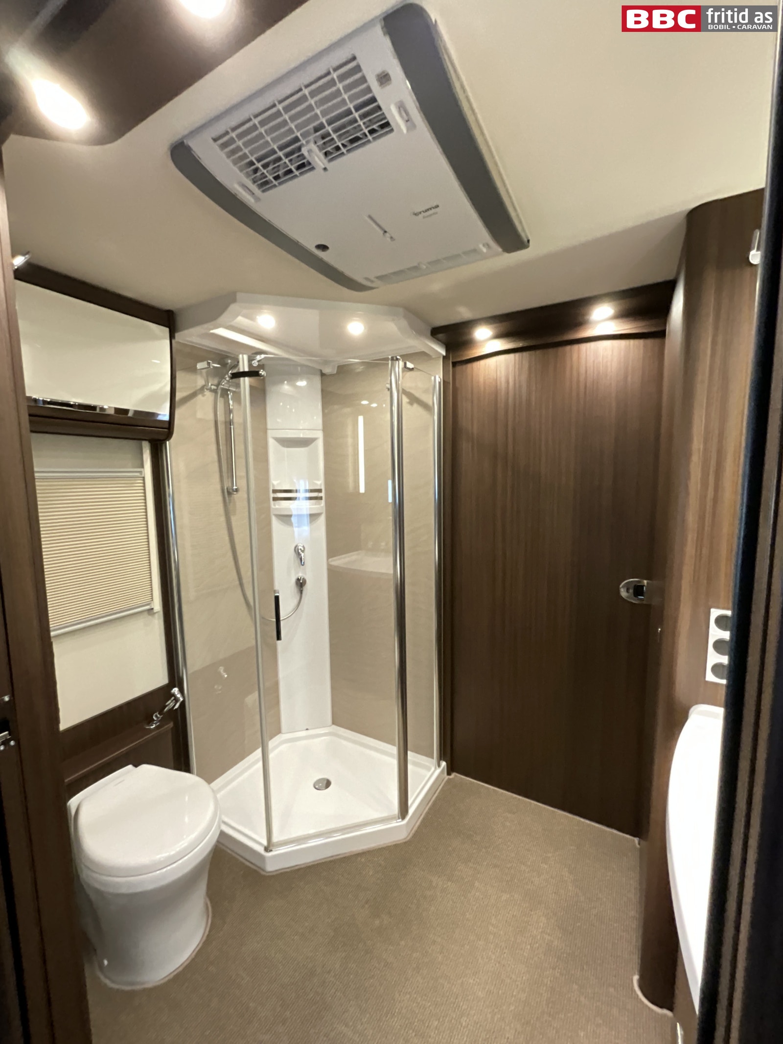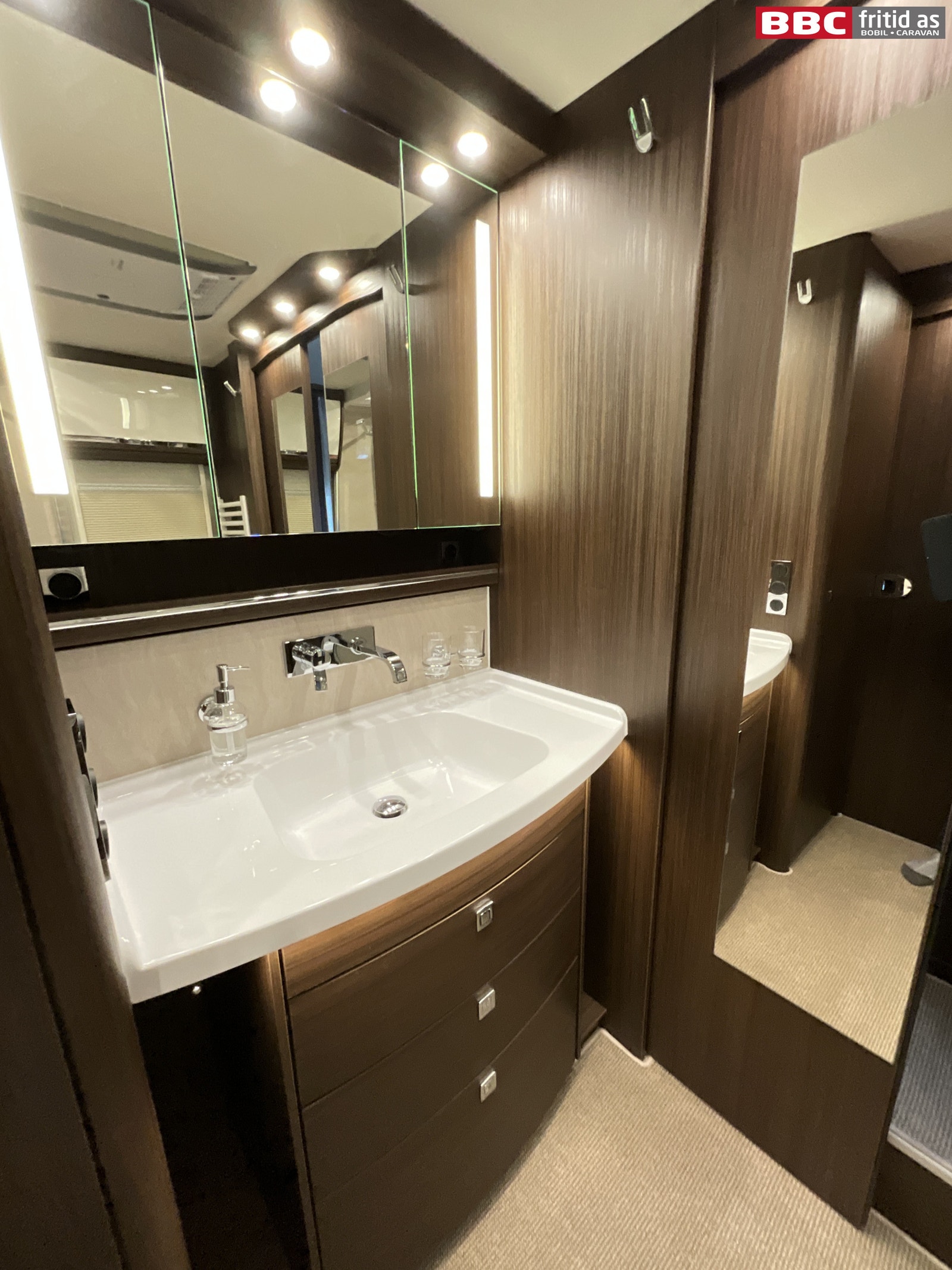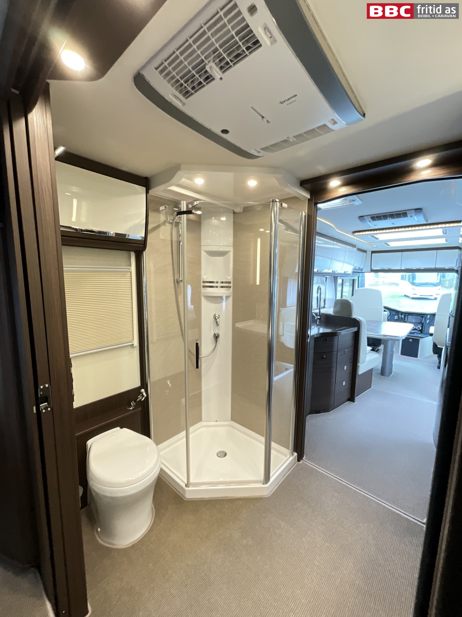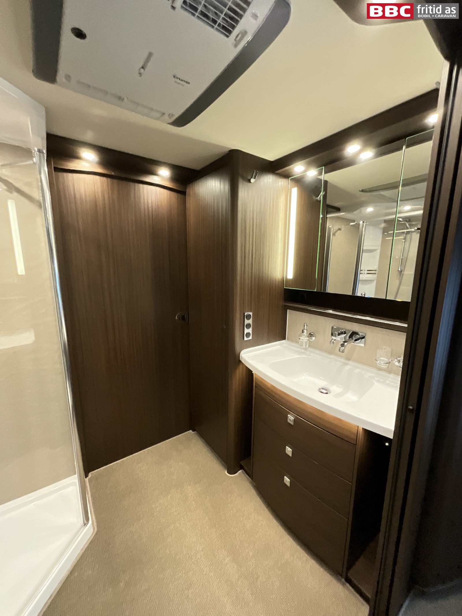 Stort bad med dusj og wc på den ene siden av bilen, og vask, skuffer, overskap og høyskap på den andre siden. Stenger du skyvedørene mot både stue og soverom har du fortsatt veldig god plass inne på badet. WC er en porselenskål med skikkelig avløp. Håndkletørker ved siden av WC er vannbåren. Badet har 4 overskap, 3 skuffer, høyskap/garderobeskap på ca 200 x 60 cm, 8 taklys, 2 stk 230V-uttak, og en Truma Aventa Aaircondition som er beregnet for bad og soverom. (Det er også en helt lik Aircondition i stuetaket). Dusjen er meget romslig, og har glassvegger og glassdør.