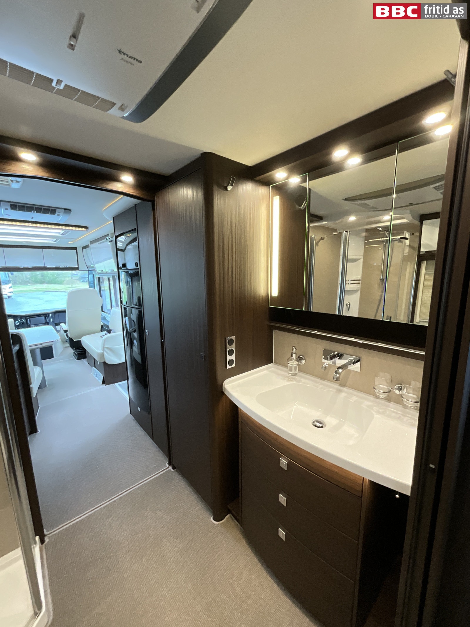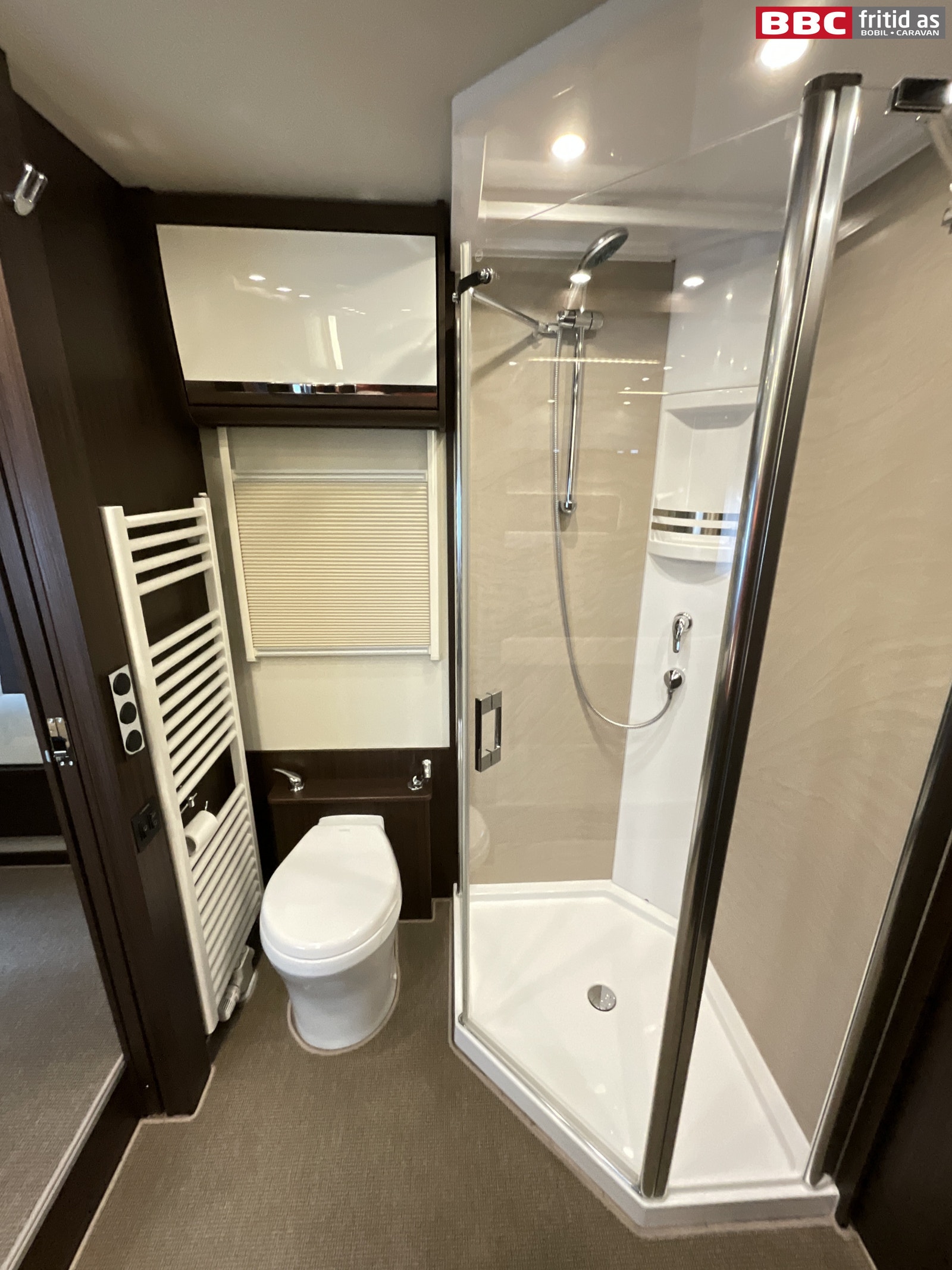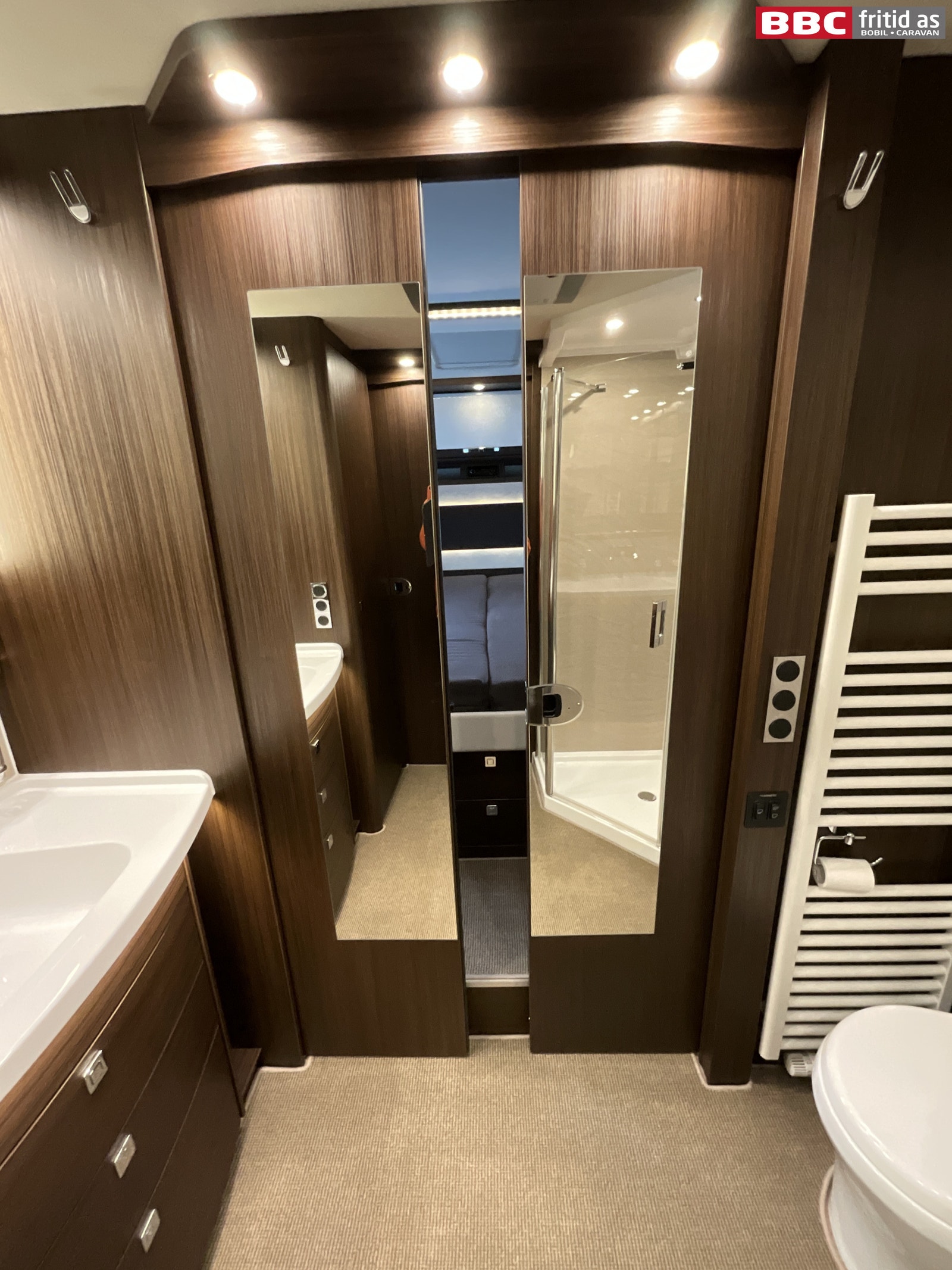 Stort bad med dusj og wc på den ene siden av bilen, og vask, skuffer, overskap og høyskap på den andre siden. Stenger du skyvedørene mot både stue og soverom har du fortsatt veldig god plass inne på badet. WC er en porselenskål med skikkelig avløp. Håndkletørker ved siden av WC er vannbåren. Badet har 4 overskap, 3 skuffer, høyskap/garderobeskap på ca 200 x 60 cm, 8 taklys, 2 stk 230V-uttak, og en Truma Aventa Aaircondition som er beregnet for bad og soverom. (Det er også en helt lik Aircondition i stuetaket). Dusjen er meget romslig, og har glassvegger og glassdør.