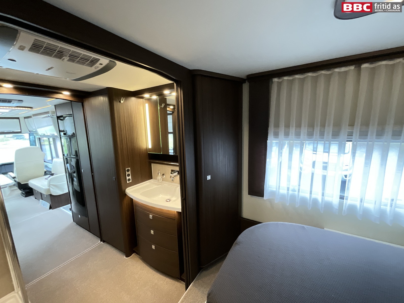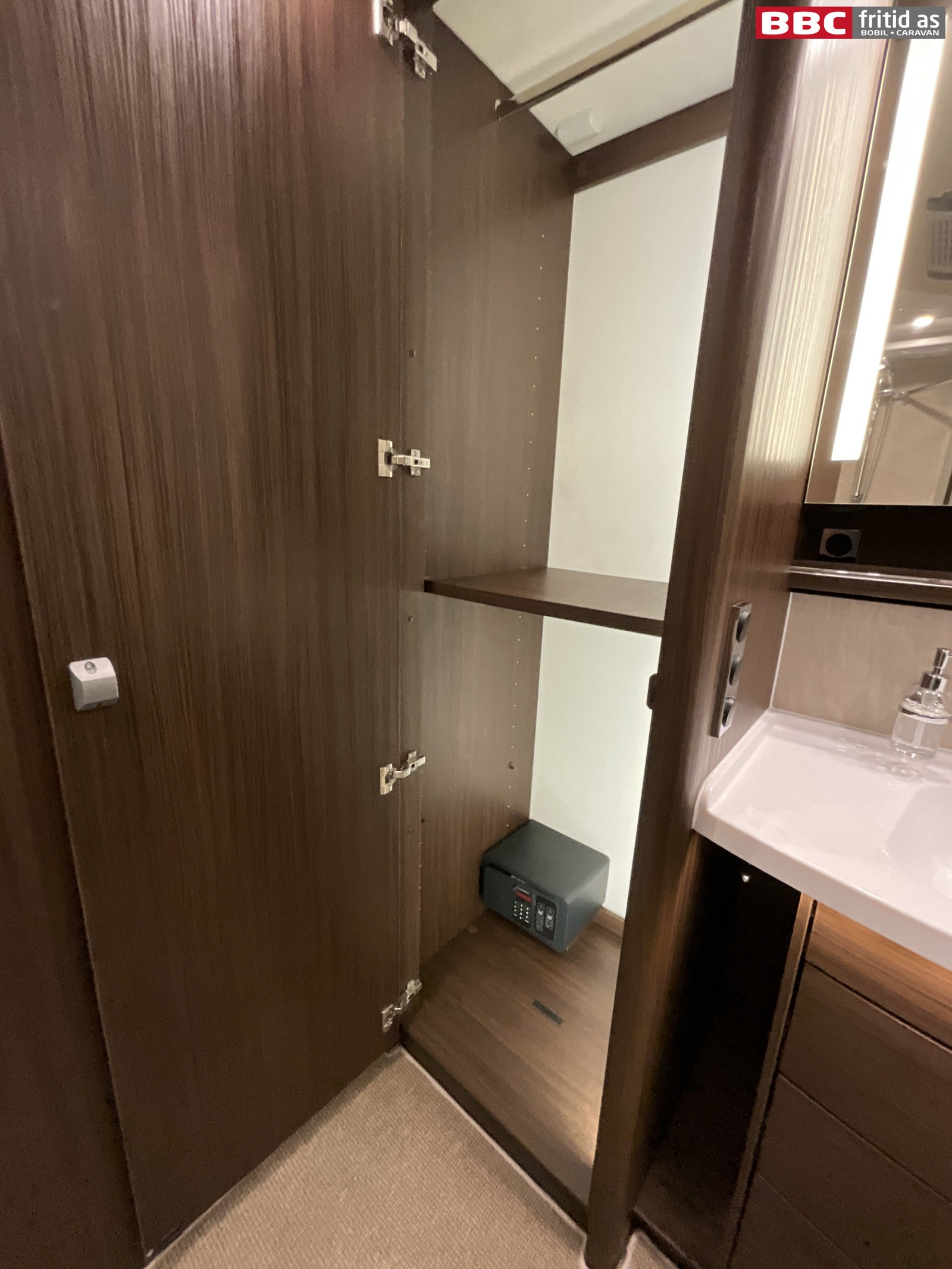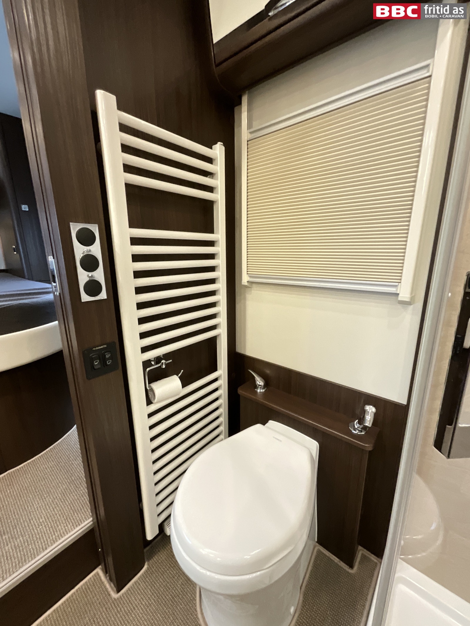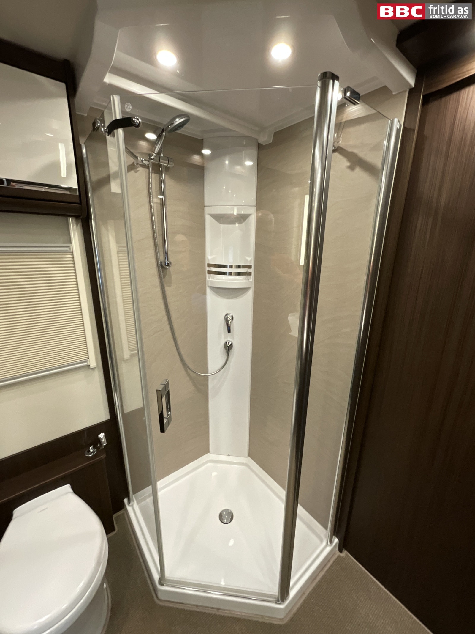 Stort bad med dusj og wc på den ene siden av bilen, og vask, skuffer, overskap og høyskap på den andre siden. Stenger du skyvedørene mot både stue og soverom har du fortsatt veldig god plass inne på badet. WC er en porselenskål med skikkelig avløp. Håndkletørker ved siden av WC er vannbåren. Badet har 4 overskap, 3 skuffer, høyskap/garderobeskap på ca 200 x 60 cm, 8 taklys, 2 stk 230V-uttak, og en Truma Aventa Aaircondition som er beregnet for bad og soverom. (Det er også en helt lik Aircondition i stuetaket). Dusjen er meget romslig, og har glassvegger og glassdør.