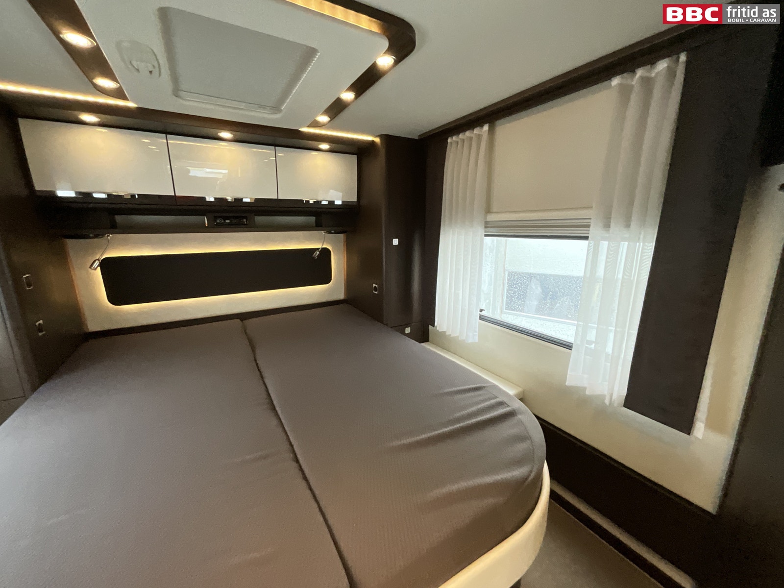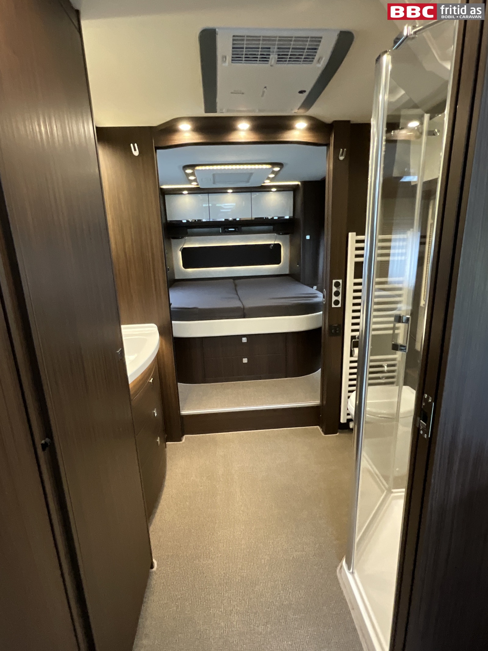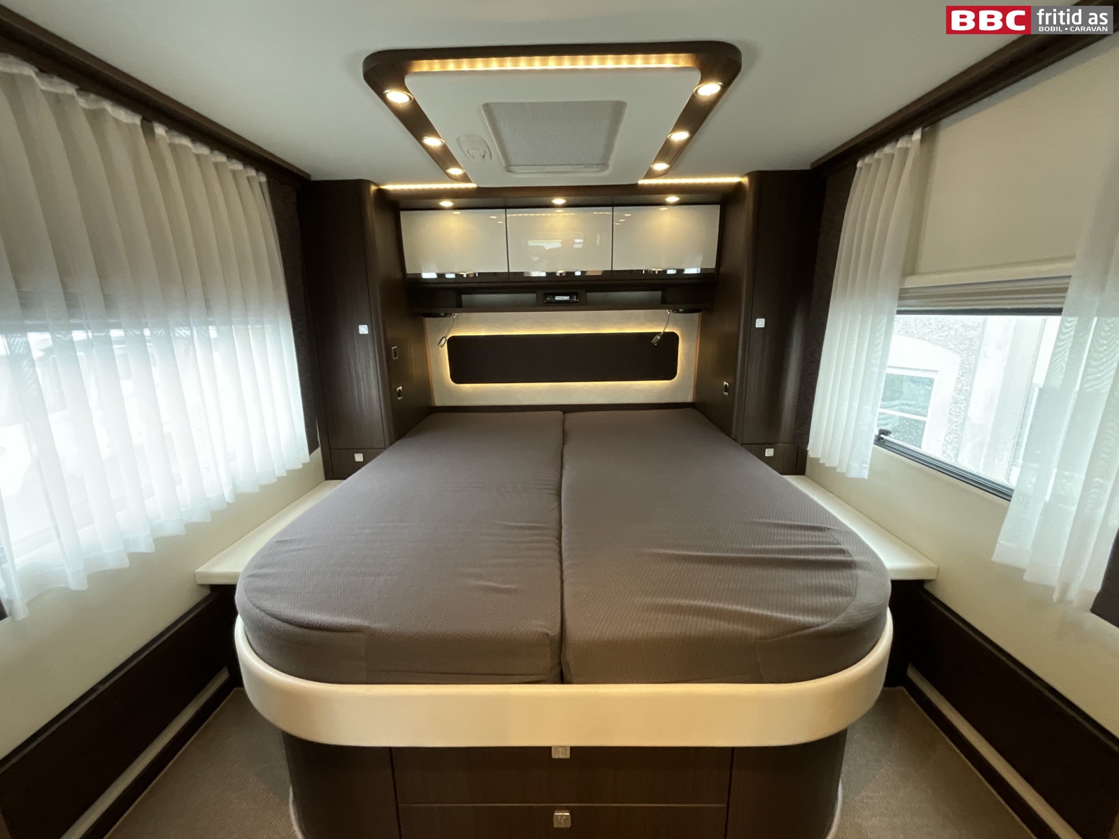 Bakerst i bilen er det en stor midtstilt dobbeltseng på 200 x 160 cm. 2 skuffer under sengen i fotenden. I rommet er det også 3 overskap, 2 hjørneskap på hhv 130 x 40 og 170 x 40 cm med masse hyller. 2 stk sideskap i hodeenden på 110 x 30 cm. Egen Alphatronic TV på 22" som kan sees fra sengen. 2 leselys, 6 taklys, led-striper innfeldt, 2 stk 230V-uttak og en takluke på 70 x 50 cm. Dobbel skyvedør inn mot bad/dusj.