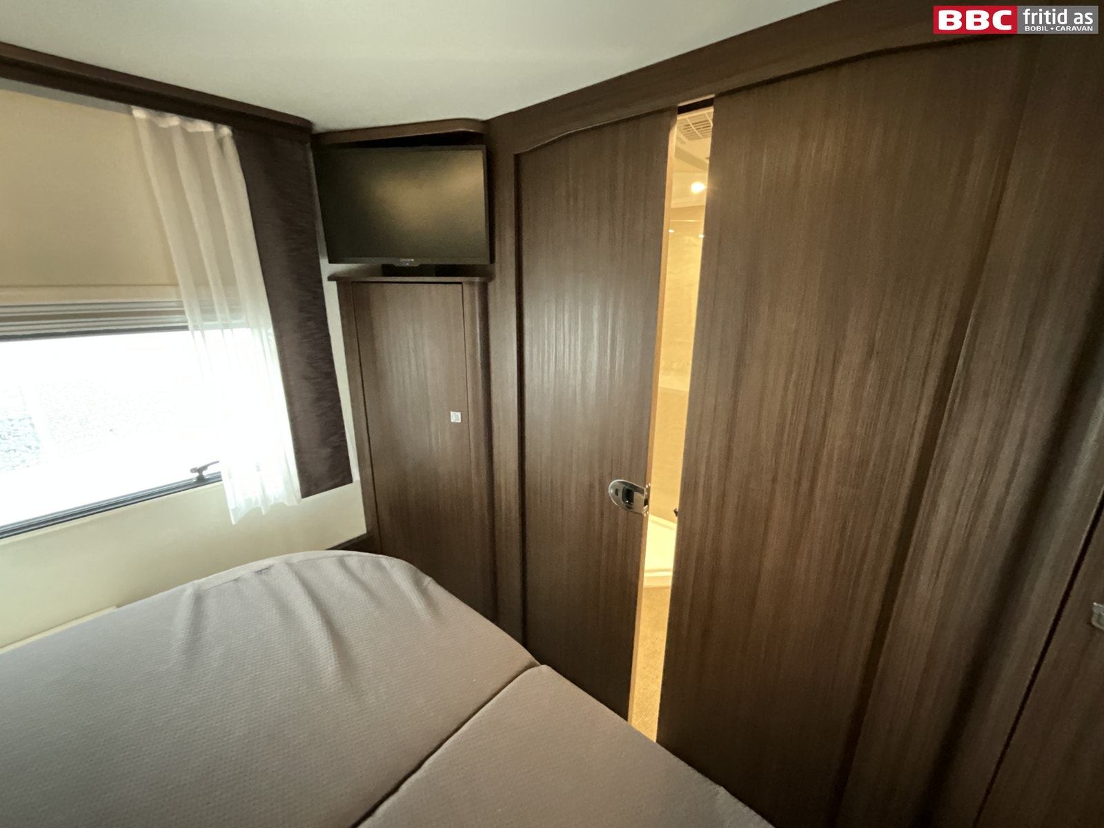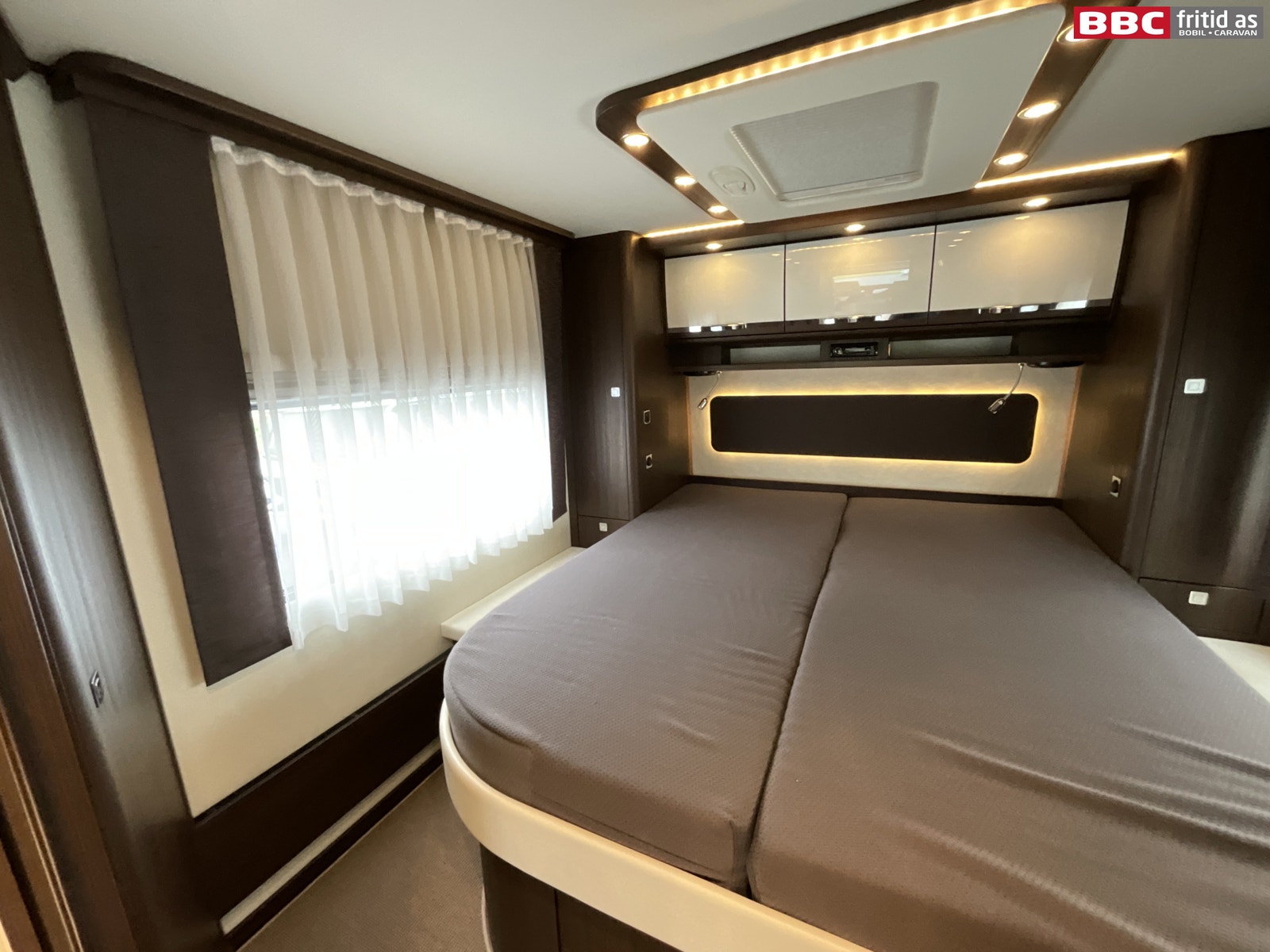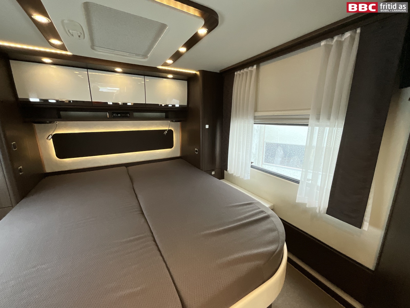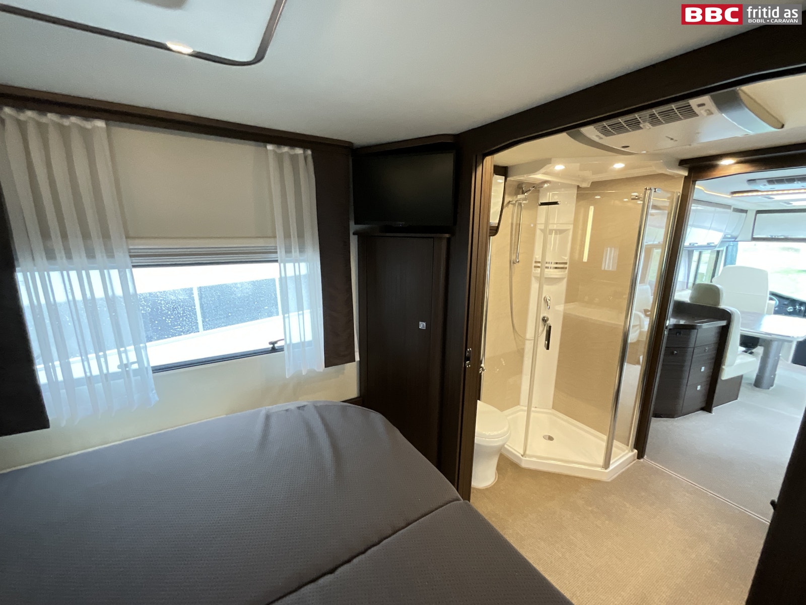 Bakerst i bilen er det en stor midtstilt dobbeltseng på 200 x 160 cm. 2 skuffer under sengen i fotenden. I rommet er det også 3 overskap, 2 hjørneskap på hhv 130 x 40 og 170 x 40 cm med masse hyller. 2 stk sideskap i hodeenden på 110 x 30 cm. Egen Alphatronic TV på 22" som kan sees fra sengen. 2 leselys, 6 taklys, led-striper innfeldt, 2 stk 230V-uttak og en takluke på 70 x 50 cm. Dobbel skyvedør inn mot bad/dusj.