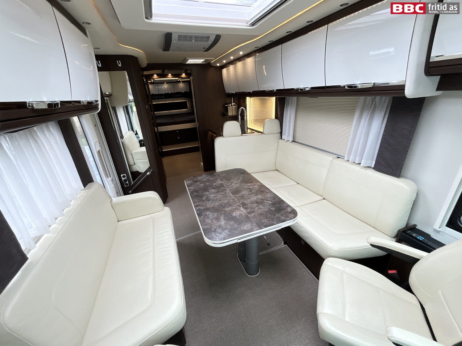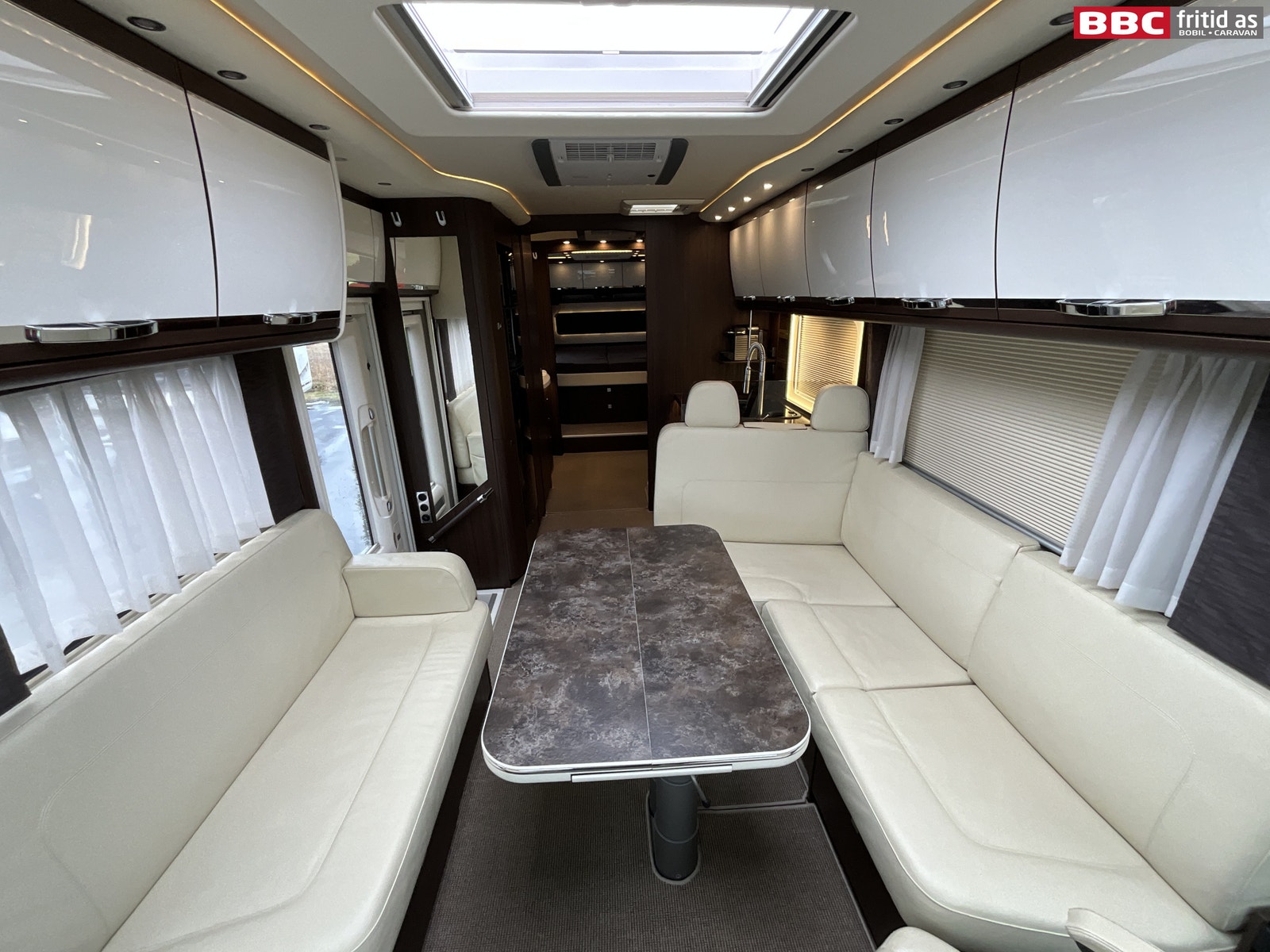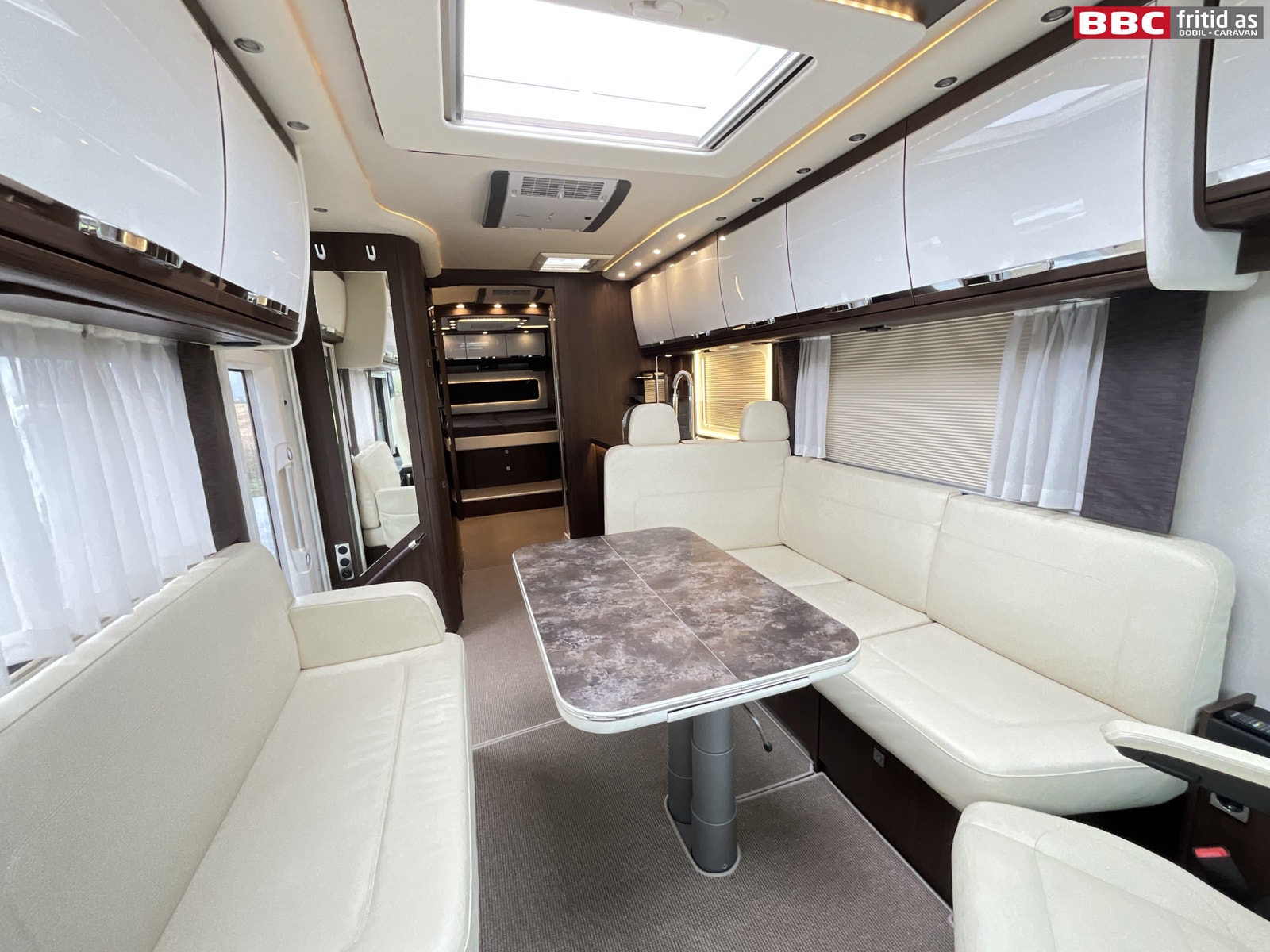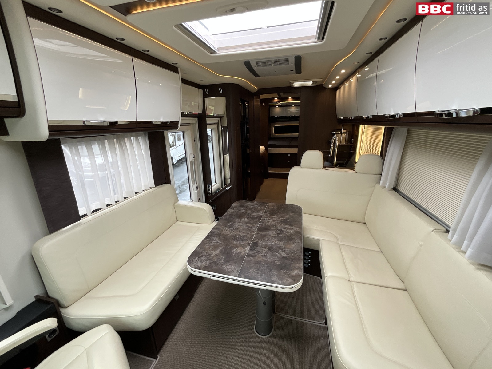 Stor og veldig romslig salonggruppe i skinn, med 2 sofaer på hhv 110 og 150 cm og et høyde-justerbart bord på hele 104 x 67 cm (kan utvides til 104 x 97 cm). Bordet kan også forskyves til alle sider ved behov. Det er hele 10 overskap med masse plass. I og med at bilen er uten senkeseng gir dette en utrolig god romfølelse i salonggruppen. 7 personer kan sitte samtidig rundt bordet. 3 skuffer under sofaene og 2 stk 230V-uttak. Belysningen består av totalt 27 lyspunkter, og kan dimmes etter eget ønske. 2 lys under overskapene er det også. I taket er det 2 store takluker på 80 x 55 cm lysåpning. Originale formsydde tepper i hele bilen, vindu i bodelsdøren og myggdør som kan brukes på varme dager. En Alphatronics 32" TV med elektrisk heis som kommer ned fra overskapene. TV er koblet mot en helautomatisk parabolantenne på taket. I taket mellom stue/kjøkken er det også en Truma Aventa aircondition. Stort speil innenfor bodelsdøren på ca 30 x 130 cm.