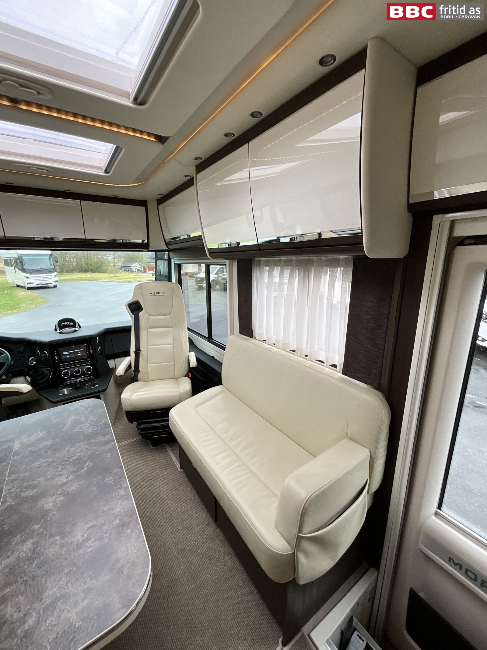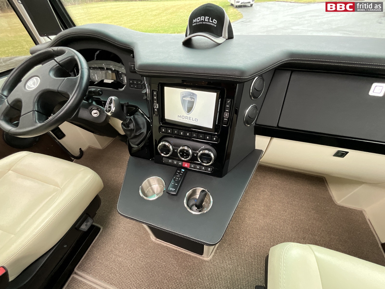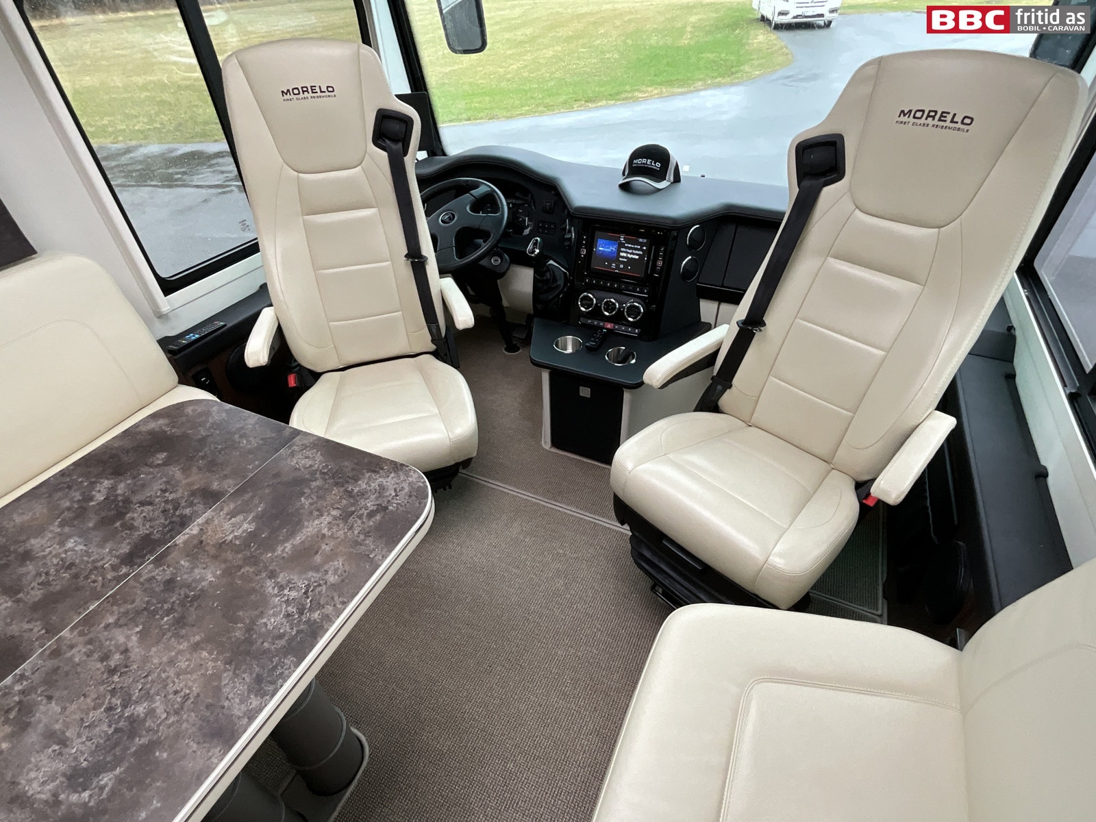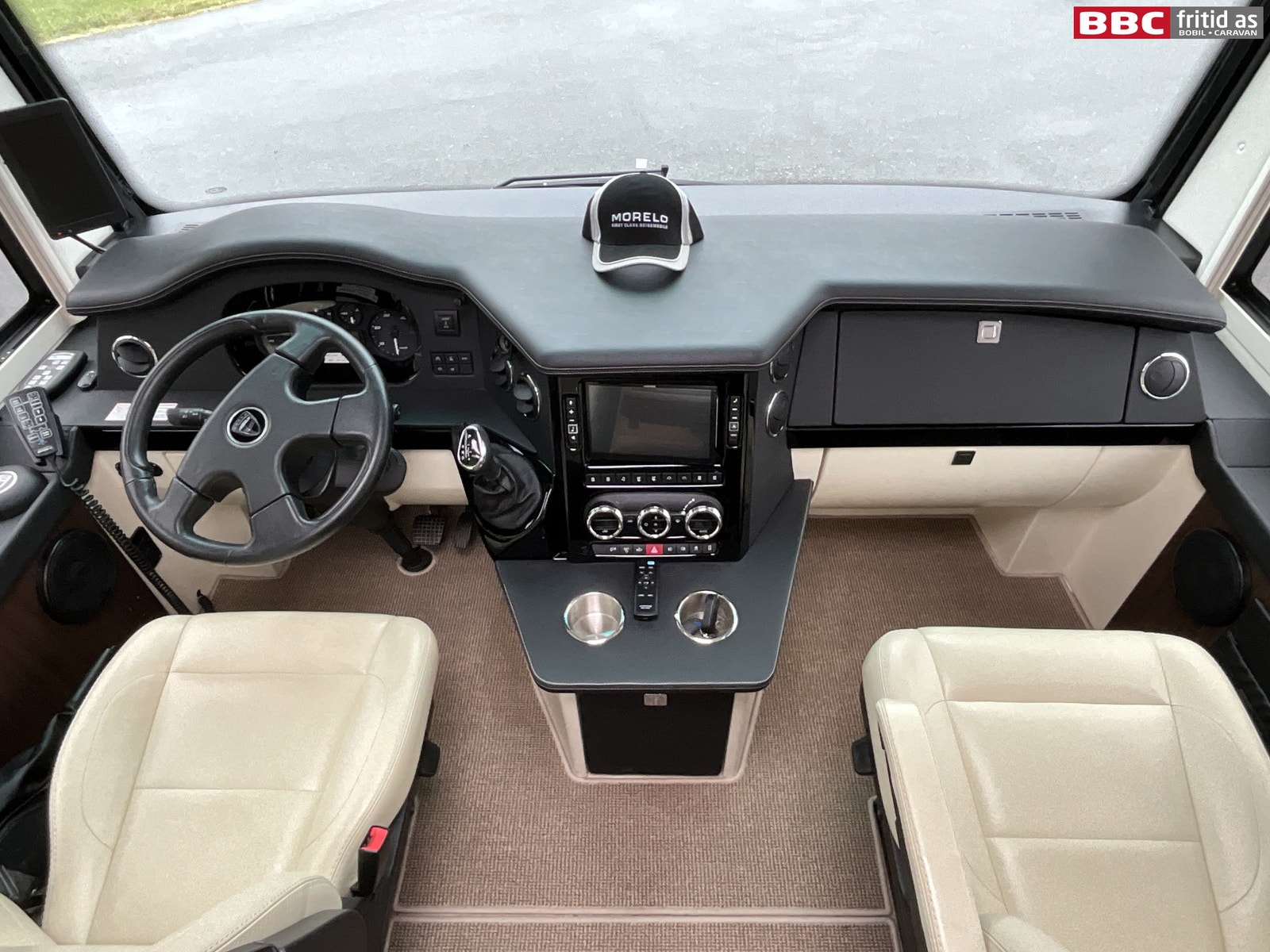 Fremme i bilen har du 2 flotte vendbare fremseter som er fantastisk å sitte i. Med Morelo sin store frontrute har du en enestående utsikt fremover. Det er et Alpina multimedia-anlegg med DAB+, Bluetooth og handsfree. Navigasjon og ryggekamera det også i samme enhet. Elektrisk gardin i frontruten + manuelle nedrekk på siderutene. Rattet kan taes av når du har parkert for dagen.