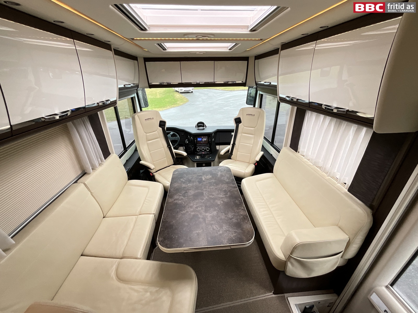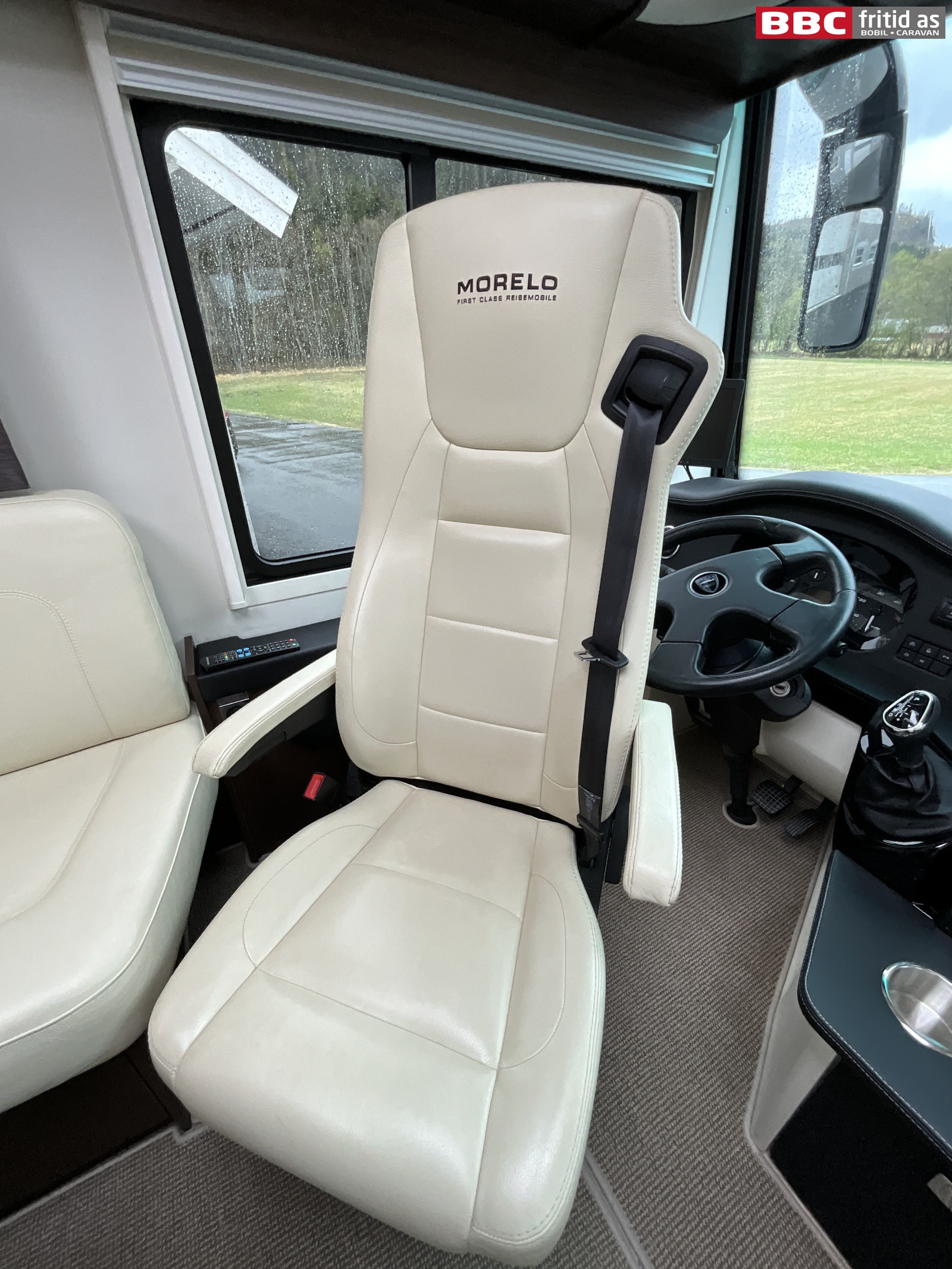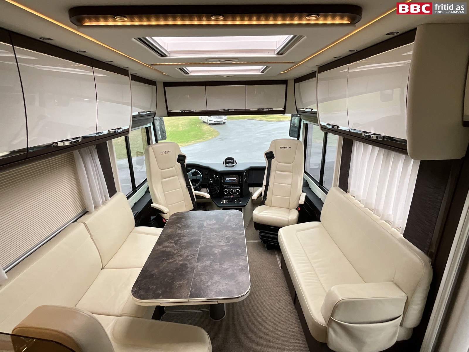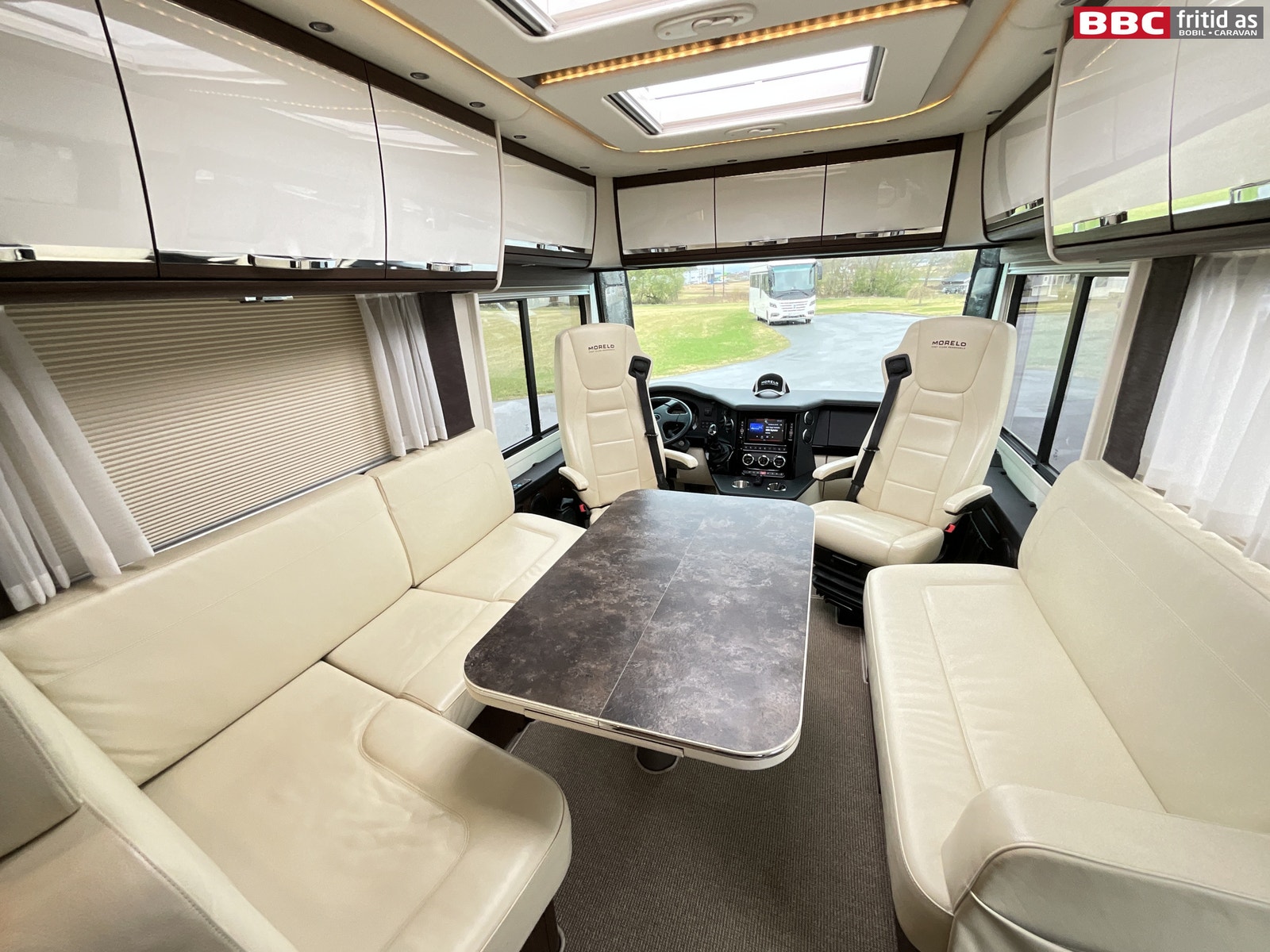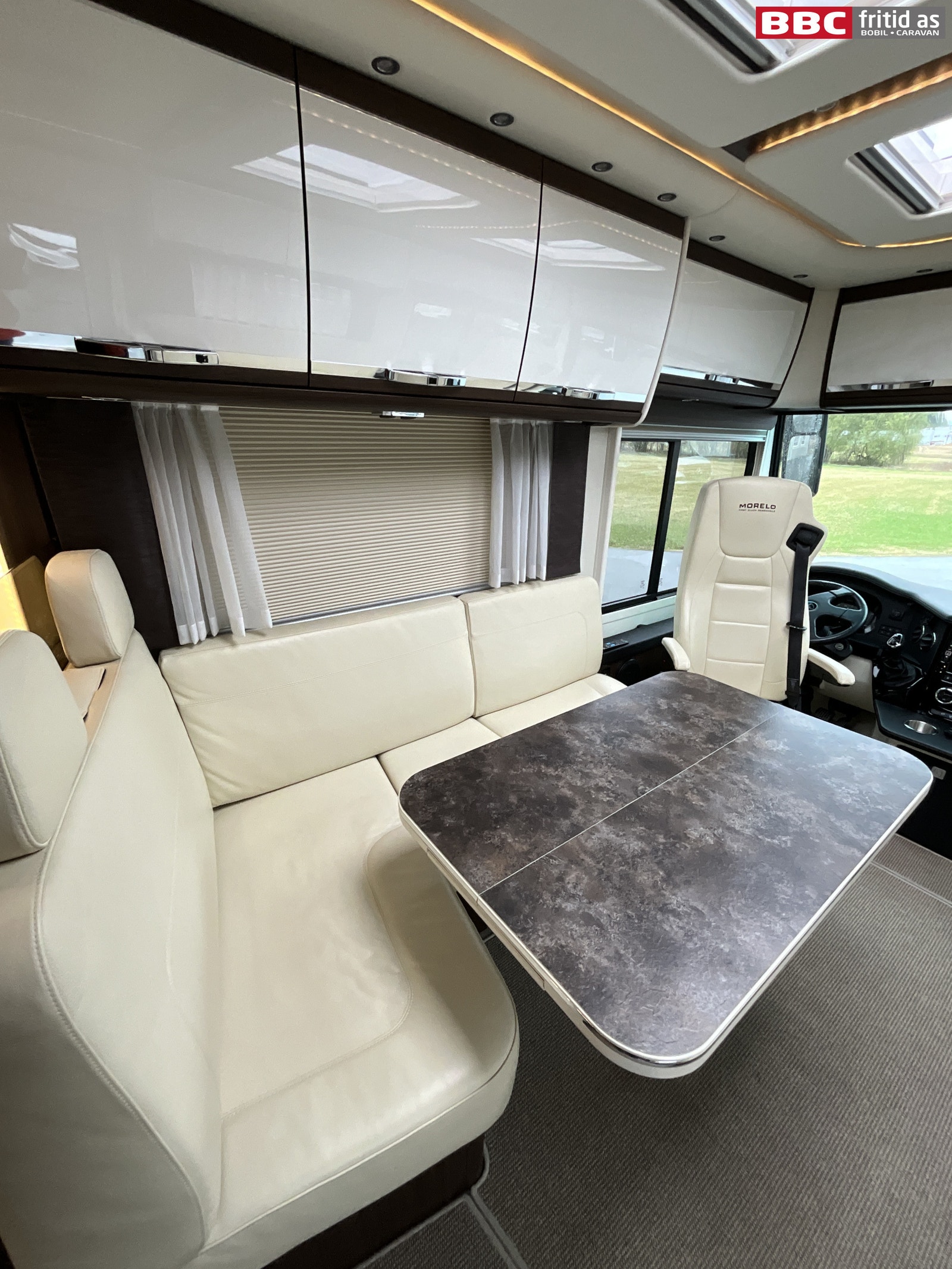Fremme i bilen har du 2 flotte vendbare fremseter som er fantastisk å sitte i. Med Morelo sin store frontrute har du en enestående utsikt fremover. Det er et Alpina multimedia-anlegg med DAB+, Bluetooth og handsfree. Navigasjon og ryggekamera det også i samme enhet. Elektrisk gardin i frontruten + manuelle nedrekk på siderutene. Rattet kan taes av når du har parkert for dagen.