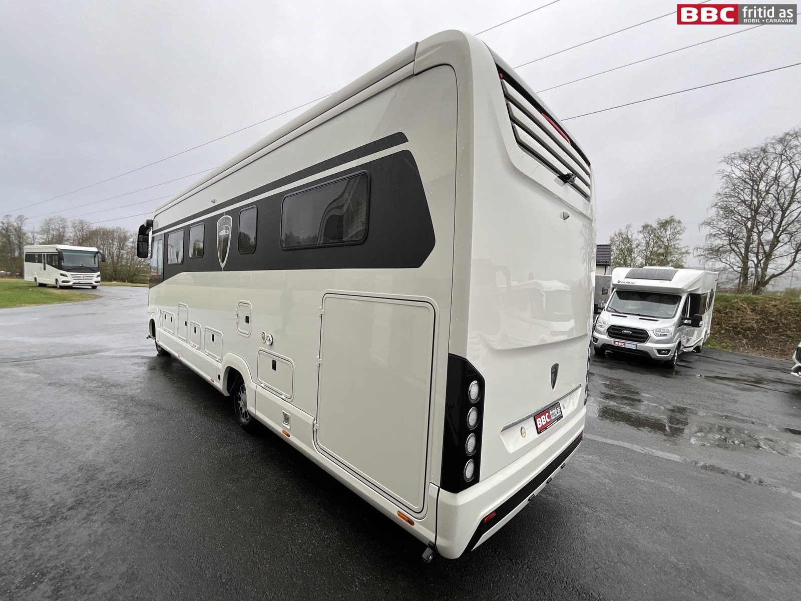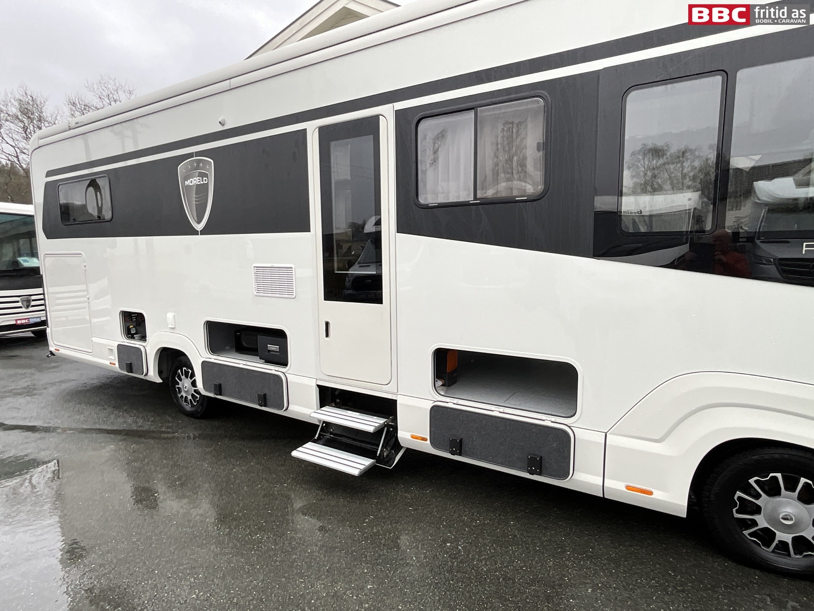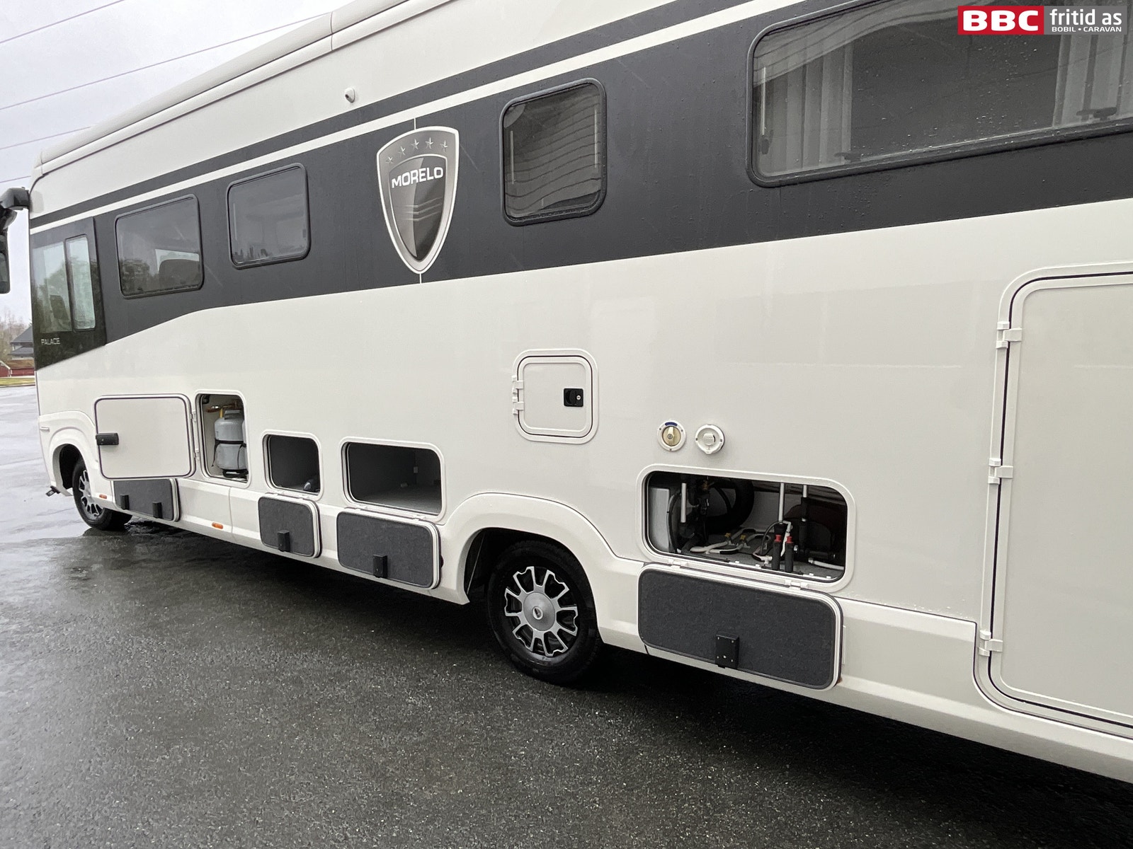 Bilen har en 6 meter Thule elektrisk markise, stort lasterom bak i bilen, og flere mindre lasterom på høyre og venstre side. I det ene lasterommet ved bodelsdøren er det plassert en egen kjøleskuff og microbølgeovn. På taket er det 2 stk solcellepanel, 2 stk aircondition og en helautomatisk parabolantenne. Fremme i fronten er det montert en kraftig LED-bar som gir veldig godt lys. Utedusj er det også inne i den ene lasteluken. Under bilen er det E&P hydrauliske støttebein. Disse kan styres både fra et styringspanel og fjernkontroll. Elektrisk stigtrinn under bodelsdøren.