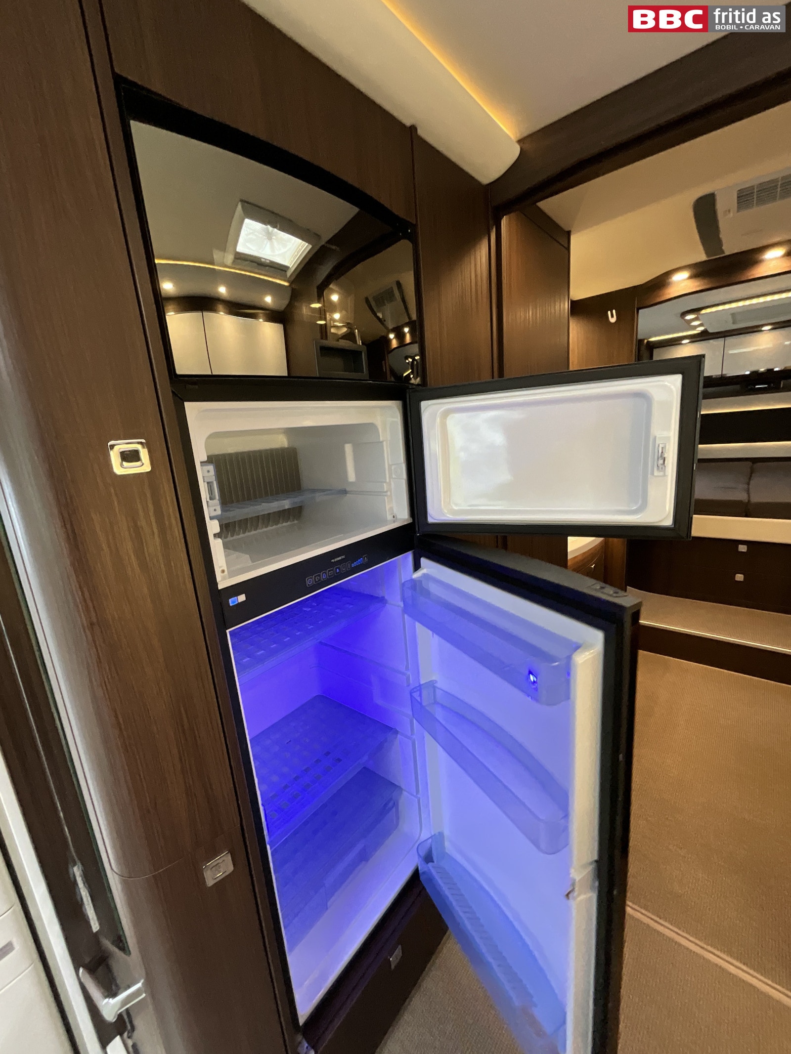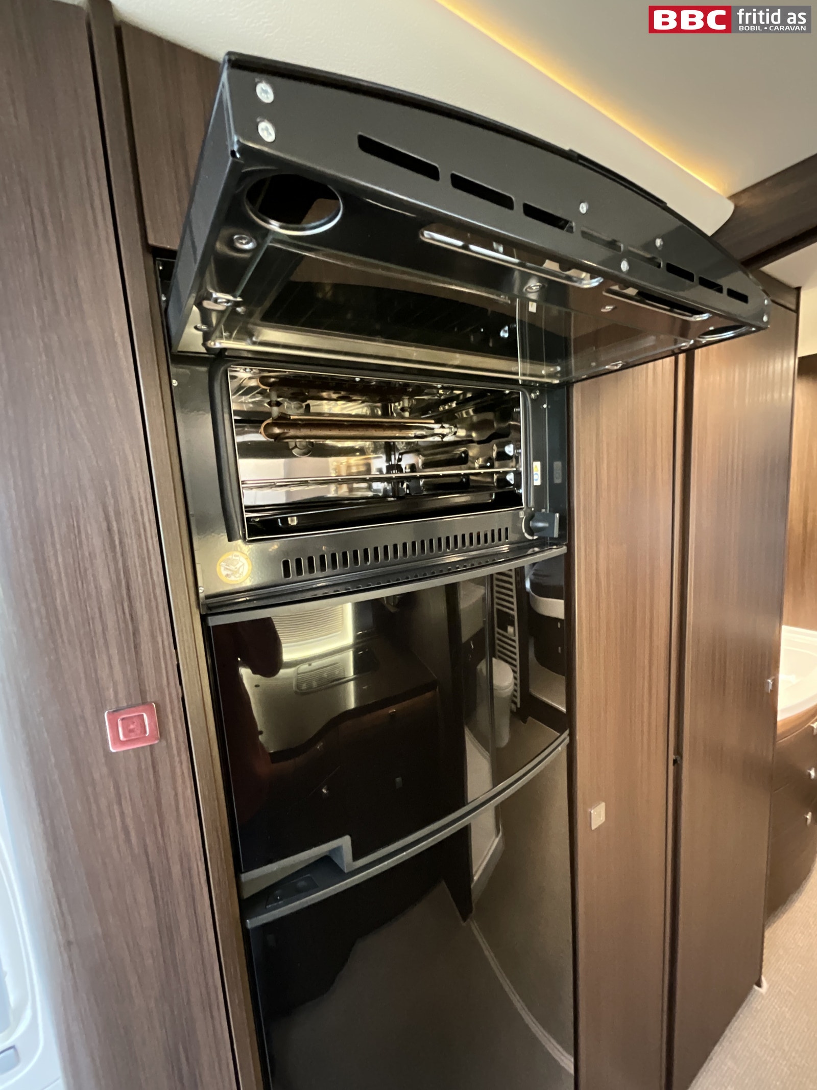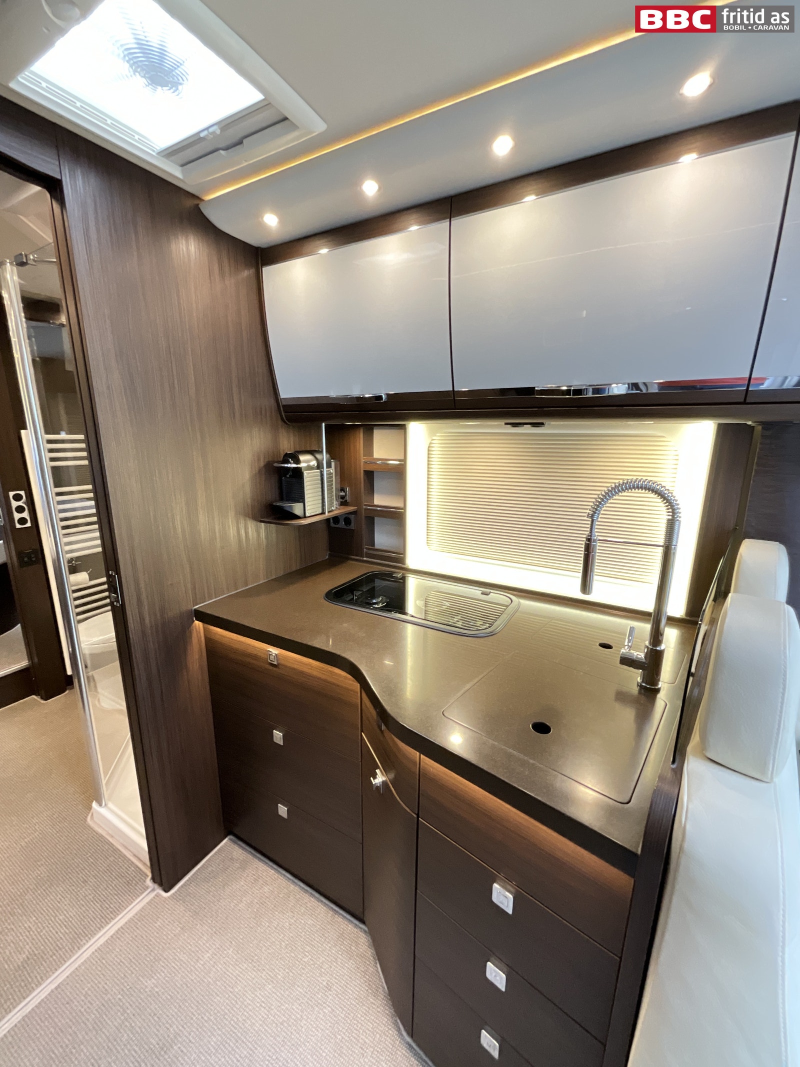 Her er det en kjøkkenbenk med masse plass. 3 kokebluss, vask, 2 overskap, 9 skuffer og 3 hyller. Nespresso kaffemaskin på egen hylle over kjøkkenbenken + 3 stk 230V-uttak. 3 lyspunkter over benken, 4 taklys, 2 uttrekk-skap med hyller og et høyskap (garderobeskap) ved siden av kjøleskapet på ca 200 x 30 cm. Kjøleskapet et et stort Dometic med separat fryseboks + stekeovn på toppen. I taket er det en 12V takvifte som kan kjøre luft både inn og ut etter behov. Skyvedør inn mot bade/soverom.