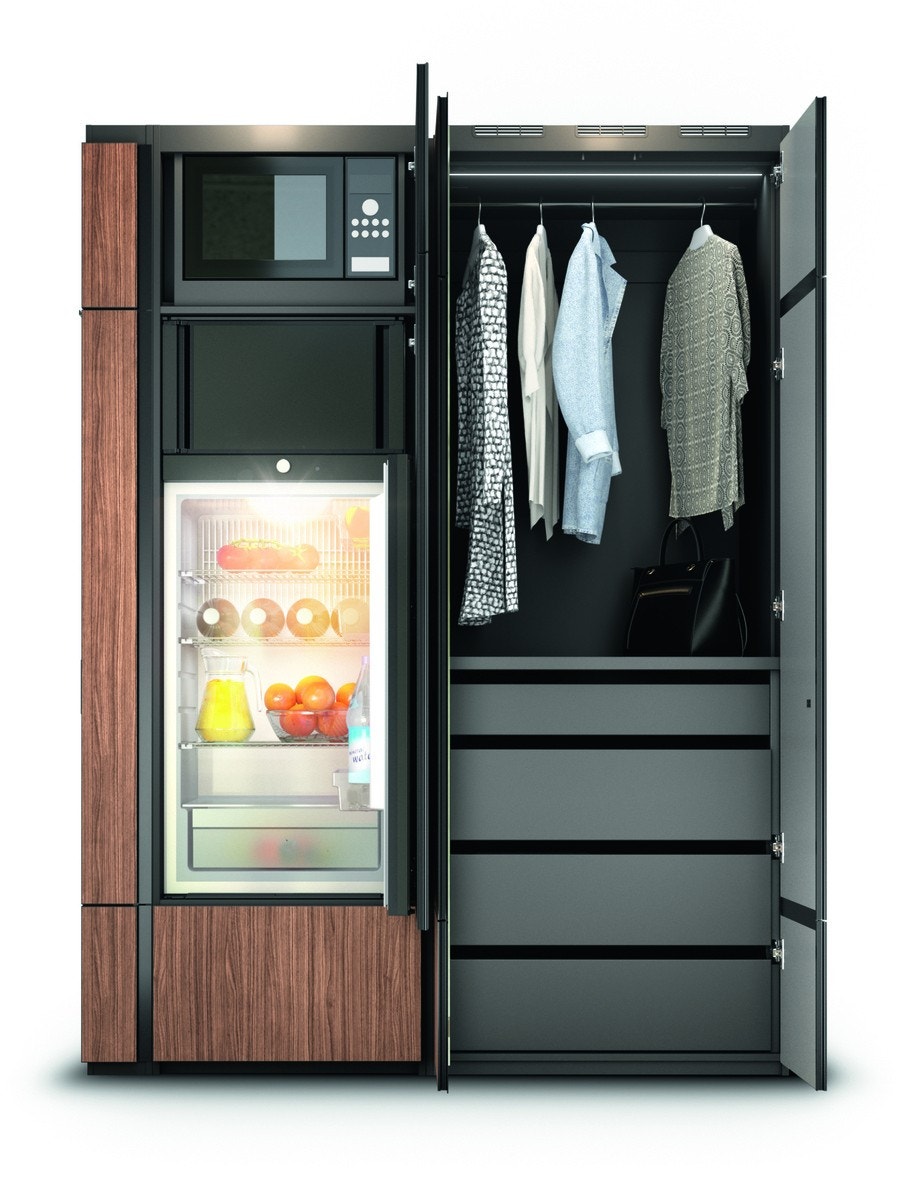 Sentrallås av skuffer, garderobe og glassdør.