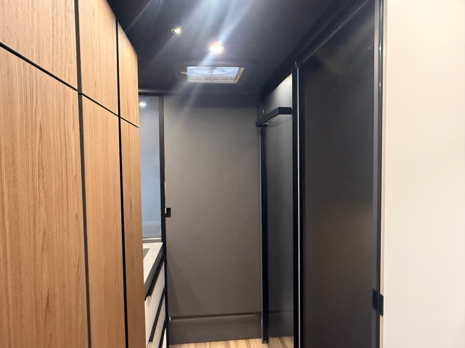 Skyvedør mellom bad og soverom samt mellom bad og oppholdsrom. Skyvedør mellom bad og oppholdsrom har soft-close funksjon.