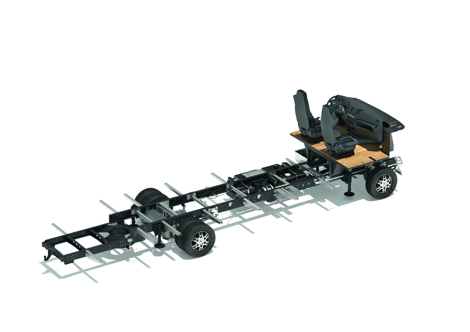 − Full pneumatisk fjæring med løfte- og senkeinnretning og automatisk nivellering
